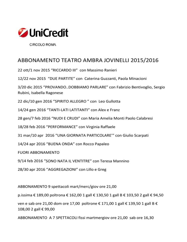 ABBONAMENTO TEA TEATRO AMBRA JOVINELLII 201 2015/2016 22 ott/1 nov 2015 “RICCARDO RDO III” con Massimo Ranieri 12/22 nov 2015 “DUE PARTIT RTITE” con Caterina Guzzanti, Paola Mina inacioni 3/20 dic 2015 “PROVANDO..D O..DOBBIAMO PARLARE” con Fabrizio Bentivoglio, Ben Sergio Rubini, Isabella Ragonese 22 dic/10 gen 2016 “SPIRITO ITO ALLEGRO A ” con Leo Gullotta 14/24 gen 2016 “TANTI-LATI ATI LATITANTI” L con Alex e Franz 28 gen/7 feb 2016 “NUDI E CR CRUDI” con Maria Amelia Monti Paolo olo C Calabresi 18/28 feb 2016 “PERFORMAN MANCE” con Virginia Raffaele 31 mar/10 apr 2016 “UNA A GI GIORNATA PARTICOLARE’” con Giulio io Sc Scarpati 14/24 apr 2016 “BUENA OND NDA” con Rocco Papaleo FUORI ABBONAMENTO 9/14 feb 2016 “SONO NATA TA IL VENTITRE” con Teresa Mannino 28/30 apr 2016 “AGGREGAZIO AZIONI” con Lillo e Greg ABBONAMENTO 9 spettacoli coli mart/merc/giov ore 21,00 p.issima € 189,00 poltrona € 162,00 1 gall € 130,50 1 gall B € 103,50 3,50 2 gall € 94,50 ven e sab ore 21,00 dom ore 1 17,00 poltrone € 171,00 1 gall € 139,5 39,50 1 gall B € 108,00 2 gall € 99,00 TTACOLI fissi martmergiov ore 21,00 sab ab o ore 16,30 ABBONAMENTO A 7 SPETTAC p.issima € 147,00 poltrona € 126,00 1 gall € 101,50 1 gall B € 80,50 2 gall € 73,50 ven e sab ore 21,00 dom ore 17,00 poltrona € 133,00 1 gall € 108,50 1 gall B € 84,00 2 gall € 77,00 ABBONAMENTO A 6 SPETTACOLI mart/merc/giov ore 21,00 p.issima € 126,00 poltrone € 108,00 1° gall € 87,00 1 gall B € 69,00 2° gall € 63,00 ven , sab ore 21,00 dom ore 17,00 poltrona € 114,00 1° gall € 93,00 1 gall B € 72,00 2° gall € 66,00 ABBONAMENTO 5 SPETTACOLI mart/merc/giov ore 21,00 p.issim € 105,00 poltrone € 90,00 1° gall €72,50 1 gall B € 57,50 2° gall € 52,50 ven., sab ore 21,00 dom ore 17,00 poltrone € 95,00 1° gall € 77,50 1° GALL B € 60,00 2° gall € 55,00 OPZIONE TERESA MANNINO E LILLO E GREG BIGLIETTI SINGOLI A RIDUZIONE PRENOTAZIONI [email protected]@unicredit.eu