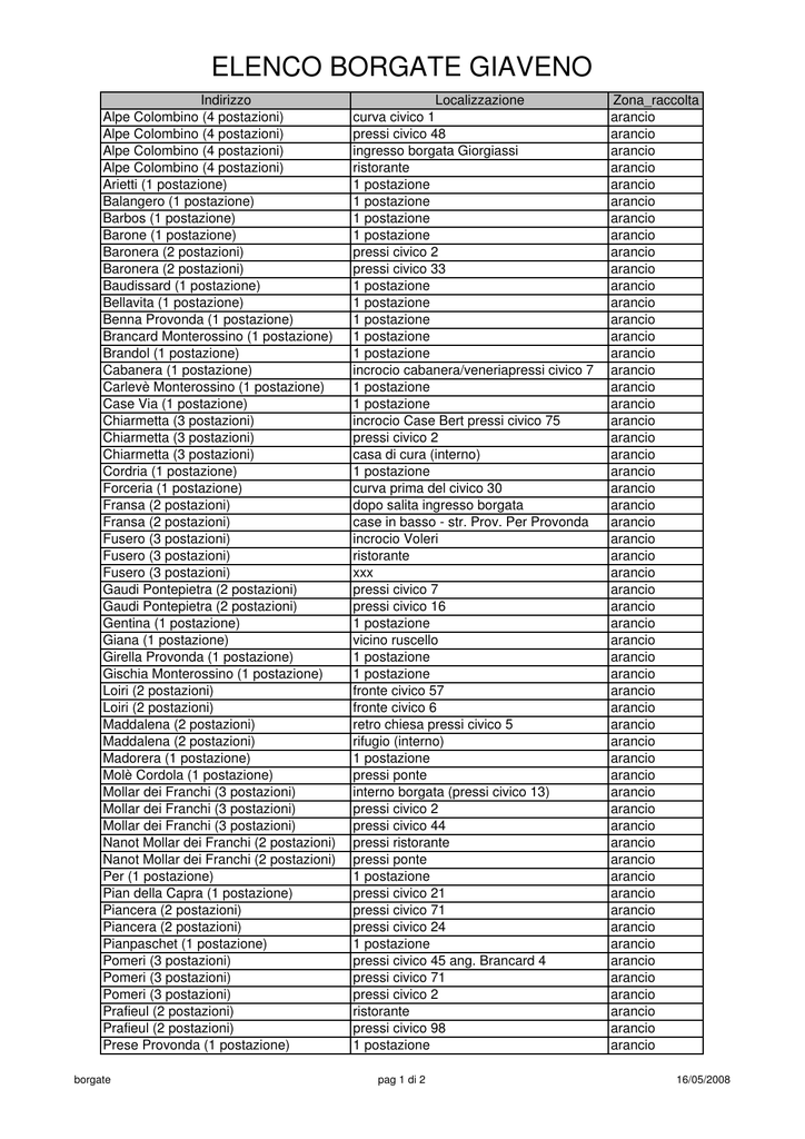ELENCO BORGATE GIAVENO Indirizzo Alpe Colombino (4 postazioni) Alpe Colombino (4 postazioni) Alpe Colombino (4 postazioni) Alpe Colombino (4 postazioni) Arietti (1 postazione) Balangero (1 postazione) Barbos (1 postazione) Barone (1 postazione) Baronera (2 postazioni) Baronera (2 postazioni) Baudissard (1 postazione) Bellavita (1 postazione) Benna Provonda (1 postazione) Brancard Monterossino (1 postazione) Brandol (1 postazione) Cabanera (1 postazione) Carlevè Monterossino (1 postazione) Case Via (1 postazione) Chiarmetta (3 postazioni) Chiarmetta (3 postazioni) Chiarmetta (3 postazioni) Cordria (1 postazione) Forceria (1 postazione) Fransa (2 postazioni) Fransa (2 postazioni) Fusero (3 postazioni) Fusero (3 postazioni) Fusero (3 postazioni) Gaudi Pontepietra (2 postazioni) Gaudi Pontepietra (2 postazioni) Gentina (1 postazione) Giana (1 postazione) Girella Provonda (1 postazione) Gischia Monterossino (1 postazione) Loiri (2 postazioni) Loiri (2 postazioni) Maddalena (2 postazioni) Maddalena (2 postazioni) Madorera (1 postazione) Molè Cordola (1 postazione) Mollar dei Franchi (3 postazioni) Mollar dei Franchi (3 postazioni) Mollar dei Franchi (3 postazioni) Nanot Mollar dei Franchi (2 postazioni) Nanot Mollar dei Franchi (2 postazioni) Per (1 postazione) Pian della Capra (1 postazione) Piancera (2 postazioni) Piancera (2 postazioni) Pianpaschet (1 postazione) Pomeri (3 postazioni) Pomeri (3 postazioni) Pomeri (3 postazioni) Prafieul (2 postazioni) Prafieul (2 postazioni) Prese Provonda (1 postazione) borgate Localizzazione curva civico 1 pressi civico 48 ingresso borgata Giorgiassi ristorante 1 postazione 1 postazione 1 postazione 1 postazione pressi civico 2 pressi civico 33 1 postazione 1 postazione 1 postazione 1 postazione 1 postazione incrocio cabanera/veneriapressi civico 7 1 postazione 1 postazione incrocio Case Bert pressi civico 75 pressi civico 2 casa di cura (interno) 1 postazione curva prima del civico 30 dopo salita ingresso borgata case in basso - str. Prov. Per Provonda incrocio Voleri ristorante xxx pressi civico 7 pressi civico 16 1 postazione vicino ruscello 1 postazione 1 postazione fronte civico 57 fronte civico 6 retro chiesa pressi civico 5 rifugio (interno) 1 postazione pressi ponte interno borgata (pressi civico 13) pressi civico 2 pressi civico 44 pressi ristorante pressi ponte 1 postazione pressi civico 21 pressi civico 71 pressi civico 24 1 postazione pressi civico 45 ang. Brancard 4 pressi civico 71 pressi civico 2 ristorante pressi civico 98 1 postazione pag 1 di 2 Zona_raccolta arancio arancio arancio arancio arancio arancio arancio arancio arancio arancio arancio arancio arancio arancio arancio arancio arancio arancio arancio arancio arancio arancio arancio arancio arancio arancio arancio arancio arancio arancio arancio arancio arancio arancio arancio arancio arancio arancio arancio arancio arancio arancio arancio arancio arancio arancio arancio arancio arancio arancio arancio arancio arancio arancio arancio arancio 16/05/2008 ELENCO BORGATE GIAVENO Indirizzo Prese Viretto (3 postazioni) Prese Viretto (3 postazioni) Prese Viretto (3 postazioni) Provonda (1 postazione) Roccette (6 postazioni) Roccette (6 postazioni) Roccette (6 postazioni) Roccette (6 postazioni) Roccette (6 postazioni) Roccette (6 postazioni) Rul (2 postazioni) Rul (2 postazioni) San Filippo (4 postazioni) San Filippo (4 postazioni) San Filippo (4 postazioni) San Filippo (4 postazioni) Tenua (1 postazione) Tetti Via (1 postazione) Tora (2 postazioni) Tora (2 postazioni) Ughettera (1 postazione) Ughetti Monterossino (1 postazione) Veisivera (2 postazioni) Veisivera (2 postazioni) Verna (3 postazioni) Verna (3 postazioni) Verna (3 postazioni) Viretta (1 postazione) Barolà Colpastore (1 postazione) Belvedere (1 postazione) Carlevè Colpastore (1 postazione) Colletta (1 postazione) Cont (2 postazioni) Cont (2 postazioni) Croia (1 postazione) Dalmassi (1 postazione) Giasinet Colpastore (1 postazione) Lionet Colpastore (1 postazione) Pogolotti (1 postazione) Rossa Colpastore (1 postazione) Sarà (1 postazione) borgate Localizzazione alta bassa pressi ponte Tauneri 1 postazione pressi civico 75 pressi curva/ruscello salire dal cimitero dopo curva a dx parcheggio dir. Balangero pressi 47 lavatoio fondo borgata dir. Balangero pressi 78 pressi civico 1 pressi civico 11 xxx xxx pressi civico 80 pressi civico 87 1 postazione 1 postazione xxx ristorante 1 postazione 1 postazione xxx pressi civico 3 pressi civico 93 pressi civico 104 pressi civico 30 1 postazione 1 postazione 1 postazione 1 postazione 1 postazione pressi civico 2 pressi civico 11 1 postazione 1 postazione 1 postazione 1 postazione 1 postazione 1 postazione 1 postazione pag 2 di 2 Zona_raccolta arancio arancio arancio arancio arancio arancio arancio arancio arancio arancio arancio arancio arancio arancio arancio arancio arancio arancio arancio arancio arancio arancio arancio arancio arancio arancio arancio arancio rosa rosa rosa rosa rosa rosa rosa rosa rosa rosa rosa rosa rosa 16/05/2008