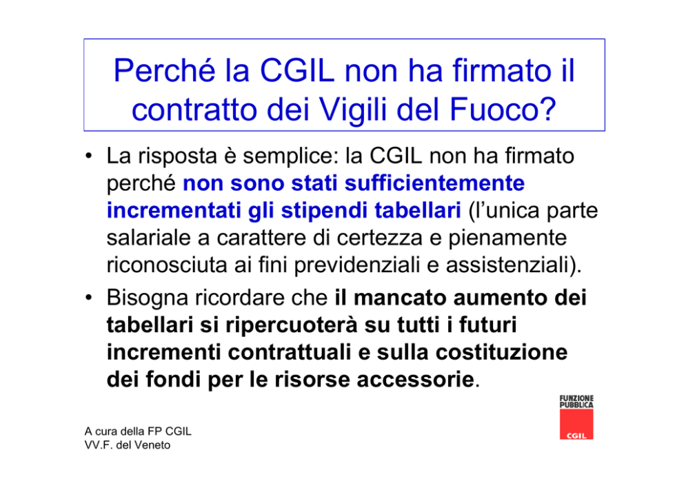 Perché la CGIL non ha firmato il contratto dei Vigili del Fuoco? • La risposta è semplice: la CGIL non ha firmato perché non sono stati sufficientemente incrementati gli stipendi tabellari (l’unica parte salariale a carattere di certezza e pienamente riconosciuta ai fini previdenziali e assistenziali). • Bisogna ricordare che il mancato aumento dei tabellari si ripercuoterà su tutti i futuri incrementi contrattuali e sulla costituzione dei fondi per le risorse accessorie. A cura della FP CGIL VV.F. del Veneto Perché la CGIL non ha firmato il contratto dei Vigili del Fuoco? • La CGIL non ha firmato anche perché i firmatari (CISL, UIL, CONFSAL, RDB) non hanno voluto considerare il parere dei lavoratori. • Infatti, non è prevista alcuna consultazione dei vigili del fuoco. • Un problema di democrazia che, unitamente al mancato rinnovo delle RSU, impone una profonda riflessione sulla democrazia sindacale nei luoghi di lavoro. Per la CGIL, il voto dei lavoratori rimane uno strumento vincolante per le scelte contrattuali e di rappresentanza. Vi invitiamo a sostenere questa nostra battaglia per la democrazia, i diritti, il riconoscimento delle professionalità ed un giusto salario. A cura della FP CGIL VV.F. del Veneto Quale è la differenza fra i contratti che la CGIL ha firmato ed il contratto firmato da CISL UIL CONFSAL RDB per i Vigili del FUOCO? • Di seguito, vi proponiamo un confronto fra uno dei contratti firmati dalla CGIL per il biennio economico 2006/2007 ed il testo proposto, per lo stesso biennio, per i Vigili del Fuoco. • Il contratto preso in esame è quello degli Enti Pubblici non Economici (INPS, INPDAP, INAIL, ecc.), che ha avuto un incremento medio mensile di 127,42 euro. Gli aumenti tabellari corrispondono mediamente a circa 103 euro. • Il contratto firmato da CISL UIL CONFSAL RDB per i Vigili del Fuoco, porta i seguenti aumenti tabellari: Vigile euro 72,12. Capo Squadra euro 77,32. Capo Reparto euro 79,17, Ispettore euro 81,27. Guardando al totale delle risorse, l’incremento medio mensile è inferiore a 100,00 euro. Inferiore, quindi, a quanto previsto con l’accordo Governo - Sindacati per tutta la pubblica amministrazione. • Per maggiore chiarezza, vi riportiamo di seguito alcuni confronti, esclusivamente economici, fra i due contratti. A cura della FP CGIL VV.F. del Veneto Incrementi contrattuali a confronto • Di seguito, le tabelle dei due contratti a confronto (Enti Pubblici Non Economici e Vigili del Fuoco) con gli incrementi contrattuali a regime per il biennio 2006/2007. A cura della FP CGIL VV.F. del Veneto Enti Pubblici Non Economici Incrementi a regime Ispettore gen. 146,77 Direttore 136,41 C5 124,80 C4 117,28 C3 106,78 C2 101,09 C1 97,67 B3 94,94 VIGILI DEL FUOCO Incrementi a regime SDA Ispettore Capo Reparto Capo squadra B2 91,01 B1 84,62 A3 A2 A1 A cura della FP CGIL VV.F. del Veneto Vigile Con scatto 96,34 Capo 88,90 SDA 83,81 Con scatto 83,20 Esperto 82,44 Ispettore 81,27 Vice 78,36 Con scatto 80,65 Esperto 80,11 CR 79,17 Con scatto 78,45 Esperto 77,90 CS 77,32 Con scatto 75,59 Coordinatore 75,04 Esperto 74,45 Qualificato 73,87 Vigile 72,12 Effetti degli incrementi contrattuali Stipendi annuali al 31.12.2007 (per qualifica) Considerata la notevole differenza dell’attività lavorativa, si sono messi a confronto, nelle 3 tabelle successive, i soli salari, partendo da livelli salariali fra loro comparabili (per i VVF: vigile con scatto, Capo Reparto, Ispettore). Si evidenzia che: • a causa delle scelte fatte (da CISL, UIL, CONFSAL, RDB), i Vigili del Fuoco, ad ogni livello, hanno una perdita secca di decine di euro negli incrementi tabellari; • con la scelta di agire sulle indennità, si sta ottenendo il risultato di impoverire gli stipendi e, quindi, i futuri incrementi e la rivalutazione previdenziale; • Tutta la discussione sulle indennità, sta portando solo tensioni e divisioni all’interno della categoria, con un conseguente indebolimento delle rivendicazioni dei Vigili del Fuoco. Per la CGIL, l’unità dei Vigili del Fuoco rimane un valore fondamentale. Vi invitiamo a sostenere questa nostra battaglia per la democrazia, i diritti ed un giusto salario. A cura della FP CGIL VV.F. del Veneto Enti Pubblici Non Economici (INPS, INPDAP, INAIL, ecc.) Stipendio annuo Qualifica Dal 1.1.06 Nuovo stipendio annuo 17565,79 18548,72 Incremento tabellare finale (+ 982,93) B2 Stipendio annuo Dal 1.1.06 EPNE B2 17565,79 VVF Vigile Con scatto 17647,17 VIGILI DEL FUOCO Stipendio annuo Qualifica Dal 1.1.06 Vigile Con scatto Nuovo stipendio annuo 17647,17 18554,23 Incremento tabellare finale (+ 907,06) Differenza Nuovo stipendio Differenza annuo al 31.12.07 18548,72 (+183,35) 18554,23 (+5,51) Enti Pubblici Non Economici (INPS, INPDAP, INAIL, ecc.) Stipendio annuo Qualifica Dal 1.1.06 18626,50 Nuovo stipendio annuo 19649,97 B3 Incremento tabellare finale (+1023,47) Stipendio annuo Dal 1.1.06 EPNE VVF B3 18626,50 Capo Reparto 18611,59 VIGILI DEL FUOCO Stipendio annuo Qualifica Dal 1.1.06 Capo Reparto Nuovo stipendio annuo 18611,59 19561,67 Incremento tabellare finale (+950,08) Differenza Nuovo stipendio Differenza annuo al 31.12.07 19649,97 (-14,91) 19561,67 (-88,30) Enti Pubblici Non Economici (INPS, INPDAP, INAIL, ecc.) Stipendio annuo Qualifica Dal 1.1.06 19190,33 Nuovo stipendio annuo 20243,16 C1 Incremento tabellare finale (+1052,83) Stipendio annuo Dal 1.1.06 EPNE VVF C1 19190,33 Ispettore Antinc. 19176,29 VIGILI DEL FUOCO Stipendio annuo Qualifica Dal 1.1.06 Ispettore Antinc. Nuovo stipendio annuo 19176,29 20151,55 Incremento tabellare finale (+975,26) Differenza Nuovo stipendio Differenza annuo al 31.12.07 20243,16 (-14,04) 20151,55 (-91,61) Per la CGIL, l’unità dei Vigili del Fuoco è un valore fondamentale Per la CGIL, il voto dei lavoratori è uno strumento vincolante per le scelte contrattuali e di rappresentanza. Vi invitiamo a sostenere questa nostra battaglia per la democrazia, i diritti, il riconoscimento delle profess
