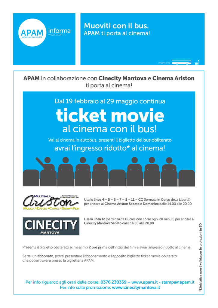 APAM servizi per la mobilità informa www.apam.it Muoviti con il bus. APAM ti porta al cinema! mantova APAM in collaborazione con Cinecity Mantova e Cinema Ariston ti porta al cinema! Dal 19 febbraio al 29 maggio continua ticket movie al cinema con il bus! Vai al cinema in autobus, presenti il biglietto del bus obliterato avrai l'ingresso ridotto* al cinema! Usa la linea 12 (partenza da Ducale con corse ogni 20 minuti) per andare al Cinecity Mantova Sabato dalle 14.00 alle 20.00 Presenta il biglietto obliterato al massimo 2 ore prima dell'inizio del film e avrai l'ingresso ridotto al cinema. Se sei un abbonato, potrai presentare l'abbonamento e l'apposito biglietto ticket movie obliterato che potrai trovare presso la biglietteria APAM. Per info riguardo agli orari delle corse: 0376.230339 – www.apam.it - [email protected] Per info sulla promozione: www.cinecitymantova.it *L'iniziativa non è valida per le proiezioni in 3D Usa le linee 4 – 5 – 6 – 7 – 8 – 11 – CC (fermata in Corso della Libertà) per andare al Cinema Ariston Sabato e Domenica dalle 14.00 alle 20.00