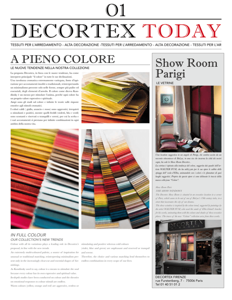 O1 DECORTEX TODAY TESSUTI PER L’ARREDAMENTO - ALTA DECORAZIONE -TESSUTI PER L’ARREDAMENTO - ALTA DECORAZIONE - TESSUTI PER L’AR A PIENO COLORE LE NUOVE TENDENZE NELLA NOSTRA COLLEZIONE La proposta Decortex, in linea con le nuove tendenze, ha come interprete principale “il colore” in tutte le sue declinazioni. Una tavolozza cromatica estremamente variegata, fonte d’ispirazione per accostamenti insoliti o tradizionali, reinterpretando un minimalismo presente solo nelle forme, sempre più pulite ed essenziali, degli elementi d’arredo. Il colore come diceva Kandinsky è un mezzo per stimolare l’anima, perché ogni colore ha un proprio valore espressivo e spirituale. Ampi sono gli studi sul colore e infinite le teorie sulle risposte emotive agli stimoli cromatici. I colori caldi ( giallo, arancio e rosso) sono aggressivi, irrequieti o stimolanti e positivi, mentre quelli freddi (violetti, blu e verdi) sono scostanti e riservati o tranquilli e sereni, per cui la scelta e i vari accostamenti si prestano per infinite combinazioni in ogni ambito della nostra vita. Show Room Parigi LE VETRINE Una location suggestiva in un angolo di Parigi, che sembra uscito da un racconto ottocentesco di Balzac, in una via che incarna la città dei nostri sogni, ha sede lo Show Room Decortex . La vetrina è ispirata alla tendenza del colore, suggerita dai quadri dell’artista WALTER FUSI, che ha utilizzato per le sue opere le sabbie delle spiagge dell’ isola d’Elba, animandole con i colori e le sfumature di quei luoghi suggestivi. Proprio da queste opere si sono delineate le traccie della nuova collezione “Colore”. Show Room Paris THE SHOW-WINDOWS The Decortex Show Room is situated in an evocative location in a corner of Paris, which seems to be out of one of Balzac’s 19th century tales, in a street that incarnates the city of our dreams. The show-window is inspired by the colour trend, suggested by paintings by the artist WALTER FUSI, who used the sands of Elba Island’s beaches for his works, animating them with the colours and shades of those evocative places. The traces of the new “Colour” collection arise from these works. IN FULL COLOUR OUR COLLECTION’S NEW TRENDS Colour with all its variations plays a leading role in Decortex’s stimulating and positive whereas cold colours proposal, in line with the new trends. (violet, blue and green) are unpleasant and reserved or tranquil An extremely multi-coloured palette, a source of inspiration for and serene. unusual or traditional matching, reinterpreting minimalism pre- Therefore, the choice and various matching lend themselves to sent only in the increasingly clear-cut and essential shapes of fur- endless combinations in every scope of our lives. nishings. As Kandinsky used to say, colour is a means to stimulate the soul because every colour has its own expressive and spiritual value. In-depth studies have been conducted on colour and the theories on emotional responses to colour stimuli are endless. Warm colours (yellow, orange and red) are aggressive, restless or DECORTEX FIRENZE rue Furstenberg, 7 - 75006 Paris Tel 01 40 51 01 2 DECORTEX TODAY TESSUTI PER L’ARREDAMENTO - ALTA DECORAZIONE -TESSUTI PER L’ARREDAMENTO - ALTA DECORAZIONE - TESSUTI PER L’ARREDAMENTO - TESSUTI PER L’ARR ARTIGIANALITA’ TOSCANA DUE AZIENDE TOSCANE UNISCONO LA LORO ESPERIENZA E ARTIGIANALITA’ Dal Connubio tra due Aziende Toscane che hanno fatto dell’arte e della tradizione la loro filosofia è nata l’idea di dar vita ad un oggetto che rappresenti l’essenza della loro arte. Decortex, una delle pochissime aziende al mondo che possono vantare il marchio di “Editore Tessile”, un riconoscimento per il design del tessile che oltre a produrre sono dei veri e propri “Creativi” del tessuto d’arredamento, con una costante ricerca tecnica e stilistica. Mangani è un’azienda che nasce da una grande tradizione nel campo del restauro di vecchie porcellane ed oggetti d’arte. Negli anni ha saputo rinnovarsi proponendo collezioni che spaziano dal classico al moderno con pezzi che vanno dal tavolo alla tazzina, permettendo soluzioni d’arredamento innovative per questo tipo di materiale. Tutti gli oggetti sono creazioni originali disegnate e modellate a mano ed al tornio. L’idea originale di questa collaborazione è stata quella di creare un oggetto con un insolito abbinamento di tessuto e porcellana, un pezzo unico dove innovazione e tradizione si fondono in perfetta armonia. Una licenza creativa a dimostrazione di come due materie diverse, il tessuto e la porcellana, riescono a fondersi creando un oggetto unico, proprio come l’eccellenza dell’ artigianalità toscana. TUSCAN CRAFTSMANSHIP Mangani is a company that arises from sound tradition in the where innovation and tradition blend in perfectly. TWO TUSCAN COMPANIES COMBINE realm of the restoration of old porcelain and art objects. A creative licence to show how two different materials, fabric and THEIR EXPERIENCE AND CRAFTSMANSHIP Over the years, it has known how to renew itself proposing col- porcelain, manage to merge creating a unique object, just like the The union of two Tuscan companies, whose philosophy is based lections that range from classic to modern with pieces that go excellence of Tuscan craftsmanship. on art and tradition, triggered off the idea to create an object from the table to the coffee cup, enabling innovative furnishing that represents the essence of their art. solutions for this type of material. Decortex is one of the very few companies worldwide that can All objects are original creations designed and modelled by hand boast the “Editore Tessile” hallmark, an award for textile design and with a lathe. that not only produce but are real “Creators” of furnishing fabric, The original idea of this cooperation was to create an object with with constant technical and stylistic research. an unusual combination of fabric and porcelain, a unique piece