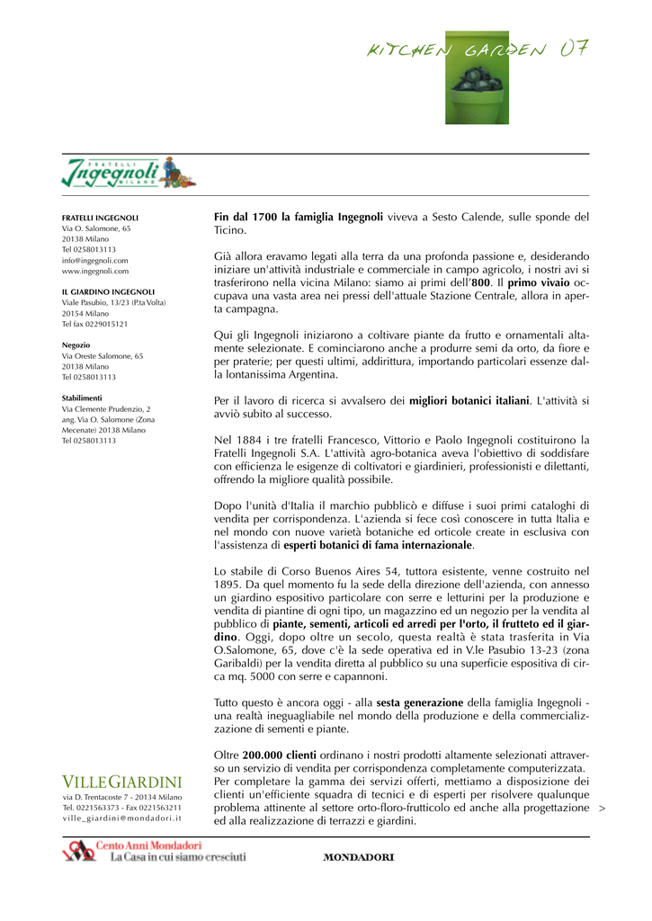 FRATELLI INGEGNOLI Via O. Salomone, 65 20138 Milano Tel 0258013113 [email protected] www.ingegnoli.com IL GIARDINO INGEGNOLI Viale Pasubio, 13/23 (P.ta Volta) 20154 Milano Tel fax 0229015121 Negozio Via Oreste Salomone, 65 20138 Milano Tel 0258013113 Stabilimenti Via Clemente Prudenzio, 2 ang. Via O. Salomone (Zona Mecenate) 20138 Milano Tel 0258013113 Fin dal 1700 la famiglia Ingegnoli viveva a Sesto Calende, sulle sponde del Ticino. Già allora eravamo legati alla terra da una profonda passione e, desiderando iniziare un'attività industriale e commerciale in campo agricolo, i nostri avi si trasferirono nella vicina Milano: siamo ai primi dell’800. Il primo vivaio occupava una vasta area nei pressi dell'attuale Stazione Centrale, allora in aperta campagna. Qui gli Ingegnoli iniziarono a coltivare piante da frutto e ornamentali altamente selezionate. E cominciarono anche a produrre semi da orto, da fiore e per praterie; per questi ultimi, addirittura, importando particolari essenze dalla lontanissima Argentina. Per il lavoro di ricerca si avvalsero dei migliori botanici italiani. L'attività si avviò subito al successo. Nel 1884 i tre fratelli Francesco, Vittorio e Paolo Ingegnoli costituirono la Fratelli Ingegnoli S.A. L'attività agro-botanica aveva l'obiettivo di soddisfare con efficienza le esigenze di coltivatori e giardinieri, professionisti e dilettanti, offrendo la migliore qualità possibile. Dopo l'unità d'Italia il marchio pubblicò e diffuse i suoi primi cataloghi di vendita per corrispondenza. L'azienda si fece così conoscere in tutta Italia e nel mondo con nuove varietà botaniche ed orticole create in esclusiva con l'assistenza di esperti botanici di fama internazionale. Lo stabile di Corso Buenos Aires 54, tuttora esistente, venne costruito nel 1895. Da quel momento fu la sede della direzione dell'azienda, con annesso un giardino espositivo particolare con serre e letturini per la produzione e vendita di piantine di ogni tipo, un magazzino ed un negozio per la vendita al pubblico di piante, sementi, articoli ed arredi per l'orto, il frutteto ed il giardino. Oggi, dopo oltre un secolo, questa realtà è stata trasferita in Via O.Salomone, 65, dove c'è la sede operativa ed in V.le Pasubio 13-23 (zona Garibaldi) per la vendita diretta al pubblico su una superficie espositiva di circa mq. 5000 con serre e capannoni. Tutto questo è ancora oggi - alla sesta generazione della famiglia Ingegnoli una realtà ineguagliabile nel mondo della produzione e della commercializzazione di sementi e piante. VILLE GIARDINI via D. Trentacoste 7 - 20134 Milano Tel. 0221563373 - Fax 0221563211 [email protected] Oltre 200.000 clienti ordinano i nostri prodotti altamente selezionati attraverso un servizio di vendita per corrispondenza completamente computerizzata. Per completare la gamma dei servizi offerti, mettiamo a disposizione dei clienti un'efficiente squadra di tecnici e di esperti per risolvere qualunque problema attinente al settore orto-floro-frutticolo ed anche alla progettazione > ed alla realizzazione di terrazzi e giardini. Come dicono molti nostri clienti Se non lo sanno alla Ingegnoli, probabilmente non lo sa nessuno. La nostra missione è diffondere la passione per il verde, con una continua ricerca della migliore qualità ai prezzi più accessibili, sia per i professionisti che per gli hobbisti.L'attività di ricerca di nuove e migliori varietà non si ferma mai. Attraverso la partecipazione dei più grandi specialisti di genetica vegetale, anche di oltre-oceano, cerchiamo di produrre sementi in grado di soddisfare le richieste di un mercato in continua evoluzione. Pur essendo una delle più conosciute aziende del settore in Italia e all'estero, il nostro metodo di lavoro e la nostra attitudine al dialogo con i clienti ci consentono di mantenere un rapporto diretto e personale. Offriamo prodotti al più alto livello qualitativo, personalizzato ed a prezzi accessibili. Probabilmente è per questo che i nostri clienti hanno poi l'abitudine di rimanerci fedeli nel tempo. VILLE GIARDINI via D. Trentacoste 7 - 20134 Milano Tel. 0221563373 - Fax 0221563211 [email protected]