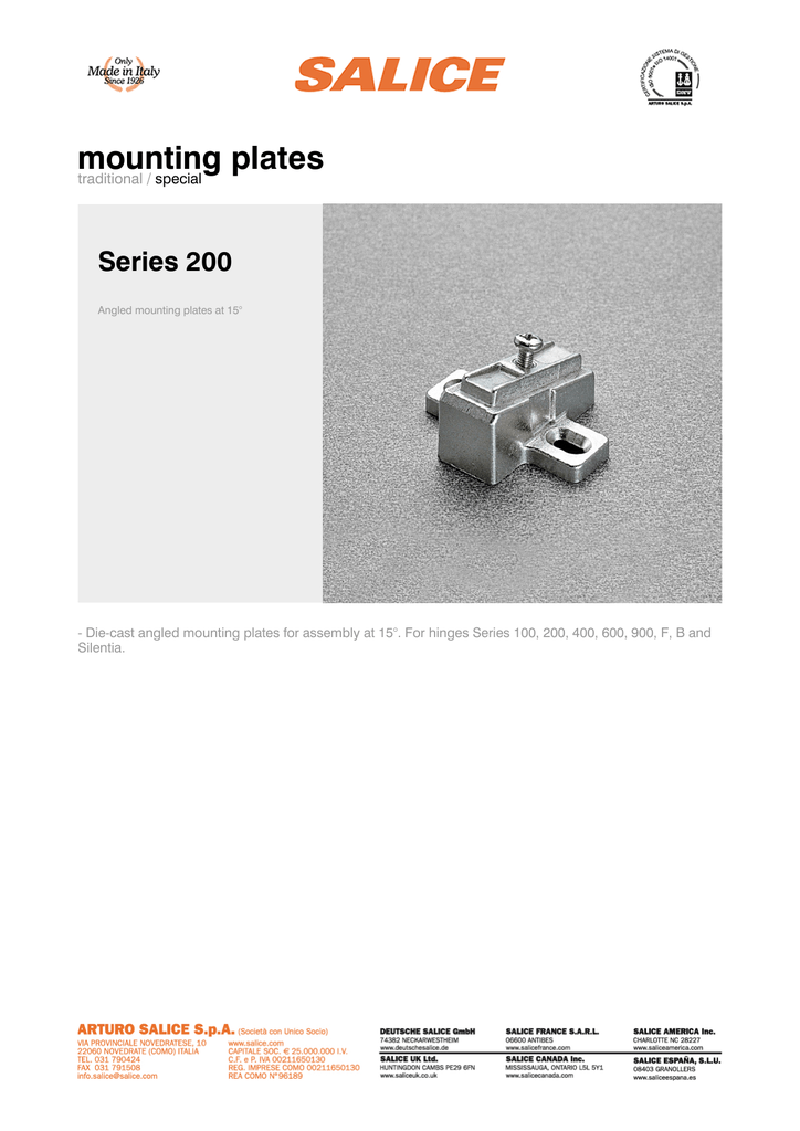 mounting plates traditional / special Series 200 Angled mounting plates at 15° - Die-cast angled mounting plates for assembly at 15°. For hinges Series 100, 200, 400, 600, 900, F, B and Silentia. mounting plates traditional / special Series 200 Angled mounting plates at 15° B2V3BW9 Die-cast mounting plates.Fixing: wood screw.B 3.5 DIN 7983. B2VGBW9 Die-cast mounting plates. Fixing: Euroscrew. Drilling ø5x11 mm.