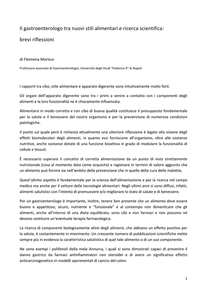 Il gastroenterologo tra nuovi stili alimentari e ricerca scientifica: brevi riflessioni di Filomena Morisco Professore associato di Gastroenterologia, Università degli Studi “Federico II” di Napoli I rapporti tra cibo, stile alimentare e apparato digerente sono intuitivamente molto forti. Gli organi dell’apparato digerente sono tra i primi a venire a contatto con i componenti degli alimenti e la loro funzionalità ne è chiaramente influenzata. Alimentarsi in modo corretto e con cibo di buona qualità costituisce il presupposto fondamentale per la salute e il benessere del nostro organismo e per la prevenzione di numerose condizioni patologiche. Il punto sul quale però è richiesta attualmente una ulteriore riflessione è legato alla visione degli effetti biomolecolari degli alimenti, in quanto essi forniscono all’organismo, oltre alle sostanze nutritive, anche sostanze dotate di una funzione bioattiva in grado di modulare la funzionalità di cellule e tessuti. È necessario superare il concetto di corretta alimentazione da un punto di vista strettamente nutrizionale (cosa al momento data come acquisita) e ragionare in termini di valore aggiunto che un alimento può fornire sia nell’ambito della prevenzione che in quello della cura delle malattie. Quest’ultimo aspetto è fondamentale per la scienza dell’alimentazione e per la ricerca nel campo medico ma anche per il settore delle tecnologie alimentari. Negli ultimi anni si sono diffusi, infatti, alimenti salutistici con l’intento di promuovere e/o migliorare lo stato di salute e di benessere. Per un gastroenterologo è importante, inoltre, tenere ben presente che un alimento deve essere buono e appetitoso, sicuro, nutriente e “funzionale” e al contempo non dimenticare che gli alimenti, anche all’interno di una dieta equilibrata, sono cibi e non farmaci e non possono né devono sostituire un’eventuale terapia farmacologica. La ricerca di componenti biologicamente attivi degli alimenti, che abbiano un effetto positivo per la salute, è costantemente in movimento. Un crescente numero di pubblicazioni scientifiche mette sempre più in evidenza la caratteristica salutistica di quel tale alimento o di un suo componente. Ne sono esempi i polifenoli della mela Annurca, i quali si sono dimostrati capaci di prevenire il danno gastrico da farmaci antinfiammatori non steroidei e di avere un significativo effetto anticarcinogenetico in modelli sperimentali di cancro del colon. 1 Il caffè, ricco di componenti bioattivi come i polifenoli, le melanoidine, l’acido clorogenico, i terpeni ecc. ha effetti epatoprotettivi in un ampio spettro di condizioni che vanno dalla semplice alterazione delle transaminasi alla steatosi, alla steatoepatite e alla fibrosi epatica, fino alla potenziale interferenza nella oncogenesi. Gli omega 3 – aggiunti a molti alimenti funzionali come latte, uova, soia e cereali – si sono dimostrati, in studi su animali e in studi clinici, determinanti nella riduzione della steatosi epatica, nel miglioramento dell’insulino-‐resistenza e nella riduzione dei markers di infiammazione. Negli ultimi anni è stato sviluppato un ampio numero di prodotti con attività probiotica e prebiotica con l’intento di salvaguardare e/o ripristinare il microbiota intestinale al fine di migliorare la salute dell’intestino e le molteplici interazioni con gli altri organi, che risultano sempre più evidenti (gut-‐liver axis, gut-‐brain axis ecc.). Nella società industrializzata di oggi, il cambiamento dei modelli della dieta e degli stili di vita ha portato ad un costante aumento di patologie metaboliche, sebbene, contemporaneamente, il mercato degli alimenti funzionali risulti essere in costante crescita, a dimostrazione che il consumatore ha percepito la stretta relazione tra alimentazione e salute. Alla luce di questa nuova tendenza, i gastroenterologi devono essere un “trait d’union” tra la ricerca scientifica per lo sviluppo di nuovi prodotti funzionali e la scelta quotidiana da parte del consumatore di alimenti con accertate proprietà benefiche per la salute. 2