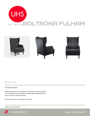 POLTRONA FULHAM Poltrone POLTRONA FULHAM Poltrona moderna con schienale altro. Rivestita in tessuto standard o nel materiale fornito dal cliente. Gambe in legno disponibili nelle tinte e nei colori secondo richiesta. Dimensions: (L) 72cm x (H) 130cm x (P) 79cm Product code: 1112-0117 06 62202563 www.uhsgroup.it
