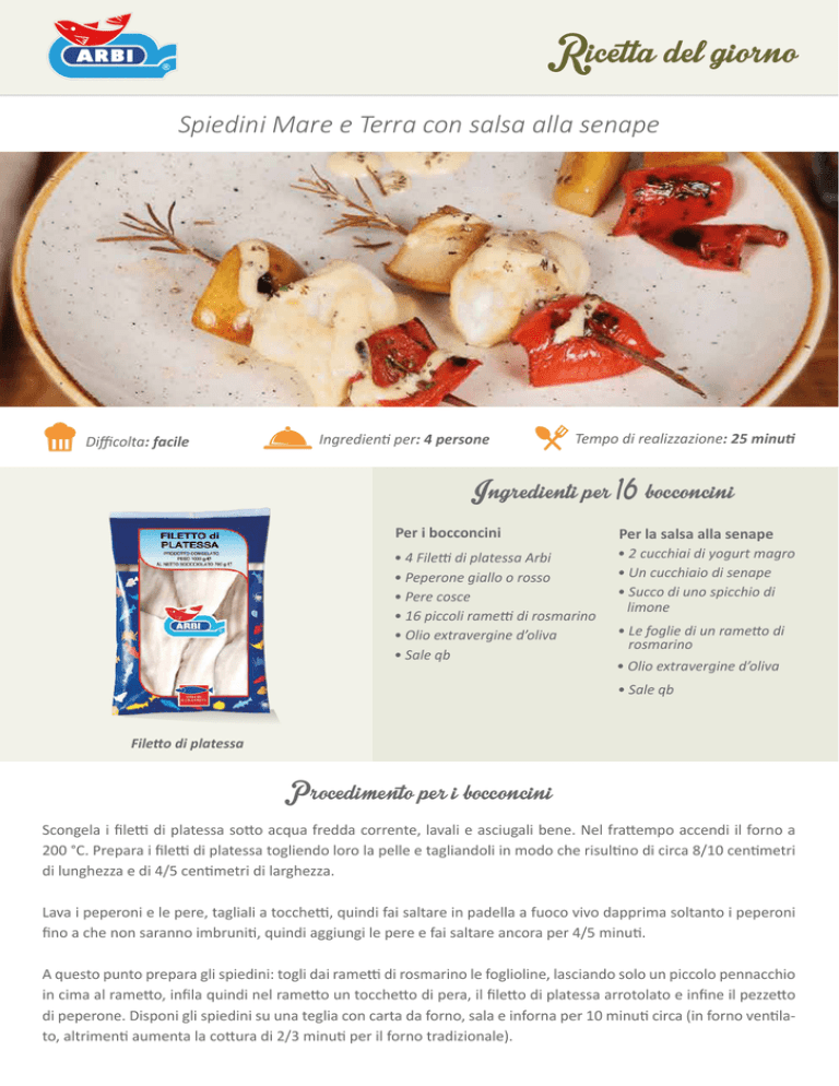 Ricetta del giorno ® Spiedini Mare e Terra con salsa alla senape Difficolta: facile Ingredienti per: 4 persone Tempo di realizzazione: 25 minuti Ingredienti per 16 bocconcini Per i bocconcini • 4 Filetti di platessa Arbi • Peperone giallo o rosso • Pere cosce • 16 piccoli rametti di rosmarino • Olio extravergine d’oliva • Sale qb Per la salsa alla senape • 2 cucchiai di yogurt magro • Un cucchiaio di senape • Succo di uno spicchio di limone • Le foglie di un rametto di rosmarino • Olio extravergine d’oliva • Sale qb Filetto di platessa Procedimento per i bocconcini Scongela i filetti di platessa sotto acqua fredda corrente, lavali e asciugali bene. Nel frattempo accendi il forno a 200 °C. Prepara i filetti di platessa togliendo loro la pelle e tagliandoli in modo che risultino di circa 8/10 centimetri di lunghezza e di 4/5 centimetri di larghezza. Lava i peperoni e le pere, tagliali a tocchetti, quindi fai saltare in padella a fuoco vivo dapprima soltanto i peperoni fino a che non saranno imbruniti, quindi aggiungi le pere e fai saltare ancora per 4/5 minuti. A questo punto prepara gli spiedini: togli dai rametti di rosmarino le foglioline, lasciando solo un piccolo pennacchio in cima al rametto, infila quindi nel rametto un tocchetto di pera, il filetto di platessa arrotolato e infine il pezzetto di peperone. Disponi gli spiedini su una teglia con carta da forno, sala e inforna per 10 minuti circa (in forno ventilato, altrimenti aumenta la cottura di 2/3 minuti per il forno tradizionale). Spiedini Mare e Terra con salsa alla senape Procedimento per la salsa alla senape Trita finemente il rosmarino e unisci tutti gli ingredienti in una piccola ciotola, mescola fino ad ottenere un composto omogeneo. Spiedini Mare e Terra con salsa alla senape Consigli dello chef Se vuoi servire elegantemente i tuoi bocconcini, mettili all’interno di un calice da vino macchiandoli con un po’ di salsa alla senape, per esaltare il sapore del pesce e degli altri ingredienti creando in bocca un gioco di sapori davvero interessante! Abbinamento vino Vermentino di Gallura docg, bianco di Custoza doc.
