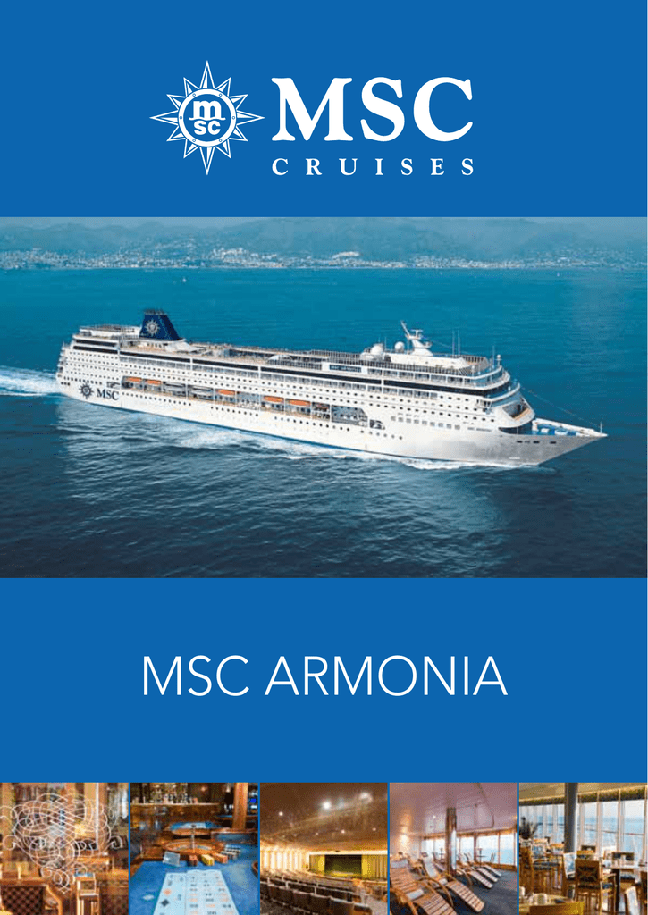 MSC ARMONIA Technical characteristics of the ship Gross tonnage 58.625 tons Public areas Length 251,25 m Beam 28,8 m Height 54 m Number of passengers 1.554 (on double basis) Total cabins 777 Crew approximate 700 people Maximum speed 21,7 knots Voltage 110/220 Volts Shuffleboard, minigolf, tennis, basketball, volleyball, jogging track, gymnasium, solarium, children’s playroom, teenagers area, video games room, beauty salon, hairdresser, SPA, bars, restaurants, cafeteria, internet café, discotheque, karaoke, theatre, cinema, casino, library, play room, cigar room, conference room, meeting room, photo gallery, shopping area. Medical center. Duty Free Shops. Stabilizers Yes Passenger decks 9 Lifts 9 Swimming pools 2 for adults and children / 2 SPA baths Cabin types Suites with balcony Outside cabins 132 suites with private balcony (22 m2) 371 cabins (13 m2) Air conditioning Single beds that can be converted into double bed (on request) Double bed Air conditioning Spacious wardrobe Bathroom with shower Bathroom with bathtub TV, telephone TV, telephone Availability of internet connection by your own laptop (on payment) Mini bar Safe Note: some cabins on the Topazio Deck have the view blocked. Mini bar Safe Family-size suites with porthole Inside cabins 2 suites (22 m ) 272 cabins (13 m2), 4 of wich for disabled people (21 m2) Double bed that can be coverted into two sigle beds (on request) Single beds that can be converted into double bed (on request) except for the cabins for disabled people 2 separate rooms, one of which for children Air conditioning Air conditioning Bathroom with shower Bathroom with shower TV, telephone TV, telephone Mini bar Mini bar Safe 2 Safe The illustrations shown on this page are solely for the reader’s information; the furnishings and layout may vary from one cabin to another of the same category. Common services Various services Reception Seats Use Surface (m2) Deck 51 Information office 490 5 Rubino Tour Office Medical Center Lounges / Conference Rooms Teatro La Fenice MSC Business Center Seats Excursion office 5 Rubino Medical center, first aid station 7 Topazio Use Surface (m2) Deck approx. 600 Theatre, shows, conferences 1.135 5 Rubino 6 Diamante 190 Conferences, meeting room, cinema 394 6 Diamante Incentive facilities Projectors, DVD, VHS, MD, overhead projector, white board, microphone, wireless microphone, PPT computer, slide projector, internet access, telephone socket and connection, followspots, audio system, video system. Public areas Restaurants Seats Use Surface (m2) Deck Marco Polo 650 Restaurant 1.065 5 Rubino La Pergola 300 Restaurant 534 6 Diamante Il Girasole 320 Outdoor restaurant/grill 968 11 Acquamarina La Brasserie Cafeteria 310 Cafeteria, bar 710 11 Acquamarina Bars / Lounges Seats Use Surface (m2) Deck The White Lion 114 English Pub 250 5 Rubino Cigar Room 13 Smokers room, lounge 50 5 Rubino Bar del Duomo 239 Bar 360 5 Rubino Caffè San Marco 90 Bar, café 245 6 Diamante The Red Bar 115 Piano Bar 180 6 Diamante Armonia Lounge 363 Bar, karaoke, dance floor 650 7 Topazio Seats Use Surface (m2) Deck 125 Pool bar 2.364 11 Acquamarina Use Surface (m2) Deck Thalassotherapy, turkish bath, sauna, gymnasium, massages, beauty salon, hairdresser, Fitness Center 831 11 Acquamarina Solarium 742 13 Sun Deck Use Surface (m2) Deck Outdoor bars Il Lido Bar SPA, Relax, Sport activities & Entertainment SPA & Relax Seats MSC Aurea SPA Solarium Sport activities Seats Jogging Track Jogging track 12 Zaffiro Shuffleboard Shuffleboard 13 Sun Deck Minigolf 13 Sun Deck Minigolf Sport Center Entertainment Seats Jewelry Shop Gallery Shop Via della Spiga Internet Café 6 workstations Palm Beach Casino Photo Gallery San Marco The Card Room & The Library 40 238 Star Galaxy Video Games Teen’s Club 337 Deck Games Use Surface (m2) Deck Jewellery & de luxe accessories 5 Rubino Sunglasses, watches & fashion jewellery 5 Rubino Fashion accessories 5 Rubino Duty free, Logo shop, Perfumes 249 5 Rubino Internet café 80 5 Rubino Bar, roulette, Blackjack, slot machines 454 6 Diamante Photo gallery, photographer 107 6 Diamante 6 Diamante Sunglasses, watches & fashion jewellery I 7 Nani Starlight Disco Basketball, tennis, volleyball, five-a-side football 27 Library, reading room, card room 116 7 Topazio Children’s playroom 112 11 Acquamarina Discotheque, bar 520 12 Zaffiro Video games room 50 12 Zaffiro Teenagers area 95 12 Zaffiro 1202 1206 1208 1210 1212 1214 1216 1218 1220 1222 1224 1226 1228 Relaxation Area Thermal Suite I 7 Nani Children Area Lift Gymnasium Beauty Parlour Lift Lift Lift Lift 9061 9065 9069 9073 9077 9081 9087 9091 9095 9099 9103 9107 9119 9115 Lift Lift 8005 8009 8015 8019 8023 8027 8031 8035 8039 8043 8047 8051 8053 8057 8061 8121 8001 8003 9006 9010 9008 9014 9012 9018 9016 9022 9020 9026 9024 9030 9028 9034 9032 9038 9036 9042 9040 9046 9044 9048 H 9052 9050 9056 9054 9058 8063 8067 8071 8073 8077 8081 8085 8087 8089 8093 8097 8101 8105 8109 8115 8119 F.C. 9062 9060 9066 9064 9070 9068 9074 9072 9078 9076 9080 9082 9088 9086 9092 9090 9096 9094 9100 9098 9104 9102 9108 9106 9112 9110 9116 9114 9120 9118 9220 9222 9226 9230 9234 9238 9240 9244 9248 9252 9256 9260 9166 9164 9168 9170 9172 9176 9174 9180 9178 9184 9182 9188 9186 9192 9190 9196 9194 9200 9198 9204 9202 9208 9206 9212 9210 9214 9218 9216 9224 9228 9232 9236 9242 9246 9250 9254 9258 9262 9266 9264 8225 8229 8227 8233 8231 8237 8235 8239 8243 8241 8247 8245 8251 8249 8255 8253 8259 8257 8263 8261 8267 8265 8271 8269 8173 8177 8181 8185 8189 8193 8197 8201 8205 8209 8169 8163 8159 8127 8131 8135 8139 8143 8147 8151 8155 8091 8095 8099 8103 8107 8111 8117 8075 8079 8083 8069 8065 8055 8059 8007 8011 8017 8021 8025 8029 8033 8037 8041 8045 8049 9122 9126 9124 9130 9128 9134 9132 9138 9136 9142 9140 9146 9144 9150 9148 9154 9152 9158 9156 9162 9160 9001 9002 9004 9059 9063 9067 9071 9075 9079 9083 9085 9089 9093 9097 9101 9105 9109 9111 9117 9125 9129 9133 9137 9141 9145 H 9149 9157 Lift Lift 82
