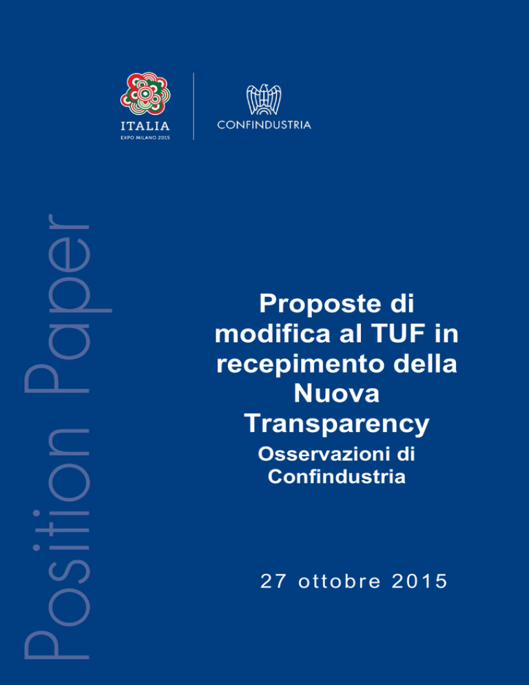 Proposte di modifica al TUF in recepimento della Nuova Transparency Osservazioni di Confindustria 27 ottobre 2015 Proposte di modifica al TUF in recepimento della Nuova Transparency Osservazioni di Confindustria Premessa Lo scorso Lo scorso 12 ottobre il Ministero dell’economia e delle finanze (di seguito MEF) ha sottoposto a consultazione pubblica un documento recante interventi di modifica al d.lgs. n. 58/1998 - Testo Unico della Finanza (di seguito TUF), per dare attuazione alla Direttiva 2013/50/UE che ha innovato la Direttiva 2004/109/CE (c.d. direttiva. Transparency). Il documento presenta una tabella di comparazione tra le disposizioni del TUF vigenti e il loro possibile contenuto per effetto delle modifiche proposte, che riguardano in particolare alcuni aspetti definitori, i temi degli assetti proprietari e dell’informazione finanziaria e il regime sanzionatorio. Preliminarmente, Confindustria esprime un pieno apprezzamento per la scelta del MEF di sottoporre al confronto con gli stakeholder misure che avranno un significativo impatto sull’operatività degli emittenti. In linea generale, le misure poste in consultazione si muovono lungo una direttrice coerente con la ratio della Direttiva, che è mantenere un appropriato regime di trasparenza contenendo, al contempo, gli oneri amministrativi che gravano su investitori ed emittenti, specie quelli piccoli e medi. Di seguito, si svolgono brevi considerazioni sugli aspetti di dettaglio unitamente ad alcune richieste di chiarimento. Osservazioni Definizione di PMI All’articolo 1, lettera w-quater.1), del TUF, la definizione di “PMI” viene rettificata eliminando i riferimenti a: i) il bilancio approvato relativo all’ultimo esercizio, quale fonte da cui trarre il dato del fatturato di 300 milioni di euro; ii) il requisito della capitalizzazione media dell’ultimo anno solare. Le modifiche sono condivisibili, perché dirette ad agevolare la quotazione di PMI di nuova costituzione. Si richiede però di indicare la nozione di fatturato che viene in rilievo in questa sede. Novembre 2014 1 Proposte di modifica al TUF in recepimento della Nuova Transparency Osservazioni di Confindustria Inoltre, si potrebbe meglio chiarire se, ai fini dell’esclusione dal novero delle PMI, i predetti parametri definitori - fatturato inferiore a 300 milioni di euro e capitalizzazione di mercato inferiore a 500 milioni di euro - devono essere superati congiuntamente o alternativamente, considerata la portata non univoca della previsione di cui al secondo periodo della lettera wquater.1): “Non si considerano PMI gli emittenti azioni quotate che abbiano superato entrambi i predetti limiti per tre anni consecutivi”. Partecipazioni rilevanti All’articolo 120, comma 2, del TUF, la soglia di partecipazione al capitale che fa scattare gli obblighi di comunicazione delle partecipazioni rilevanti viene aumentata dal due al tre per cento. La misura è apprezzabile, in quanto avvia un percorso di allineamento della soglia italiana a quella dei principali Paesi europei. Tuttavia, nell’ottica di un’effettiva armonizzazione degli obblighi di trasparenza relativi agli assetti proprietari e per evitare fenomeni di forum shopping penalizzanti per il mercato domestico, andrebbe valutata l’opportunità di elevare tale soglia al cinque per cento laddove emergesse un orientamento prevalente in questo senso da parte degli altri Stati membri. Questa soluzione avrebbe peraltro il pregio di superare le differenze attualmente esistenti tra gli obblighi di trasparenza gravanti su tutti gli emittenti quotati e quelli in capo alle PMI e ad alcune tipologie di soggetti dichiaranti, per i quali la soglia è già fissata al cinque per cento. La soluzione appena ipotizzata dovrebbe essere adottata lasciando però inalterata la soglia prevista dall’articolo 121 del TUF per le partecipazioni reciproche, in quanto tradizionalmente la disciplina riguardante queste ultime risponde a esigenze di tutela ulteriori - e più ampie - di quelle assolte dalle regole in tema di partecipazioni rilevanti. Relazioni finanziarie All’articolo 154-ter, si modifica anzitutto il termine entro cui gli emittenti devono mettere a disposizione del pubblico la relazione semestrale (comma 2). Infatti, è previsto che tale relazione debba essere pubblicata non più entro sessanta giorni dalla chiusura del primo semestre dell’esercizio, ma “non appena possibile e comunque entro tre mesi” dalla predetta chiusura. L’ampliamento del termine è condivisibile; tuttavia, per evitare il rischio di letture non univoche, l’espressione “non appena possibile e comunque” potrebbe essere eliminata, fatti comunque salvi, da un lato, il riferimento al termine di tre mesi e, dall’altro, la possibilità per gli emittenti di provvedere 2 Proposte di modifica al TUF in recepimento della Nuova Transparency Osservazioni di Confindustria entro un termine inferiore. A questo proposito, infatti, si rileva che l’ampliamento del termine potrebbe comportare tempistiche di emissione delle relazioni da parte della società di revisione non allineate alle esigenze di tempestiva comunicazione da parte degli emittenti, con la conseguente necessità per gli emittenti medesimi di poter disporre di adeguati rimedi. Inoltre, l’obbligo di pubblicazione del resoconto intermedio di gestione (comma 5) viene eliminato, con contestuale attribuzione alla Consob della delega a stabilire con regolamento obblighi di comunicazione delle informazioni finanziarie periodiche con frequenza maggiore rispetto a quella annuale e semestrale, nel rispetto delle condizioni fissate dalla Direttiva. In proposito, si ritiene che in sede di recepimento il Legislatore dovrebbe cogliere appieno l’opportunità di semplificazione del quadro regolamentare introdotta dalla Direttiva. Quest’ultima, infatti, riconosce sì agli Stati membri il potere di disciplinare obblighi di disclosure più stringenti, ma muove dalla scelta di fondo 