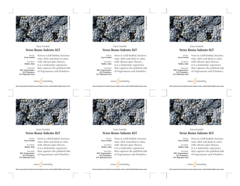 Casa Contini Casa Contini Casa Contini Verso Rosso Salento IGT Verso Rosso Salento IGT Verso Rosso Salento IGT Estate: Casa Contini Location: Molise, Italy Varietals: 60% Negroamaro, 35% Primitivo, 15% Malvasia Nera Verso is a full-bodied, luscious wine. Rich and dark in color, with vibrant spice flavors, it is a hedonistic experience that captures the polished side of Negroamaro and Primitivo. Estate: Casa Contini Location: Molise, Italy Varietals: 60% Negroamaro, 35% Primitivo, 15% Malvasia Nera Verso is a full-bodied, luscious wine. Rich and dark in color, with vibrant spice flavors, it is a hedonistic experience that captures the polished side of Negroamaro and Primitivo. Estate: Casa Contini Location: Molise, Italy Varietals: 60% Negroamaro, 35% Primitivo, 15% Malvasia Nera Verso is a full-bodied, luscious wine. Rich and dark in color, with vibrant spice flavors, it is a hedonistic experience that captures the polished side of Negroamaro and Primitivo. Casa Contini Casa Contini Casa Contini Verso Rosso Salento IGT Verso Rosso Salento IGT Verso Rosso Salento IGT Estate: Casa Contini Location: Molise, Italy Varietals: 60% Negroamaro, 35% Primitivo, 15% Malvasia Nera Verso is a full-bodied, luscious wine. Rich and dark in color, with vibrant spice flavors, it is a hedonistic experience that captures the polished side of Negroamaro and Primitivo. Estate: Casa Contini Location: Molise, Italy Varietals: 60% Negroamaro, 35% Primitivo, 15% Malvasia Nera Verso is a full-bodied, luscious wine. Rich and dark in color, with vibrant spice flavors, it is a hedonistic experience that captures the polished side of Negroamaro and Primitivo. Estate: Casa Contini Location: Molise, Italy Varietals: 60% Negroamaro, 35% Primitivo, 15% Malvasia Nera Verso is a full-bodied, luscious wine. Rich and dark in color, with vibrant spice flavors, it is a hedonistic experience that captures the polished side of Negroamaro and Primitivo.