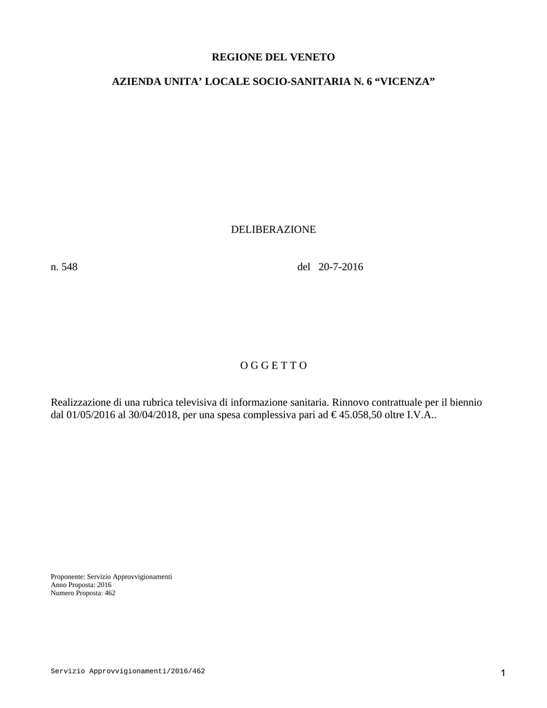 REGIONE DEL VENETO AZIENDA UNITA’ LOCALE SOCIO-SANITARIA N. 6 “VICENZA” DELIBERAZIONE n. 548 del 20-7-2016 OGGETTO Realizzazione di una rubrica televisiva di informazione sanitaria. Rinnovo contrattuale per il biennio dal 01/05/2016 al 30/04/2018, per una spesa complessiva pari ad € 45.058,50 oltre I.V.A.. Proponente: Servizio Approvvigionamenti Anno Proposta: 2016 Numero Proposta: 462 Servizio Approvvigionamenti/2016/462 1 Il Direttore del Servizio “Approvvigionamenti” riferisce: “La Legge n° 150/2000 disciplina le modalità di promozione delle attività di informazione e di comunicazione delle pubbliche amministrazioni fornendo, di fatto, un forte impulso alle iniziative realizzate tramite i mezzi di comunicazione di massa, la stampa, gli audiovisivi e gli strumenti telematici. Analogamente la Direttiva 7 febbraio 2002 della Presidenza del Consiglio dei Ministri richiama, fra l’altro, la responsabilità dei vertici delle Pubbliche Amministrazioni all'applicazione della citata legge n° 150/2000 e alla definizione di strutture e risorse necessarie per: • • progettare e realizzare attività' di informazione e comunicazione destinate ai cittadini e alle imprese produrre e fornire informazioni, promuovere eventi che, tenendo conto dei tempi e dei criteri che regolamentano il sistema dei media, possano tradursi in notizie per i mass media tradizionali e nuovi, come i giornali on-line, e altri mezzi di diffusione di notizie di interesse pubblico… da circa 30 anni L’U.L.S.S. n° 6 Vicenza affida la realizzazione e la diffusione tramite la piattaforma televisiva terrestre e satellitare TVA Vicenza (gruppo Videomedia Srl) della rubrica di informazione sanitaria “Vita e Salute”; in data 30/04/2016 è scaduto il relativo contratto relativo ai servizi in argomento, affidato con Provvedimento Dirigenziale n° 232/2014, per il periodo 01/05/2014/-30/04/2016; con nota del 09/11/2015 la Società Videomedia Srl ha proposto al Direttore Generale il rinnovo del contratto per un ulteriore biennio alle precedenti condizioni tecniche ed economiche di fornitura, ovvero: • realizzazione di 96 puntate della rubrica televisiva “Vita e Salute” • trasmissione su TvA Vicenza (DTT 10 + SKY 832) il mercoledì alle ore 13:10 e, in replica, sabato alle ore 19:05 • trasmissione su Terra Veneta (DTT 645) il mercoledì • trasmissione su TvA News (DTT 295) il mercoledì • fruibilità dei contenuti “on-demand” nella sezione “informazione” del sito www.tvavicenza.it a fronte di un corrispettivo di € 494,06 + IVA per ciascuna puntata realizzata, equivalenti a € 47.429,76 + IVA nel biennio contrattuale; con successiva nota del 10/05/2016 la Società Videomedia Srl ha comunicato la disponibilità a concedere uno sconto, rispetto alle precedenti quotazioni, nella misura del 5% e ciò equivale ad un risparmio per l’U.L.S.S di circa € 2.900,00; TvA Vicenza rappresenta tradizionalmente l’emittente televisiva di riferimento per la popolazione della Provincia di Vicenza godendo di un grado di penetrazione che, nel Veneto, la colloca nei primi tre posti nella graduatoria dei contatti giornalieri, alle spalle solo di emittenti televisive che tramettono principalmente contenuti di carattere regionale (fonte AUDITEL: CONTATTI NETTI DEL GIORNO MEDIO MENSILE cioè il numero dei spettatori diversi tra loro che si sintonizzano per almeno un minuto nel giorno medio mensile, come da scheda che si propone di allegare al presente atto); Servizio Approvvigionamenti/2016/462 2 per detti motivi si ritiene che la realizzazione di quanto in argomento possa essere affidata esclusivamente alla Società Videomedia Srl; ciò premesso si propone di affidare, ai sensi dell’art. 63 comma 2, lettera b) del D.Lgs. 50/2016 la realizzazione e la diffusione su vari network di n. 96 puntate della rubrica televisiva “Vita e Salute” da realizzarsi nel periodo 01/05/2016 – 30/04/2018; Il medesimo Direttore ha attestato l’avvenuta regolare istruttoria della pratica anche in relazione alla sua compatibilità con la vigente legislazione regionale e statale in materia; I Direttori Amministrativo, Sanitario e dei Servizi Sociali e della Funzione Territoriale hanno espresso il parere favorevole per quanto di rispettiva competenza. Sulla base di quanto sopra IL DIRETTORE GENERALE DELIBERA 1. di prendere atto di quanto espresso in premessa e qui integralmente richiamato; 2. di rinnovare, ai sensi dell’art. 63 comma 2, lettera b) del D.Lgs. 50/2016, il contratto con il gruppo Videomedia Srl, per il periodo dal 01/05/2016 al 30/04/2018, riguardante la realizzazione e la diffusione tramite la piattaforma televisiva terrestre e satellitare TVA Vicenza della rubrica di informazione sanitaria “Vita e Salute” con le modalità specificate in premessa; 3. di allegare al presente atto la scheda AUDITEL CONTATTI NETTI DEL GIORNO MEDIO MENSILE cioè il numero dei spettatori diversi tra loro che si sintonizzano per almeno un minuto nel giorno medio mensile, (Allegato 1) per farne parte integrante; 4. di prescrivere che il presente atto venga pubblicato all’Albo on-line dell’Azienda; 5. di dare atto che la spesa complessiva biennale per l’affidamento in parola sarà pari ad € 45.058,50 oltre I.v.a. al 22% pari ad € 9.912,87, per un totale pari ad € 54.971,37 I.v.a inclusa e che la medesima sarà a carico dei seguenti bilanci di esercizio Sanitari: 6. anno 2016: € 18.323,79 anno 2017: € 27.485,69 anno 2018: € 9.161,89 conto 55 07 260 conto 55 07 260 conto 55 07 260 CDEL 16DG462ECO ***** Servizio Approvvigionamenti/2016/462 3 Parere favorevole, per quanto di competenza: Il Direttore Amministrativo (App.to Dr. Tiziano Zenere) Il Direttore Sanitario (App.to Dr.ssa Simona Aurelia Bellometti) Il Direttore dei Servizi Sociali e della Funzione Territoriale (App.to Dr. Salvatore Barra) IL DIRETTORE GENERALE (F.to digitalmente Giovanni Pavesi) Giovanni Pavesi Digitally signed by Giovanni Pavesi Date: 20