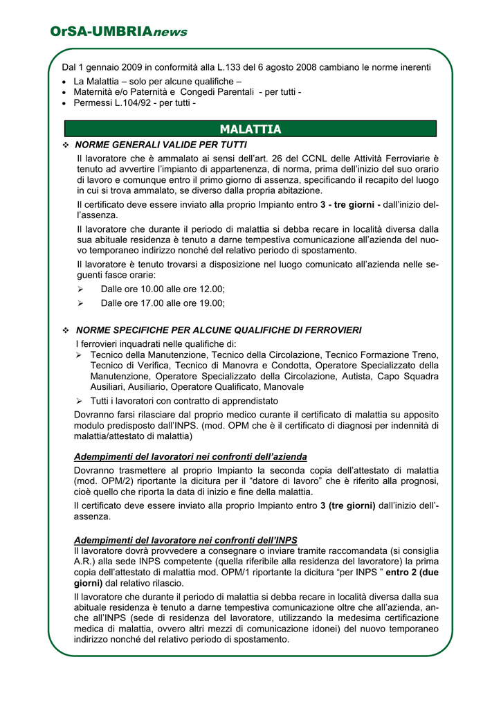 OrSA-UMBRIAnews Dal 1 gennaio 2009 in conformità alla L.133 del 6 agosto 2008 cambiano le norme inerenti • La Malattia – solo per alcune qualifiche – • Maternità e/o Paternità e Congedi Parentali - per tutti • Permessi L.104/92 - per tutti - MALATTIA NORME GENERALI VALIDE PER TUTTI Il lavoratore che è ammalato ai sensi dell’art. 26 del CCNL delle Attività Ferroviarie è tenuto ad avvertire l’impianto di appartenenza, di norma, prima dell’inizio del suo orario di lavoro e comunque entro il primo giorno di assenza, specificando il recapito del luogo in cui si trova ammalato, se diverso dalla propria abitazione. Il certificato deve essere inviato alla proprio Impianto entro 3 - tre giorni - dall’inizio dell’assenza. Il lavoratore che durante il periodo di malattia si debba recare in località diversa dalla sua abituale residenza è tenuto a darne tempestiva comunicazione all’azienda del nuovo temporaneo indirizzo nonché del relativo periodo di spostamento. Il lavoratore è tenuto trovarsi a disposizione nel luogo comunicato all’azienda nelle seguenti fasce orarie: Dalle ore 10.00 alle ore 12.00; Dalle ore 17.00 alle ore 19.00; NORME SPECIFICHE PER ALCUNE QUALIFICHE DI FERROVIERI I ferrovieri inquadrati nelle qualifiche di: Tecnico della Manutenzione, Tecnico della Circolazione, Tecnico Formazione Treno, Tecnico di Verifica, Tecnico di Manovra e Condotta, Operatore Specializzato della Manutenzione, Operatore Specializzato della Circolazione, Autista, Capo Squadra Ausiliari, Ausiliario, Operatore Qualificato, Manovale Tutti i lavoratori con contratto di apprendistato Dovranno farsi rilasciare dal proprio medico curante il certificato di malattia su apposito modulo predisposto dall’INPS. (mod. OPM che è il certificato di diagnosi per indennità di malattia/attestato di malattia) Adempimenti del lavoratori nei confronti dell’azienda Dovranno trasmettere al proprio Impianto la seconda copia dell’attestato di malattia (mod. OPM/2) riportante la dicitura per il “datore di lavoro” che è riferito alla prognosi, cioè quello che riporta la data di inizio e fine della malattia. Il certificato deve essere inviato alla proprio Impianto entro 3 (tre giorni) dall’inizio dell’assenza. Adempimenti del lavoratore nei confronti dell’INPS Il lavoratore dovrà provvedere a consegnare o inviare tramite raccomandata (si consiglia A.R.) alla sede INPS competente (quella riferibile alla residenza del lavoratore) la prima copia dell’attestato di malattia mod. OPM/1 riportante la dicitura “per INPS ” entro 2 (due giorni) dal relativo rilascio. Il lavoratore che durante il periodo di malattia si debba recare in località diversa dalla sua abituale residenza è tenuto a darne tempestiva comunicazione oltre che all’azienda, anche all’INPS (sede di residenza del lavoratore, utilizzando la medesima certificazione medica di malattia, ovvero altri mezzi di comunicazione idonei) del nuovo temporaneo indirizzo nonché del relativo periodo di spostamento. OrSA-UMBRIAnews MATERNITÀ/PATERNITÀ e CONGEDO PARENTELE Per quanto riguarda il congedo di maternità e/o paternità (sia esso ordinario, anticipato o prorogato) e congedo parentale dal 01 Gennaio 2009 i lavoratori sono tenuti obbligatoriamente ad attenersi alle procedure INPS. Pertanto i lavoratori interessati ad usufruire dei benefici di legge previsti per le motivazioni di cui sopra in base alla normativa vigente dovranno inoltrare domanda all’INPS territorialmente competente, in conformità alle indicazioni dell’INPS ed utilizzando esclusivamente la modulistica INPS. Una copia della richiesta redatta sulla suddetta modulistica debitamente vidimata dall’INPS va restituita all’Impianto appartenenza. La modulistica che varia in relazione alla tipologia di richiesta è disponibile presso le sedi INPS o OrSA oppure è reperibile sul sito ufficiale internet www.inps.it.: modello SR01 (congedo di maternità e/o paternità) modello SR23 (congedo parentale) Ex LEGGE 104 /1992 I lavoratori che intendano usufruire dei benefici previsti dalla ex Legge 104/92 devono presentare domanda all’INPS, sede della propria residenza, utilizzando la prescritta modulistica corredata dalla documentazione necessaria, consegnando copia della domanda al proprio Impianto. Dal 01 Gennaio 2009 è demandata alle sedi INPS la verifica della regolarità delle richieste presentate relativamente ai requisiti previsti di legge necessari per l’accoglimento delle stesse e non più al datore di lavoro. La modulistica che varia in relazione alla tipologia di richiesta è disponibile presso le sedi INPS o OrSA oppure è reperibile sul sito ufficiale internet www.inps.it.: Modello SR07 (permessi genitori o affidatari di minori disabili) Modello SR08 (permessi: - genitori di portatori di Handicap maggiori di 3 anni - Parenti o affini entro il 3°grado di persone < di 3 anni - Coniugi) Modello SR09 (permessi per l’anno portatori di Handicap che lavorano) Modello SR10 (congedo straordinario per genitori con figli o affidati con disabilità grave) Modello SR11 (congedo straordinario per fratello o sorella di una persona con grave disabilità) Modello SR64 (congedo straordinario per il coniuge di una persona con disabilità grave)