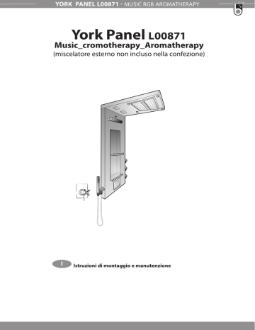 YORK PANEL L00871 - MUSIC RGB AROMATHERAPY York Panel L00871 Music_cromotherapy_Aromatherapy (miscelatore esterno non incluso nella confezione) I Istruzioni di montaggio e manutenzione YORK PANEL L00871 - MUSIC RGB AROMATHERAPY 7V 6 14 7 22 23 1 5 16 21 2 4 18 1a 14 3 20 19 17 9 12 2 8 13 15 11 6 220 -230V 2 10 YORK PANEL L00871 - MUSIC RGB AROMATHERAPY Componenti I 1/1a) Telaio a muro superiore 2) Viti e tasselli di fissaggio Ø 6 3) Copertura colonna inferiore 4) LED 5) Centralina 6) Viti per fissaggio soffione e copertura 7) Coperchio soffione 8) Flessibile di collegamento alla presa acqua 9) Presa acqua 10) Flessibile per doccia 11) Doccia di servizio 12) Ripiani 13) Trasformatore 14) Scatola a tre moduli 15) Tastiera di comando 16)Altoparlanti 17) Jack - collegamento per lettore musicale 18) Contenitore aroma 19) Vite di bloccaggio 20) antina per ispezione 21) Connettore con Fusibile 22) Cavo di collegamento 7V da 5m (disponibile a richiesta con lunghezza diversa) 23) Filtro elettromagnetico LEGGERE ATTENTAMENTE IL PRESENTE LIBRETTO DI INSTALLAZIONE E MANUTENZIONE. READ THIS INSTALLATION AND CARE MANUAL CAREFULLY. DIE VORLIEGENDE MONTAGE- UND WARTUNGSANLEITUNG AUFMERKSAM DURCHLESEN. LIRE ATTENTIVEMENT CETTE NOTICE D’INSTALLATION ET D'ENTRETIEN. LEA ATENTAMENTE ESTE MANUAL DE INSTALACIÓN Y MANTENIMIENTO.READ THIS ВНИМАТЕЛЬНО ПРОЧИТАТЬ ИНСТРУКЦИЮ ПРЕЖДЕ, ЧЕМ ПРИСТУПАТЬ К УСТАНОВКЕ INDOSSARE GUANTI DI PROTEZIONE. WEAR PROTECTIVE GLOVES. SCHUTZHANDSCHUHE TRAGEN. UTILISER DES GANTS DE PROTECTION. UTILICE GUANTES DE PROTECCIÓN. ИСПОЛЬЗОВАТЬ ЗАЩИТНЫЕ ПЕРЧАТКИ 3 YORK PANEL L00871 - MUSIC RGB AROMATHERAPY 280 114 110 Scatola 1000 3 moduli 5 Entrata Acqua ±10 150 1950 5 1187 1050 1100 4 2000 ALTEZZA IDEALE Area disponibile per presa acqua 300 Minimo Water Inlet 50 Rubinetto 1050 2000 YORK PANEL L00871 - MUSIC RGB AROMATHERAPY 5 YORK PANEL L00871 - MUSIC RGB AROMATHERAPY 14 ø20 ø20 9 7V 220 V 190 70 190 6 14 YORK PANEL L00871 - MUSIC RGB AROMATHERAPY Orientable Spray 7 YORK PANEL L00871 - MUSIC RGB AROMATHERAPY 8 YORK PANEL L00871 - MUSIC RGB AROMATHERAPY 7v 14 17 13 7V 0 22 0V 3 -2 9 YORK PANEL L00871 - MUSIC RGB AROMATHERAPY 13 V 0 3 7V -2 0 2 2 23 INPUT VCA OUT 7VDC 10 220-230V 7V YORK PANEL L00871 - MUSIC RGB AROMATHERAPY 220-230V INPUT VCA OUT 7VDC 220-230V 7V 7V 23 11 YORK PANEL L00871 - MUSIC RGB AROMATHERAPY LL U P LL U P OUT 7VDC ! O N 7V INPUT VCA OUT 7VDC 12 OK 220-230V INPUT VCA YORK PANEL L00871 - MUSIC RGB AROMATHERAPY 13 13 YORK PANEL L00871 - MUSIC RGB AROMATHERAPY 1 3 9 8 15 14 YORK PANEL L00871 - MUSIC RGB AROMATHERAPY A B D D 6 D D 15 YORK PANEL L00871 - MUSIC RGB AROMATHERAPY 6 7 6 16 YORK PANEL L00871 - MUSIC RGB AROMATHERAPY 17 YORK PANEL L00871 - MUSIC RGB AROMATHERAPY 19 1 20 2 18 3 4 6 5 7 18 YORK PANEL L00871 - MUSIC RGB AROMATHERAPY 19 YORK PANEL L00871 - MUSIC RGB AROMATHERAPY Premessa introduttiva Per l’installazione ideale, la colonna deve essere ad un’altezza di circa 2000 mm da terra. (Intendendo la distanza compresa tra il lato inferiore del soffione ed il piatto doccia) indicare (Pag. 5/6) La Portata consigliata per un buon funzionamento è di 14litri al minuto. Il miscelatore non è incluso nella confezione. I Il pannello York in acciaio inox è composto da : -3 funzioni doccia gestite da tre comandi manuali collocati lateralmente • Soffione con doppio getto pioggia autopulente e orientabile • Soffione con getto cascata orientabile • Doccia di servizio -3 funzioni sensoriali gestite elettronicamente da una tastiera comandi. •Cromoterapia -al primo tocco si attiva il ciclo con cambio colore -il secondo tocco blocca il ciclo sul colore visualizzato -al terzo tocco si spegne il sistema Nel caso non vengano trasmessi comandi al sistema è prevista una funzione di Time-Out che spegne il dispositivo dopo 30 minuti circa. • Musicoterapica Attiva e disattiva la funzione audio permettendo la regolazione del volume • Aroma terapia Al tocco della tastiera si attiva una singola nebulizzazione Predisposizione Attenzione ! Realizzare il punto esatto della presa acqua nell’area (inferiore) indicata nel disegno (Pag. 4) Predisporre una scatola a tre moduli 14 nell’area (superiore) indicata nel disegno (Pag. 4) È consigliabile eseguire queste due operazioni con l’ausilio del telaio posizionato a muro . Collocare all’esterno della doccia una scatola a tre moduli (14) per il collegamento audio H1100mm ed una scatola di derivazione (190x190x70 non inclusa in confezione) che dovrà accogliere la scatola del trasformatore (13), da installare fuori dalle zone 1 e 2 indicate nella norma CEI 64-8/7, dove verrà alloggiato il trasformatore a 7V ~ / 230V ~ – 50/60 Hz, comprensivo di filtro (13). Per il collegamento di queste scatole utilizzare un tubo corrugato del diametro di 20mm Procedure per l’installazione della colonna: - Verificare appoggiando il telaio a muro 1 e 1a che le aree combacino, con la presa acqua (9) inferiore e la scatola di derivazione (14) superiore. (Pag. 4-6) Procedere con il fissaggio del telaio 1 e 1a, verificando che siano perfettamente a piombo, segnare con una matita in corrispondenza dei fori e procedere con la foratura (punta Ø 6 mm) e l’inserimento dei tasselli (2). (Pag. 8) Infine fissare definitivamente il telaio a muro con le viti (2). (Pag.8) Installare le scatole con il trasformatore (13) e collegamento audio (17) dettaglio (Pag. 9) - Posizionare tutto il blocco della colonna (3) sul telaio (1) e assicurarlo temporaneamente con le viti (6) (Pag.14) Questo serve per lasciare lo spazio necessario per operare nella parte posteriore della colonna. - Eseguire i collegamenti acqua e corrente come indicato (Pag.14-15) - Proseguire con il montaggio definitivo della colonna, sbloccando le viti 6, facendola slittare fino a completa aderenza con la parete. - Fissare definitivamente la colonna avvitando il coperchio superiore (7) e la pa