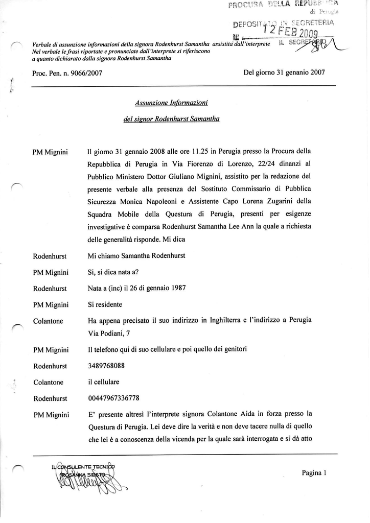 Verbale di assunzione informazioni della signora Rodenhurst Samantha assistita dall'interprete Nel verbale le frasi ri~ortatee uronunciate dall'intewrete si riferiscono a quanto dichhirato dalla signora Rodenhurst ~amantha Del giorno 3 1 genanio 2007 Proc. Pen. n. 906612007 )> i: Assunzione Informazioni del simtor Rodenhurst Samantha PM Mignini I1 giorno 31 gennaio 2008 alle ore 11.25 in Perugia presso la Procura della Repubblica di Perugia in Via Fiorenzo di Lorenzo, 22124 dinanzi al Pubblico Ministero Donor Giuliano Mignini, assistito per la redazione del 7- presente verbale alla presenza del Sostituto Commissario di Pubblica Sicurezza Monica Napoleoni e Assistente Capo Lorena Zugarini della Squadra Mobile della Questura di Perugia, presenti per esigenze investigative 6 comparsa Rodenhurst Samantha Lee Ann la quale a richiesta delle generalith risponde. Mi dica P Rodenhurst Mi chiamo Samantha Rodenhurst PM Mignini Si, si dica nata a? Rodenhurst Nata a (inc) il 26 di gennaio 1987 PM Mignini Si residente Colantone Ha appena precisato il suo indirizzo in Inghilterra e l'indirizzo a Perugia Via Podiani, 7 PM Mignini Il telefono qui di suo cellulare e poi quello dei genitori Rodenhurst 3489768088 Colantone il cellulare Rodenhurst 00447967336778 PM Mignini E' presente altresi l'interprete signora Colantone Aida in forza presso la Questura di Perugia. Lei deve dire la verità e non deve tacere nulla di quello che lei 6 a conoscenza della vicenda per la quale sarh interrogata e si dà atto Pagina 1 p Verbale di assunzione informazioni della signora Rodenhurst Samantha assistita dall'interprete Nel verbale lefrasi riportate e pronunciate dall'interprete si riferiscono a quanto dichiarato dalla signora Rodenhurst Samantha Proc. Pen. n. 906612007 Del giorno 3 1 genanio 2007 che quanto dichiarato viene integralmente registrato. La registrazione inizia alle ore 1 1.26. Colantone ho precisato i suoi doveri di dire la veritti e di non nascondere nulla e le ho comunicato che quindi il presente verbale v e d tutto registrato p P PM Mignini Perfetto. Lei da quanto tempo 6 a Penigia? Rodenhurst da settembre PM Mignini Parla bene questa ragazza Napoleoni E' brava si PM Mignini Da? Rodenhurst Da settembre PM Mignini Si e frequenta I'Erasmus Rodenhurst Si PM Mignini Presso I'universith italiana Rodenhurst Si PM Mignini Di Penigia Rodenhurst Si PM Mignini Ha conosciuto Meredith Kercher? Rodenhurst Si PM Mignini Quando l'ha conosciuta? Colantone Ho conosciuto Meredith in occasione di un incontro importante dell'Erasmus verso la metti di settembre PM Mignini p Dove, con chi era? IL WNSULENT6 TECNICO ROSAMNA SIEST0 Pagina 2 p Verbale di assunzione informazioni della signora Rodenhurst Samantha assistita dall'interprete Nel verbale le frasi riportate e pronunciate dall'interprefesi riferiscono a quanto dichiarato dalla signora Rodenhurst Samantha Del giorno 31 genanio 2007 Proc. Pen. n. 906612007 Colantone Presso l'edificio destinato all'Erasmus, ai corsi Erasmus io ero con il gruppo delle studentesse di Manchester la cin8 dove io studio e anche le ragazze dell'univesità di Leeds P P PM Mignini E di questo gruppo faceva parte anche Meredith? Colantone Si Meredith faceva parte del gruppo di Leeds PM Mignini E chi c'era in questo gruppo di Leeds? Colantone Amy, Robin, Meredith, Lina PM Mignini Lina chi t? Colantone Lina è? PM Mignini Si ma il cognome? Perché non Colantone Magari dicci a chi potremmo chiedere Napoleoni Chiedi se c'era la sera di Halloween PM Mignini C'era la sera di Halloween Colantone No, non l'ha mai vista quella sera PM Mignini E Meredith era con voi, era in gruppo, stava con voi praticamente .... Colantone Stiamo parlando a questo incontro di metà settembre PM Mignini Amanda c'era? Rodenhurst No PM Mignini Poi ha rivisto Meredith altre volte da quella data? Colantone Si eravamo solite uscire insieme come recarci al Merlin's Pub un giorno ... è un nome che non ... siamo andate anche in una grande discoteca il Gradisca PM Mignini P Ah, il Gradisca IL W N M E N T 6 TSCNIW ROSANNA SESTO Pagina 3 p Verbale di assunzione informazioni della signora Rodenhurst Samantha assistita dall'interprete Nel verbale le frasi riportate e pronunciate dall'interprete si rferiscono a quanto dichiarato dalla signora Rodenhurst Samantha Del giorno 31 genanio 2007 P m . Pen. n. 906612007 Colantone insieme... la incontravamo cosi anche in giro al centro di Perugia specialmente di sera usciva con le altre ragazze di Leeds PM Mignini L'ha mai vista con qualche ragazzo? Colantone no. Dice al Merlins pub l'ho vista parlare con un certo Pisco ... un certo Pisco p Napoleoni Il titolare del Merlin PM Mignini Si e... la sera, la sera del 31 ottobre, halloween al sera di halloween voi dove siete andati? Colantone Noi PM Mignini I1 gruppo vostro, il gruppo delle ragazze inglesi era tutto di Manchester .. no di Leeds Rodenhurst E Manchester, e Bristol PM Mignini No di Manchester, c'era un gruppo di ragazze inglesi? Colantone C'era un gruppo di Bristol ha menzionato. Sophie B di Bristol. Di Bristol c'era solo Sophie poi c'era il gruppetto suo di quattro ragazze di Manchester, il gruppo di Leeds cinque e sei ragazzi e di Bristol solo la ... uscivano insieme questi tre gruppi inglesi e lei owiamente usciva con il gruppo di Manchester PM Mignini Oh, ... quindi siete andate la sera di Halloween dove siete andati? Dove avete festeggiato? Colantone Sono andate prima a casa di un'amica e poi si sono andate dapprima al Merlin's Pub e poi al Domus p PM Mignini L'amica chi era? Colantone Helen . Helen la ragazza che B venuta l'altro giorno .. IL WNSULENT6 T6CNIW ROSANNA SESTO Pagina 4 p Verbale di assunzione informazioni della signora Rodenhurst Samantha assistita dall'interprete Nel verbale le frasi riportate e pronunciate dall'interprete si rferiscono a quanto dichiarato dalla signora Rodenhurst Samantha Del giorno 3 1 genanio 2007 Proc. Pen. n. 9066/2007 .. Napoleoni A che ora ha visto Meredith? Colantone L'ho vista al Merlin pub que