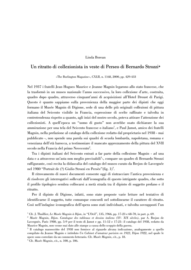 Linda Borean Un ritratto di collezionista in veste di Perseo di Bernardo Strozzi* «The Burlington Magazine», CXLII, n. 1168, 2000, pp. 429-433 Nel 1937 i fratelli Jean Hugues Maurice e Jeanne Magnin legarono allo stato francese, che la trasformò in un museo nazionale l’anno successivo, la loro collezione d’arte, costruita, quadro dopo quadro, attraverso cinquant’anni di acquisizioni all’Hotel Drouot di Parigi. Questo è quanto sappiamo sulla provenienza della maggior parte dei dipinti che oggi formano il Musée Magnin di Digione, sede di una delle più originali collezioni di pittura italiana del Seicento visibile in Francia, espressione di scelte raffinate e talvolta in controtendenza rispetto a quanto, agli inizi del nostro secolo, poteva attirare l’attenzione dei collezionisti. A quell’epoca un “uomo di gusto” non avrebbe osato dichiarare la sua ammirazione per una tela del Seicento francese o italiano1, e Paul Jamot, amico dei fratelli Magnin, nella prefazione al catalogo della collezione redatto dal proprietario nel 1938 - mai pubblicato -, non spende una parola sui quadri di scuola lombarda, napoletana, romana e veneziana dell’età barocca, a testimoniare il mancato apprezzamento della pittura del XVII secolo nella Francia del primo Novecento2. Tra i dipinti italiani del Seicento entrati a far parte della collezione Magnin - ad una data e a attraverso un’asta non meglio precisabili3-, compare un quadro di Bernardo Strozzi raffigurante, così recita la didascalia del catalogo del museo curato da Brejon de Lavergnée nel 1980 “Portrait de (?) Giulio Strozzi en Persèe”(fig. 1)4. Il ritrovamento di nuovi documenti consente oggi di rintracciare l’antica provenienza e di risolvere gli interrogativi sollevati dall’iconografia di questo intrigante quadro, che sotto il profilo tipologico sembra collocarsi a metà strada tra il dipinto di soggetto profano e il ritratto. Per il dipinto di Digione, infatti, sono state proposte varie letture nel tentativo di identificarne il soggetto, tutte comunque concordi nel sottolinearne il carattere di ritratto. Così nell’indagine iconografica dell’opera sono stati individuati, e talvolta sovrapposti l’un 1 Cfr. J. Thuillier, Le Musée Magnin à Dijon, in “L'Oeil”, 135, 1966, pp. 17-23 e 68-70, in part. p. 69. Musée Magnin, Dijon. Catalogue des tableaux et dessins italiens (XV- XIX siècles), par A. Brejon de Lavergnée, Paris 1980, pp. 5-9 per il testo di Jamot e pp. 11-12 e 17-21: il catalogo del 1938, redatto da Maurice Magnin, non venne mai dato alle stampe a causa dello scoppio della guerra. 3 Il catalogo manoscritto del 1938 non fornisce al riguardo alcuna indicazione, analogamente a quello compilato da Jeanne Magnin e intitolato Un Cabinet d’amateur parisien en 1922, Dijon 1922, nel quale le opere sono corredate da un commento letterario. Cfr. Musée Magnin, cit., p. 18. 4 Cfr. Musée Magnin, cit., n. 100, p. 106. 2 all’altro, temi quali Davide con la testa di Golia, trattato frequentemente dallo Strozzi agli inizi del soggiorno lagunare, e di Perseo con quella di Medusa5, mentre nel catalogo del museo del 1980 il quadro viene presentato, seppur con un punto interrogativo, come “Portrait de (?) Giulio Strozzi en Persèe”, sulla base del confronto con alcuni ritratti del poeta, il quale posò per Tiberio Tinelli (Firenze, Galleria degli Uffizi, fig. 2) e per lo stesso Bernardo Strozzi6. Le fattezze del letterato restituiteci da queste immagini non combaciano, però, con i tratti del personaggio raffigurato nel Perseo del Musée Magnin né con quelli, come proposto invece dalla Mortari, del cardinale Federico Corner conservato nel Museo Correr di Venezia7. Se, nel primo caso, il volto tondeggiante, le guance rosate, il mento sporgente e i baffi all’insù – allora probabilmente di moda - di Giulio Strozzi rivelano delle affinità con il personaggio ritratto nel dipinto del museo francese, il taglio degli occhi e lo sguardo si rivelano sensibilmente differenti dagli occhi attenti e dall’aria di voluto compiacimento con cui il protagonista del Perseo si atteggia di fronte al pittore. A sfavore di un’identificazione del quadro del Musée Magnin con l’effigie di Giulio Strozzi si aggiunge anche l’età del poeta che, essendo nato nel 1583, avrebbe avuto circa una cinquantina d’anni all’epoca in cui si fece riprendere dal Prete Genovese in un ritratto di cui il dipinto oggi nell’Ashmolean Museum di Oxford costituirebbe una copia, recante la data 16358. Il volto del personaggio del quadro del Musée Magnin, invece, appartiene a quello di un uomo più giovane, sulla trentina. 5 Nella scheda del catalogo manoscritto del museo del 1938, n. 487, che ho potuto leggere grazie alla cortesia della dr. Laure Starcky, il quadro compare come Goliath vainquer de David (deux portraits): l’autore sottolinea come “cette étrange désignation correspond à la différence d’ages, ici inverse des donnée de sujet biblique”. Thuillier, invece, così commenta il dipinto, titolato Portrait d'homme en Persée: “On voyait ici un David avec la tête de Goliath: il s’agit en fait d’un portrait mythologique, où Strozzi mêle rèalisme et travesti avec assez de maladresse pour qu’on le soupçonne d’un rien d’humour aux dépense de son modèle”. Cfr. Thuillier, Le Musée, cit., n. 5, p. 18. 6 Musée Magnin, cit., n. 100, pp. 106-107; L. Mortari, Bernardo Strozzi, Roma 1995, n. 485, p. 189; Gli Uffizi. Catalogo generale, Firenze 1980, n. 1699, p. 542: il quadro di Tinelli, già nella collezione di Paolo del Sera a Venezia (1672), venne lasciato da quest’ultimo a titolo di legato al cardinale Leopoldo dei Medici, nell’inventario della cui eredità compare con titolo e attribuzione attuali. Cfr. Il Cardinal Leopoldo. Rapporti con il mercato veneto, a cura di M. Fileti Mazza, Milano-Napoli 1987, I, pp. 49 e 55. 7 Mortari, Bernardo Strozzi, cit., 1995, n. 485, p. 189 e n. 37, p. 218. Federico Co