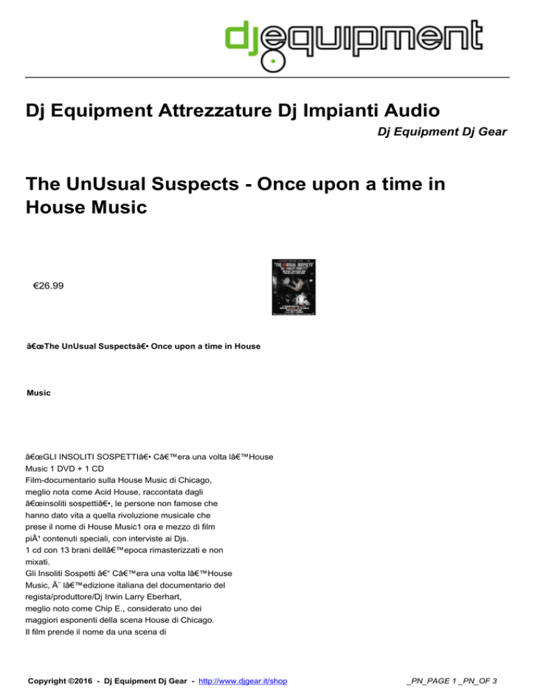 Dj Equipment Attrezzature Dj Impianti Audio Dj Equipment Dj Gear The UnUsual Suspects - Once upon a time in House Music €26.99 “The UnUsual Suspects― Once upon a time in House Music “GLI INSOLITI SOSPETTI― C’era una volta l’House Music 1 DVD + 1 CD Film-documentario sulla House Music di Chicago, meglio nota come Acid House, raccontata dagli “insoliti sospetti―, le persone non famose che hanno dato vita a quella rivoluzione musicale che prese il nome di House Music1 ora e mezzo di film più contenuti speciali, con interviste ai Djs. 1 cd con 13 brani dell’epoca rimasterizzati e non mixati. Gli Insoliti Sospetti – C’era una volta l’House Music, è l’edizione italiana del documentario del regista/produttore/Dj Irwin Larry Eberhart, meglio noto come Chip E., considerato uno dei maggiori esponenti della scena House di Chicago. Il film prende il nome da una scena di Copyright ©2016 - Dj Equipment Dj Gear - http://www.djgear.it/shop _PN_PAGE 1 _PN_OF 3 Casablanca. Chip E. sostiene che la maggior parte dei racconti sulla storia della House Music, ruoti spesso e volentieri intorno ai personaggi più famosi, in questo film viene invece riportato il punto di vista delle persone meno popolari, quelle che erano dietro alle quinte. Obiettivo del regista Chip Eberhart è quello di tracciare un percorso storico, raccontato dagli “insoliti sospetti―, cioè le persone non famose che hanno comunque dato vita a quella rivoluzione musicale che prese il nome di House Music. Gli “insoliti sospetti― sono quelli che hanno combattuto in prima linea, quelli che hanno organizzato i party, quelli che hanno creato e classificato il genere musicale House music. Il documentario si sviluppa in 12 capitoli: Capitolo 1: “Cos’è la House music?― – Viene definito il genere House music Capitolo 2: “Prima del Warehouse― – Uno sguardo alla Disco, madre delle House music Capitolo 3: “Il Warehouse― – Come nacque il club Capitolo 4: “I tempi del liceo― – Gli Insoliti sospetti raccontano come organizzavano i primi party Capitolo 5: “Documenti falsi― – Quando i clubbers erano minorenni Capitolo 6: “Il Loft― – Il Loft di Chicago, il club Capitolo 7: “Hot Mix 5― – I mitici Hot Mix 5 fecero della House music un fenomeno di massa Capitolo 8: “Le produzioni House― – La rivoluzione musicale, i pionieri, la miscela di US Disco e Italian Electro-Disco. Capitolo 9: “Music Box― – Storico club di Chicago, raccontato del suo fondatore Ron Hardy Capitolo 10: “La musica e il sesso― – Come la musica influenzò la sessualità Capitolo 11: “Le droghe― – Racconti sull’uso di droghe Capitolo 12: “Il futuro della House Music― – Diversi punti di vista Scopriremo in questo documentario, come nacquero termini come Jackin’ House, Acid House, House Music. E’ lo stesso Chip E. a raccontare un simpatico aneddoto di quando lavorava in un negozio di dischi di Chicago. Frankie Knuckles suonava all’epoca al Warehouse, storico club che diede nome alla House Music; in molti si recavano ai negozi chiedendo di “quei dischi suonati da Frankie―. I commessi, fra i quali un giovanissimo Chip E., attaccavano quindi adesivi con scritto: “Disco suonato al Warehouse―, così facendo le vendite dei dischi andavano alle stelle, la parola Warehouse fu poi abbreviata in House, si iniziò a chiedere di quei “Dischi suonati allo House―. Tutti iniziarono a parlare di House. Chip E. nacque a Chicago, iniziò la carriera di Dj nel 1982; nell’85 fu dichiarato dal “Street Mix― magazine “The Godfather of House Music― (Il Padrino della musica House). Fra le sue produzioni ricordiamo “It’s House―, primo disco ad usare il termine House, e “Time 2 Jack―, sulla mitica etichetta Jack Traxxx, cherappresentò in tutto il mondo la Acid House. Il documentario, o anche Housementario (come lo chiama Chip E.), è frutto di 5 anni di duro Copyright ©2016 - Dj Equipment Dj Gear - http://www.djgear.it/shop _PN_PAGE 2 _PN_OF 3 lavoro, fatto di ricerche, interviste e viaggi in tutto il mondo, Roma, Londra, Los Angeles, Bruxelles.. Chip E. lo definisce un “our-story― non un “his-story― della House Music, si racconta la storia dal punto di vista di molti, non vi è un unico narratore, i “tutti― sono quelli che non “sospetti― , sono i “tutti― che hanno contribuito in maniera importante all’evolversi della scena musicale di Chicago. Comunque non appaiono solo gli sconosciuti/insoliti sospetti, ci sono anche i soliti sospetti: Frankie Knuckles, Farley “Jackmaster― Funk, Ralphi Rosario, Steve Hurley, Joe Smooth, Jesse Saunders, Loleatta Holloway, Robert Owens, Larry Heard aka “Mr Fingers―, Robert Williams, Victor Simonelli e molti altri. “Gli Insoliti Sospetti è un progetto corposo e comunicativo, imperfetto e dirompente, proprio come la prima house di Chicago― (Andrea Benedetti) - il film “Gli InSoliti Sospetti, C’era una volta l’House Music― regia di Chip E - durata: 1 ora e 30 minuti -Contenuti speciali – durata: 22 minuti - Andre Hatchet - Chip E. - Farley ―Jackmaster― Funk - Marshall Jefferson, Adonis & Chip E. - Ralphi “Rockin― Rosario - Video Clip “I wanna see you freak (Like dis)― Cassio Ware, Chip E. & The O.G.s DISCO CD AUDIO – durata TOT. 76:17 01 Love Stealin' - 6.27 (Music & Lyrics Chip E. - Produced by Chip E.) 02 Time to Jack - The Acid Remix - 4.35 (Music & Lyrics Chip E. -   Produced by Chip E. additional production by Andre Henderson) 03 Spank da House - Remix - 6.06 (Music & Lyrics by J.BoHorne -   Remix by Chip E. & House People) 04 If You Only Knew 2K - 5.33 (Music & Lyrics Chip E. & Lady Mia -   Produced by Chip E.) 05 Nouse - Instrumental - 5.11 (Music & Lyrics Chip E. -   Produced by Chip E.) 06 Like This - Original - 8.01 (Music by Chip E. Lyrics by K-Joy -   Produced by Chip E.) 07 Time to Jack RMX - Dogs Barking - 7.11 (Music & Lyrics Chip E.    Produced by 