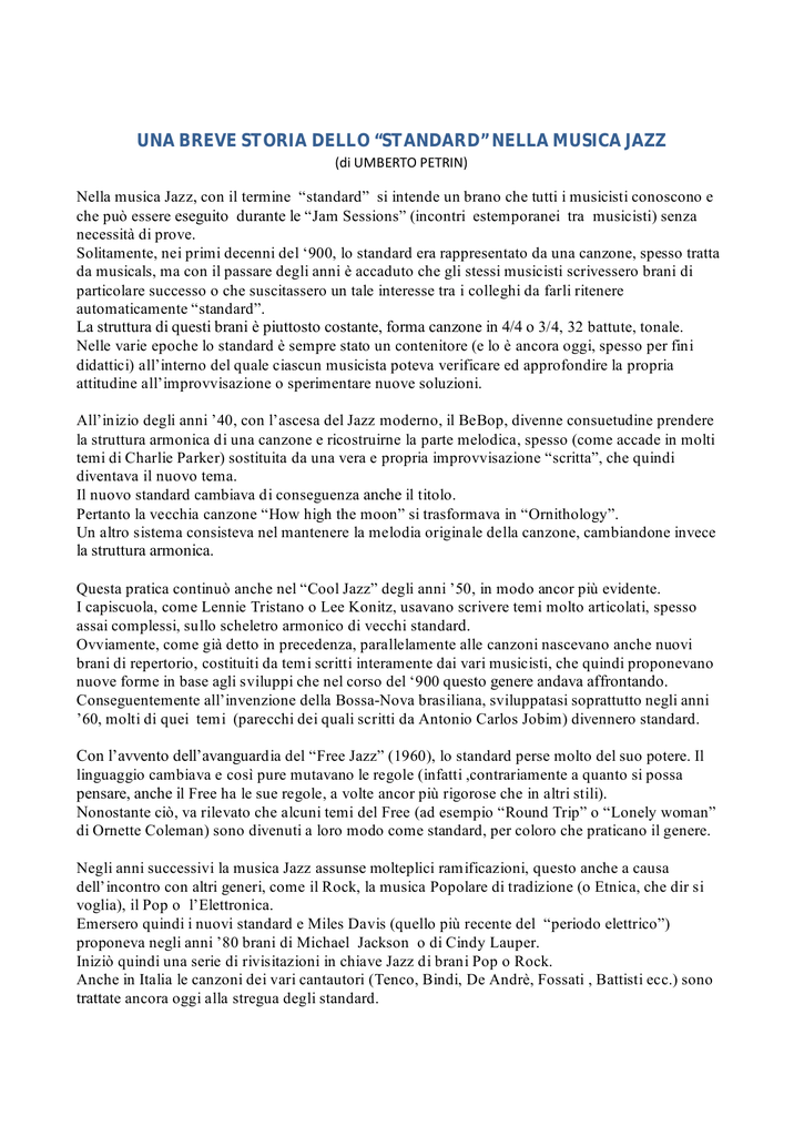 UNA BREVE STORIA DELLO “STANDARD” NELLA MUSICA JAZZ (di UMBERTO PETRIN) Nella musica Jazz, con il termine “standard” si intende un brano che tutti i musicisti conoscono e che può essere eseguito durante le “Jam Sessions” (incontri estemporanei tra musicisti) senza necessità di prove. Solitamente, nei primi decenni del ‘900, lo standard era rappresentato da una canzone, spesso tratta da musicals, ma con il passare degli anni è accaduto che gli stessi musicisti scrivessero brani di particolare successo o che suscitassero un tale interesse tra i colleghi da farli ritenere automaticamente “standard”. La struttura di questi brani è piuttosto costante, forma canzone in 4/4 o 3/4, 32 battute, tonale. Nelle varie epoche lo standard è sempre stato un contenitore (e lo è ancora oggi, spesso per fini didattici) all’interno del quale ciascun musicista poteva verificare ed approfondire la propria attitudine all’improvvisazione o sperimentare nuove soluzioni. All’inizio degli anni ’40, con l’ascesa del Jazz moderno, il BeBop, divenne consuetudine prendere la struttura armonica di una canzone e ricostruirne la parte melodica, spesso (come accade in molti temi di Charlie Parker) sostituita da una vera e propria improvvisazione “scritta”, che quindi diventava il nuovo tema. Il nuovo standard cambiava di conseguenza anche il titolo. Pertanto la vecchia canzone “How high the moon” si trasformava in “Ornithology”. Un altro sistema consisteva nel mantenere la melodia originale della canzone, cambiandone invece la struttura armonica. Questa pratica continuò anche nel “Cool Jazz” degli anni ’50, in modo ancor più evidente. I capiscuola, come Lennie Tristano o Lee Konitz, usavano scrivere temi molto articolati, spesso assai complessi, sullo scheletro armonico di vecchi standard. Ovviamente, come già detto in precedenza, parallelamente alle canzoni nascevano anche nuovi brani di repertorio, costituiti da temi scritti interamente dai vari musicisti, che quindi proponevano nuove forme in base agli sviluppi che nel corso del ‘900 q uesto genere andava affrontando. Conseguentemente all’invenzione della Bossa-Nova brasiliana, sviluppatasi soprattutto negli anni ’60, molti di quei temi (parecchi dei quali scritti da Antonio Carlos Jobim) divennero standard. Con l’avvento dell’avanguardia del “Free Jazz” (1960), lo standard perse molto del suo potere. Il linguaggio cambiava e così pure mutavano le regole (infatti ,contrariamente a quanto si possa pensare, anche il Free ha le sue regole, a volte ancor più rigorose che in altri stili). Nonostante ciò, va rilevato che alcuni temi del Free (ad esempio “Round Trip” o “Lonely woman” di Ornette Coleman) sono divenuti a loro modo come standard, per coloro che praticano il genere. Negli anni successivi la musica Jazz assu nse molteplici ramificazioni, questo anche a causa dell’incontro con altri generi, come il Rock, la musica Popolare di tradizione (o Etnica, che dir si voglia), il Pop o l’Elettronica. Emersero quindi i nuovi standard e Miles Davis (quello più recente del “periodo elettrico”) proponeva negli anni ’80 brani di Michael Jackson o di Cindy Lauper. Iniziò quindi una serie di rivisitazioni in chiave Jazz di brani Pop o Rock. Anche in Italia le canzoni dei vari cantautori (Tenco, Bindi, De Andrè, Fossati , Battisti ecc.) sono trattate ancora oggi alla stregua degli standard. UNA SINTETICA STORIA DEL JAZZ : LE ORIGINI Per la sua struttura e il suo tipico ritmo in 2/4, certamente il ragtime è da considerare come una prima forma embrionale di jazz. Sviluppatosi a cavallo tra l’800 e il 900, ebbe come suo principale esponente il leggendario Scott Joplin. Ma la patria del jazz fu indubbiamente New Orleans . Da lì provengono pionieri come Jelly Roll Morton, Joe “King” Oliver e Buddy Bolden che dopo aver formato una banda nel 1895 viene considerato il primo jazzista della storia. Un ruolo predominante lo ebbe il quartiere di Storyville che tra il 1986 e il 1917 fu teatro di delinquenza, di prostituzione e di una nuova musica che veniva suonata in ogni locale e in ogni angolo di strada. Probabilmente è a questo che si deve la pessima reputazione che nei primi tempi aleggiava sul jazz. Negli anni ‘10 e ‘20 la migrazione degli afroamericani nelle città del nord porta molto rapidamente alla sua diffusione ma per ironia della sorte, nel 1917 il primo disco jazz ad essere pubblicato è ad opera di un complesso composto da soli bianchi. Si tratta di “Livery Stable Blues” dell’ Original Dixieland Jass Band. Gli anni ‘20 vedono la definitiva affermazione del jazz anche grazie a musicisti come Louis Armstrong, il primo a rendere predominante la figura del solista e Fletcher Henderson, pianista fondamentale nel divulgare il ruolo di leader e arrangiatore di un’orchestra. Nel frattempo, le prime tourneé concertistiche in Europa contribuiscono notevolmente alla diffusione del suo verbo oltreoceano. L’ascesa del jazz è inarrestabile. Viene celebrata in letteratura come nel caso de “ Il grande Gatsby” (1925) di Francis Scott Fitzgerald, e viene sublimata al cinema con “ Il cantante di jazz” (1927), il primo film sonoro della storia diretto da Alan Crosland e interpretato da Al Jolson. E diviene da subito oggetto di studi con André Schaeffner, musicologo francese che nel 1926 pubblica un libro dal titolo inequivocabile: “ Le jazz“. Verso la fine degli anni ‘20 e fino ai ‘40 si distinguono le big band dirette da musicisti come Benny Goodman, Artie Shaw, Duke Ellington, Count Basie e Glenn Miller. Il successo di questi complessi allargati consente da un lato di mettere in luce molti solisti dotati e dall’altro di accompagnare la diffusione di nuovi balli. Il più celebre di questi balli fu di gran lunga lo swing (che porta l’accento ritmico sul secondo e sul quarto tempo della battuta) tant’è che per riferirsi a quel periodo si parla comunemente di 