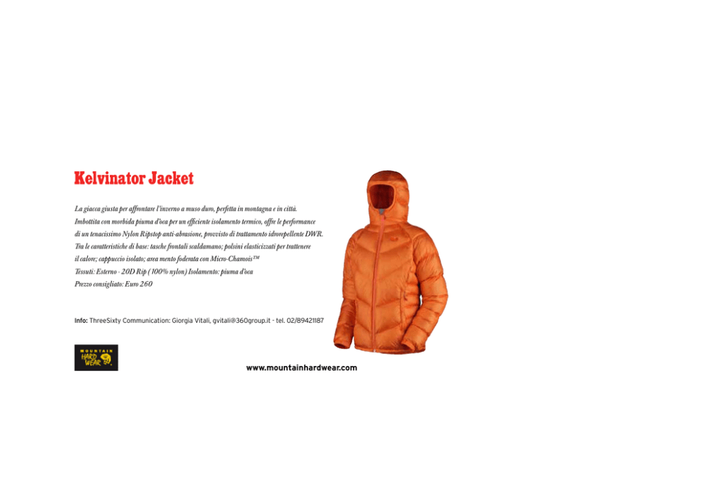 Kelvinator Jacket La giacca giusta per affrontare l’inverno a muso duro, perfetta in montagna e in città. Imbottita con morbida piuma d’oca per un efficiente isolamento termico, offre le performance di un tenacissimo Nylon Ripstop anti-abrasione, provvisto di trattamento idrorepellente DWR. Tra le caratteristiche di base: tasche frontali scaldamano; polsini elasticizzati per trattenere il calore; cappuccio isolato; area mento foderata con Micro-Chamois™ Tessuti: Esterno - 20D Rip (100% nylon) Isolamento: piuma d’oca Prezzo consigliato: Euro 260 Info: ThreeSixty Communication: Giorgia Vitali, [email protected] - tel. 02/89421187 www.mountainhardwear.com