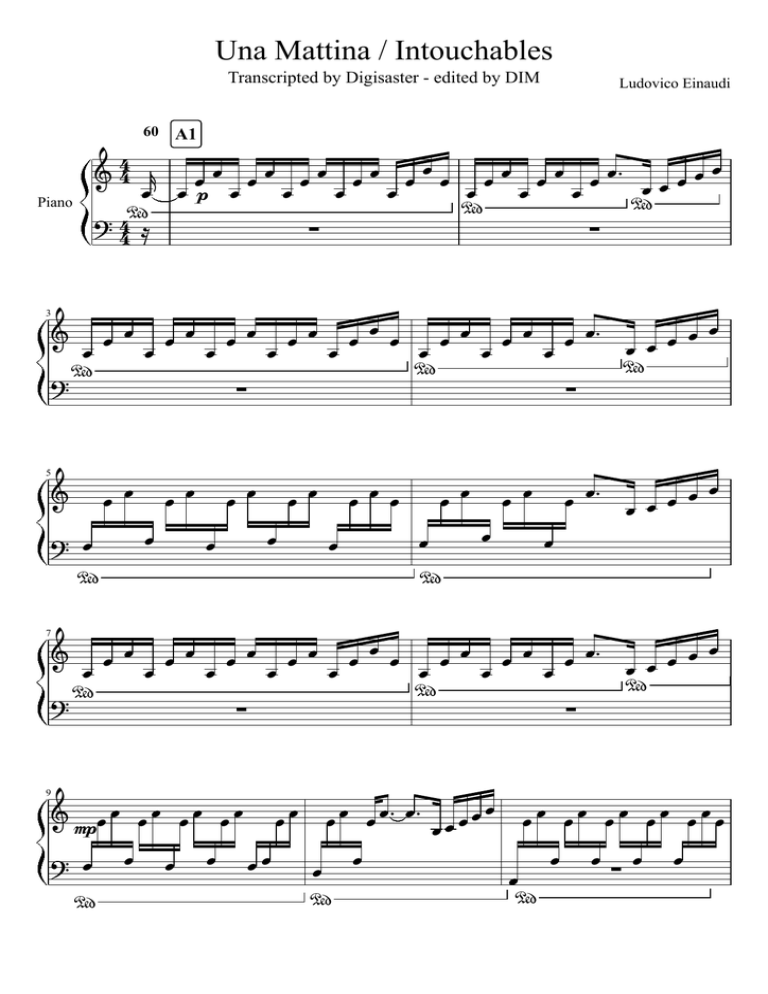Una Mattina / Intouchables Transcripted by Digisaster - edited by DIM 60 Ludovico Einaudi A1 44 p 4 4 Piano 3 5 7 9 mp B 12 15 17 continue 19 C 2. time go to End 21 2 23 25 27 30 32 mp 3 35 Go to B End 37 38 41 4 ritt.