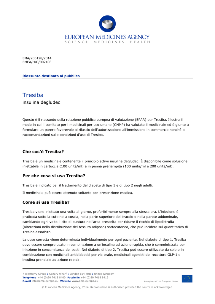 EMA/206128/2014 EMEA/H/C/002498 Riassunto destinato al pubblico Tresiba insulina degludec Questo è il riassunto della relazione pubblica europea di valutazione (EPAR) per Tresiba. Illustra il modo in cui il comitato per i medicinali per uso umano (CHMP) ha valutato il medicinale ed è giunto a formulare un parere favorevole al rilascio dell’autorizzazione all’immissione in commercio nonché le raccomandazioni sulle condizioni d’uso di Tresiba. Che cos’è Tresiba? Tresiba è un medicinale contenente il principio attivo insulina degludec. È disponibile come soluzione iniettabile in cartuccia (100 unità/ml) e in penna preriempita (100 unità/ml e 200 unità/ml). Per che cosa si usa Tresiba? Tresiba è indicato per il trattamento del diabete di tipo 1 e di tipo 2 negli adulti. Il medicinale può essere ottenuto soltanto con prescrizione medica. Come si usa Tresiba? Tresiba viene iniettato una volta al giorno, preferibilmente sempre alla stessa ora. L’iniezione è praticata sotto la cute nella coscia, nella parte superiore del braccio o nella parete addominale, cambiando ogni volta il sito di puntura nell’area prescelta per ridurre il rischio di lipodistrofia (alterazioni nella distribuzione del tessuto adiposo) sottocutanea, che può incidere sul quantitativo di Tresiba assorbito. La dose corretta viene determinata individualmente per ogni paziente. Nel diabete di tipo 1, Tresiba deve essere sempre usato in combinazione a un’insulina ad azione rapida, che è somministrata per iniezione in concomitanza dei pasti. Nel diabete di tipo 2, Tresiba può essere utilizzato da solo o in combinazione con medicinali antidiabetici per via orale, medicinali agonisti del recettore GLP-1 e insulina prandiale ad azione rapida. 7 Westferry Circus ● Canary Wharf ● London E14 4HB ● United Kingdom Telephone +44 (0)20 7418 8400 Facsimile +44 (0)20 7418 8416 E-mail [email protected] Website www.ema.europa.eu An agency of the European Union © European Medicines Agency, 2014. Reproduction is authorised provided the source is acknowledged. Come agisce Tresiba? Il diabete è una malattia in cui l’organismo non produce abbastanza insulina per controllare il livello del glucosio nel sangue o non è in grado di utilizzare l’insulina in modo efficace. Tresiba è un’insulina sostitutiva molto simile all’insulina prodotta dall’organismo. Il principio attivo di Tresiba, l’insulina degludec, viene ottenuto con il metodo della “tecnologia del DNA ricombinante”: è prodotto da cellule di lievito nelle quali è stato introdotto un gene (DNA) che le rende capaci di svolgere tale funzione. L’insulina degludec è leggermente diversa rispetto all’insulina umana: viene assorbita con maggiore lentezza dall’organismo e impiega più tempo per raggiungere il bersaglio. Ciò significa che Tresiba ha una lunga durata d’azione. L’insulina di sostituzione agisce come l'insulina naturale e favorisce la penetrazione del glucosio nelle cellule a partire dal sangue. Controllando il livello di glucosio nel sangue, riduce i sintomi e le complicanze del diabete. Quali studi sono stati effettuati su Tresiba? Tresiba è stato esaminato in tre studi principali su 1 578 pazienti con diabete di tipo 1. Tresiba (in combinazione con insulina prandiale ad azione rapida) è stato confrontato con insulina glargina o insulina detemir (altre insuline ad azione prolungata). In altri sei studi principali su 4 076 pazienti con diabete di tipo 2 Tresiba è stato confrontato con insulina glargina, insulina detemir o sitagliptina (un medicinale assunto per via orale nel trattamento del diabete di tipo 2). Ai pazienti coinvolti in questi studi potevano anche essere somministrati altri medicinali antidiabetici o l’insulina ad azione rapida in concomitanza dei pasti se necessario. In un altro studio principale su 177 pazienti con diabete di tipo 2 è stata esaminata l’efficacia della combinazione di Tresiba e liraglutide (un agonista del recettore GLP-1). In tutti gli studi è stato misurato il livello ematico di una sostanza denominata emoglobina glicosilata (HbA1c), che è la percentuale dell’emoglobina presente nel sangue legata al glucosio. L’HbA1c è un indicatore dell’efficacia del controllo del glucosio nel sangue. Gli studi hanno avuto una durata di sei mesi o un anno. Quali benefici ha mostrato Tresiba nel corso degli studi? Gli studi hanno mostrato che Tresiba è efficace almeno quanto altre insuline ad azione prolungata nel controllare i livelli di glucosio nel sangue nei pazienti con diabete di tipo 1 e di tipo 2 ed è più efficace di sitagliptina nei pazienti con diabete di tipo 2. Nei vari studi la riduzione media dei livelli di HbA1c con il trattamento a base di Tresiba è stata di 0,6 punti percentuali nei pazienti con diabete di tipo 1 e di 1,2 punti nei pazienti con diabete di tipo 2. Qual è il rischio associato a Tresiba? L’effetto indesiderato più comune (che può riguardare più di 1 persona su 10) segnalato durante il trattamento con Tresiba è l’ipoglicemia (bassi livelli di glucosio nel sangue). Per l'elenco completo degli effetti indesiderati e delle restrizioni rilevati con Tresiba, vedere il foglio illustrativo. Tresiba EMA/206128/2014 Pagina 2/3 Perché è stato approvato Tresiba? Il CHMP ha deciso che Tresiba è efficace nel controllare i livelli di glucosio nel sangue nei pazienti con diabete di tipo 1 e di tipo 2. Quanto alla sicurezza, il comitato ha concluso che, in generale, Tresiba è sicuro e che i suoi effetti indesiderati sono paragonabili a quelli di altri analoghi dell’insulina, in assenza di segnalazioni di effetti indesiderati inattesi. Si è osservato inoltre che Tresiba riduce il rischio di ipoglicemia nelle ore notturne nei pazienti con diabete di tipo 1 e di tipo 2. Il CHMP ha rilevato che la formulazione di Tresiba con il dosaggio più alto risponde a un’esigenza medica per i pazienti che necessitano di una dose più elevata di insulina (per esempio, i