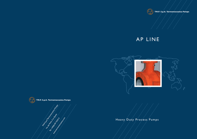 Termomeccanica Pompe AP Line Il gruppo Termomeccanica: tradizione, tecnologia ed innovazione Termomeccanica group : history, technology, innovation Termomeccanica S.p.A è stata fondata a La Spezia nel 1912, come “Società Cerpelli & C.” La Società progettava, costruiva e commercializzava macchine rotanti di vario genere, quali piccole turbine a vapore, compressori centrifughi ed alternativi per il processo e per la refrigerazione pompe a viti, pompe centrifughe per applicazioni navali, industriali, acquedotti, irrigazione e bonifica. Nel corso degli anni la produzione della Termomeccanica si è specializzata sui mercati delle pompe centrifughe per applicazioni industriali, ivi incluse quelle per l’industria petrolchimica, comparto nel quale l’azienda ha segnato, fin dagli anni ’60, una qualificata presenza attraverso la linea AP, macchine mono stadio a sbalzo, e le linee DP, RP e DR, ma cchine a d o ppio s uppo r to, rispettivamente del tipo OH2 e BB2 secondo la designazione API 610. Oggi Termomeccanica, nell’ambito di una rinnovata strategia commerciale, e utilizzando l’esperienza acquisita in circa cento anni di attività dedicati alla progettazione e costruzione di pompe per raffinerie, impianti petrolchimici, centrali termoelettriche, impianti ad alta pressione quali dissalatori ad osmosi inversa ed iniezione pozzi, ripropone una versione completamente aggiornata della linea di pompe AP ingegnerizzata al fine di garantire i requisiti richiesti dalle ANSI / API Standard 10th - Ed. October 2004. Tale linea è inserita nel programma di “Qualità Termomeccanica” che è cer tificato UNI EN ISO 9001. Termomeccanica S.p.A. was established in La Spezia, Italy, in 1912 as “Società Cerpelli & C.” with the objective to design, produce and sale rotating machines of various types, i.e. small steam turbines, centrifugal and reciprocating compressors for process and refrigeration applications, screw pumps and centrifugal pumps for marine and industrial ser vices , water distr ibution and transpor tation, irrigation and land reclamation. Over the years, Termomeccanica has specialized in manufacturing centrifugal pumps for industrial markets, amongst which the Petrochemical Industry, an area where the Company has built a strong presence since the 1960s through its AP pump line (heavy duty overhung centrifugal pumps) and its DP, RP and DR lines (between bearing pumps), the former being of OH2 type and the latter of BB2 type according to the API 610 Standard designation. Today, thanks to a renewed commercial strategy and its almost century-old experience in designing and manufacturing centrifugal pumps for petrochemical, oil well water injection, power generation and s e a wa t e r d e s a l i n a t i o n p l a n t s , Termomeccanica is promoting a fully updated version of its AP line, specifically engineered to comply with the requirements of the ANSI/ API Std. 10th Edition - October 2004. The production of the “AP” line is part of the Termomeccanica Quality Program which is certified by UNI EN ISO 9001. Termomeccanica Pompe La progettazione AP Line Design Le pompe della linea AP sono pompe orizzontali con corpo a divisione radiale, girante a sbalzo a singola aspirazione API tipo OH2, progettate in modo da poter smontare facilmente il rotore senza disconnettere le tubazioni di aspirazione e mandata The AP pumps are horizontal pumps with radially split casing, single suction, overhung impeller, API type OH2 designed in back pull-out configuration. Flangia di aspirazione: assiale Flangia di mandata: verticale The pump casing is of single volute type for discharge nozzle size up to 2” and of double volute type for discharge nozzle over 2” in order to minimize radial loads and shaft deflection. Il corpo pompa è a singola voluta per grandezza di bocca di mandata fino a 2” e a doppia voluta per bocca di mandata oltre 2” , in modo da limitare i carichi radiali e l’inflessione dell’albero. Il corpo pompa ha i supporti in mezzeria ed è dotato di anelli di usura. In opzione camicia di riscaldamento. Particolare attenzione è stata posta nel determinare il gioco radiale tra il becco di voluta ed il diametro massimo della girante per evitare l’insorgere di vibrazioni dovute alla interazione corpogirante Il dimensionamento dei corpi e dei coperchi è stato effettuato con l’ausilio di modellazione 3D e calcoli FEM allo scopo di verificare lo stato di sollecitazione dei pezzi a causa della pressione interna e di temperature del fluido fino a 450°C. I corpi pompa sono stati calcolati tenendo anche conto di forze e momenti sulle flange con valori superiori a quelli indicati dallo standard API 610. Le giranti sono del tipo chiuso, fuse in un solo pezzo e corredate di anelli di usura e/o fori di bilanciamento progettati per aumentare la vita dei cuscinetti sotto le più gravose condizioni di pressione. Sono previste , in opzione, giranti del tipo semiaperto per particolari applicazioni ( alta viscosità, elevato contenuto di solidi in sospensione ) End suction nozzle: axial Top discharge nozzle: vertical The pump casing is centreline feet mounted and is equipped with renewable wear rings. Optional: heating jacket. Special attention has been paid to the radial clearance between the cut water and the maximum impeller diameter in order to avoid vane passing-frequency vibrations. Stress calculations on casings and covers have been carried out through 3D modelling and FEM calculations taking into consideration internal pressure as well as high temperature of the pumped fluid up to 450 °C. Pump casings have been calculated to support nozzles loads values higher than the ones required by API 610 standard. The impellers are of closed type, single piece casting, and fitted with renewable wear rings and/or balancing holes designed for a long bearing life under highest pressure conditions. Semi-open type impellers are also available for special duties (high viscosity, suspended soli