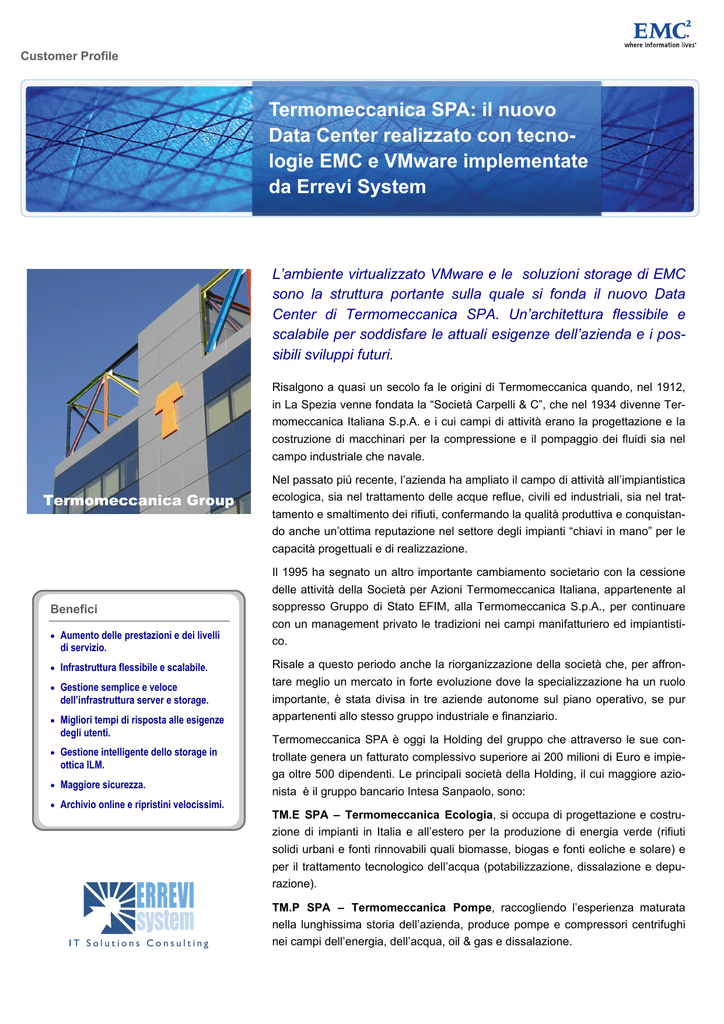 Customer Profile Termomeccanica SPA: il nuovo Data Center realizzato con tecnologie EMC e VMware implementate da Errevi System L’ambiente virtualizzato VMware e le soluzioni storage di EMC sono la struttura portante sulla quale si fonda il nuovo Data Center di Termomeccanica SPA. Un’architettura flessibile e scalabile per soddisfare le attuali esigenze dell’azienda e i possibili sviluppi futuri. Risalgono a quasi un secolo fa le origini di Termomeccanica quando, nel 1912, in La Spezia venne fondata la “Società Carpelli & C”, che nel 1934 divenne Termomeccanica Italiana S.p.A. e i cui campi di attività erano la progettazione e la costruzione di macchinari per la compressione e il pompaggio dei fluidi sia nel campo industriale che navale. Termomeccanica Group Benefici Aumento delle prestazioni e dei livelli di servizio. Infrastruttura flessibile e scalabile. Gestione semplice e veloce dell’infrastruttura server e storage. Migliori tempi di risposta alle esigenze degli utenti. Gestione intelligente dello storage in ottica ILM. Maggiore sicurezza. Archivio online e ripristini velocissimi. Nel passato più recente, l’azienda ha ampliato il campo di attività all’impiantistica ecologica, sia nel trattamento delle acque reflue, civili ed industriali, sia nel trattamento e smaltimento dei rifiuti, confermando la qualità produttiva e conquistando anche un’ottima reputazione nel settore degli impianti “chiavi in mano” per le capacità progettuali e di realizzazione. Il 1995 ha segnato un altro importante cambiamento societario con la cessione delle attività della Società per Azioni Termomeccanica Italiana, appartenente al soppresso Gruppo di Stato EFIM, alla Termomeccanica S.p.A., per continuare con un management privato le tradizioni nei campi manifatturiero ed impiantistico. Risale a questo periodo anche la riorganizzazione della società che, per affrontare meglio un mercato in forte evoluzione dove la specializzazione ha un ruolo importante, è stata divisa in tre aziende autonome sul piano operativo, se pur appartenenti allo stesso gruppo industriale e finanziario. Termomeccanica SPA è oggi la Holding del gruppo che attraverso le sue controllate genera un fatturato complessivo superiore ai 200 milioni di Euro e impiega oltre 500 dipendenti. Le principali società della Holding, il cui maggiore azionista è il gruppo bancario Intesa Sanpaolo, sono: TM.E SPA – Termomeccanica Ecologia, si occupa di progettazione e costruzione di impianti in Italia e all’estero per la produzione di energia verde (rifiuti solidi urbani e fonti rinnovabili quali biomasse, biogas e fonti eoliche e solare) e per il trattamento tecnologico dell’acqua (potabilizzazione, dissalazione e depurazione). TM.P SPA – Termomeccanica Pompe, raccogliendo l’esperienza maturata nella lunghissima storia dell’azienda, produce pompe e compressori centrifughi nei campi dell’energia, dell’acqua, oil & gas e dissalazione. TM.C. SPA – Termomeccanica Compressori, progetta e produce compressori a vite per aria e gas, dai contenuti tecnologici molto innovativi. L’IT al servizio del gruppo La struttura IT centralizzata, alle dirette dipendenze della direzione della Holding, ha la responsabilità di erogare a tutte le aziende del gruppo i servizi comuni ed essenziali e di soddisfare le specifiche esigenze applicative delle singole realtà. “Il nostro è un compito importante ed impegnativo all’interno del gruppo” ha commentato Aldo Bellotti, responsabile IT di Termomeccanica SPA. “Come struttura centralizzata operiamo su due fronti. Il primo ci vede impegnati a migliorare costantemente i servizi comuni ai nostri circa 300 utenti IT, rendendo le procedure e le applicazioni, come ad esempio la posta elettronica, più semplici, veloci ed efficienti. Il secondo invece è indirizzato a soddisfare le necessità delle singole realtà aziendali sviluppando e implementando applicazioni funzionali alle loro specifiche esigenze. Il tutto ovviamente nel pieno rispetto del budget di spesa complessivo”. Il team IT , composto di tre persone, ha la responsabilità di definire le strategie architetturali e evolutive dell’infrastruttura negli aspetti hardware e software, oltre a progettare e implementare i processi, le procedure e gli applicativi comuni al gruppo o specifici delle aziende controllate. Per la parte più operativa, il team si avvale di risorse in outsourcing con le competenze sistemistiche ed applicative adatte a seguire le attività di helpdesk, la gestione dell’ERP SAP e altre applicazioni. L’evoluzione dell’architettura IT Recentemente il sistema informatico di Termomeccanica è stato oggetto di un sostanziale rinnovamento, arrivando alla realizzazione di un Data Center in grado di migliorare sensibilmente i livelli di servizio e di aggiungere maggiore efficienza, controllo e sicurezza. Una decisione frutto di una attenta analisi svolta dall’organizzazione IT della Holding considerando diversi fattori come le richieste provenienti dalle aziende del gruppo, i necessari miglioramenti da apportare ad alcune procedure e applicazioni comuni e l’esigenza di semplificare la gestione, di aumentare la velocità di esecuzione e il livello di sicurezza e protezione dei dati. Inoltre, l’infrastruttura esistente composta da una decina di server totalmente indipendenti, ciascuno destinato ad un singolo applicativo, era ormai inadeguata a sostenere le esigenze aziendali per la scarsa flessibilità di gestione e di crescita; oltre al fatto che alcune macchine erano prossime alla fase di obsolescenza che ne avrebbe richiesto la sostituzione. Il progetto di rinnovamento è stato immediatamente sostenuto e approvato dalla direzione del gruppo che ne ha condiviso gli obiettivi e apprezzato i possibili benefici di maggiore efficienza operativa. “L’approccio che abbiamo seguito è stato quello di pensare ad un’infrastruttura virtualizzata con ampie possibilità di condivisione e scalabili