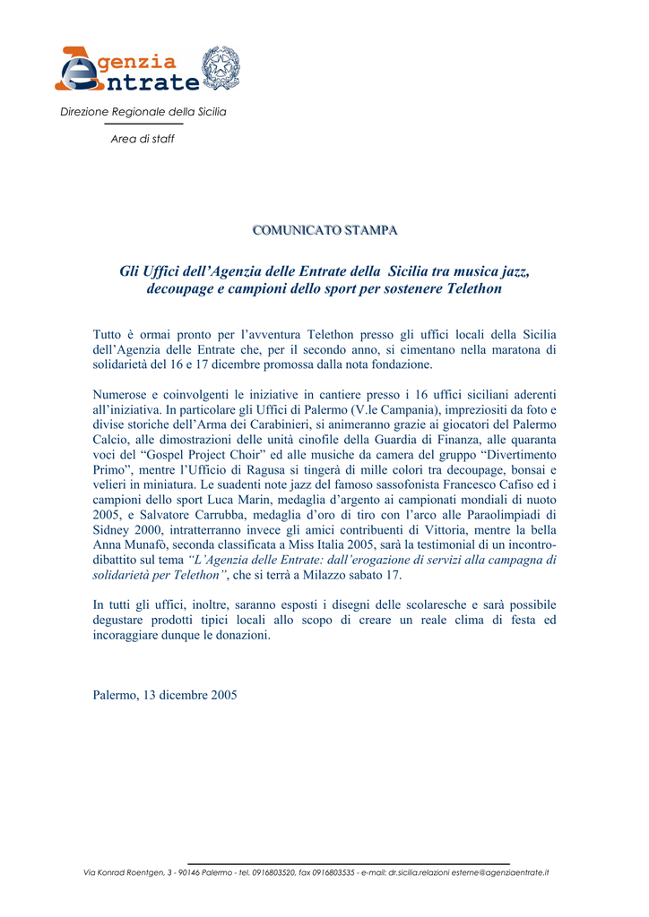 Direzione Regionale della Sicilia Area di staff CCO OM MU UN NIICCA ATTO O SSTTA AM MPPA A Gli Uffici dell’Agenzia delle Entrate della Sicilia tra musica jazz, decoupage e campioni dello sport per sostenere Telethon Tutto è ormai pronto per l’avventura Telethon presso gli uffici locali della Sicilia dell’Agenzia delle Entrate che, per il secondo anno, si cimentano nella maratona di solidarietà del 16 e 17 dicembre promossa dalla nota fondazione. Numerose e coinvolgenti le iniziative in cantiere presso i 16 uffici siciliani aderenti all’iniziativa. In particolare gli Uffici di Palermo (V.le Campania), impreziositi da foto e divise storiche dell’Arma dei Carabinieri, si animeranno grazie ai giocatori del Palermo Calcio, alle dimostrazioni delle unità cinofile della Guardia di Finanza, alle quaranta voci del “Gospel Project Choir” ed alle musiche da camera del gruppo “Divertimento Primo”, mentre l’Ufficio di Ragusa si tingerà di mille colori tra decoupage, bonsai e velieri in miniatura. Le suadenti note jazz del famoso sassofonista Francesco Cafiso ed i campioni dello sport Luca Marin, medaglia d’argento ai campionati mondiali di nuoto 2005, e Salvatore Carrubba, medaglia d’oro di tiro con l’arco alle Paraolimpiadi di Sidney 2000, intratterranno invece gli amici contribuenti di Vittoria, mentre la bella Anna Munafò, seconda classificata a Miss Italia 2005, sarà la testimonial di un incontrodibattito sul tema “L’Agenzia delle Entrate: dall’erogazione di servizi alla campagna di solidarietà per Telethon”, che si terrà a Milazzo sabato 17. In tutti gli uffici, inoltre, saranno esposti i disegni delle scolaresche e sarà possibile degustare prodotti tipici locali allo scopo di creare un reale clima di festa ed incoraggiare dunque le donazioni. Palermo, 13 dicembre 2005 Via Konrad Roentgen, 3 - 90146 Palermo - tel. 0916803520, fax 0916803535 - e-mail: dr.sicilia.relazioni [email protected]