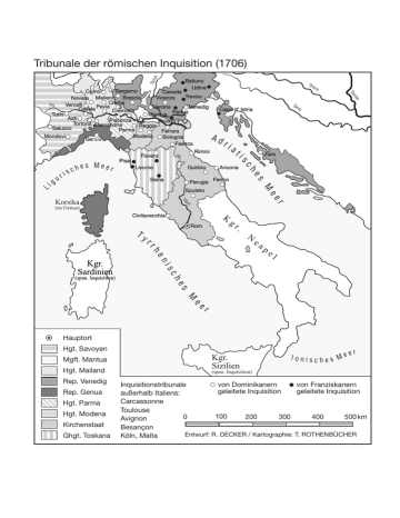 ch Tribunale der römischen Inquisition (1706) u na Do hes Meer Sa va Capo d' Istria Ad ri at Zara Gubbio Livorno Siena Perugia Ancona es sc Florenz ava ch Fermo M g i ur Pisa Rimini Dr is Li Ets Belluno Udine Bergamo Como Ceneda Treviso Vicenza Novara Mailand Brescia Crema Po Vercelli Verona Venedig Casale Pavia Cremona Mantua Padua Turin Asti Piacenza Rovigo Tortona Alessandria Reggio Saluzzo Parma Ferrara Modena Mondovi Bologna Ge Genua Faenza ee Spoleto Tib e Korsika r r (zu Genua) Civitavecchia K Rom Ty gr . N rr ea he ni l sc Kgr. Sardinien pe he (span. Inquisition) s M e er Hauptort Hgt. Savoyen Hgt. Mailand Rep. Venedig Rep. Genua Hgt. Parma Hgt. Modena Kirchenstaat Ghgt. Toskana Ionisches Me Kgr. Sizilien Mgft. Mantua er (span. Inquisition) Inquisitionstribunale außerhalb Italiens: Carcassonne Toulouse 0 Avignon Besançon Köln, Malta von Dominikanern geleitete Inquisition 100 200 300 von Franziskanern geleitete Inquisition 400 500 km Entwurf: R. DECKER / Kartographie: T. ROTHENBÜCHER