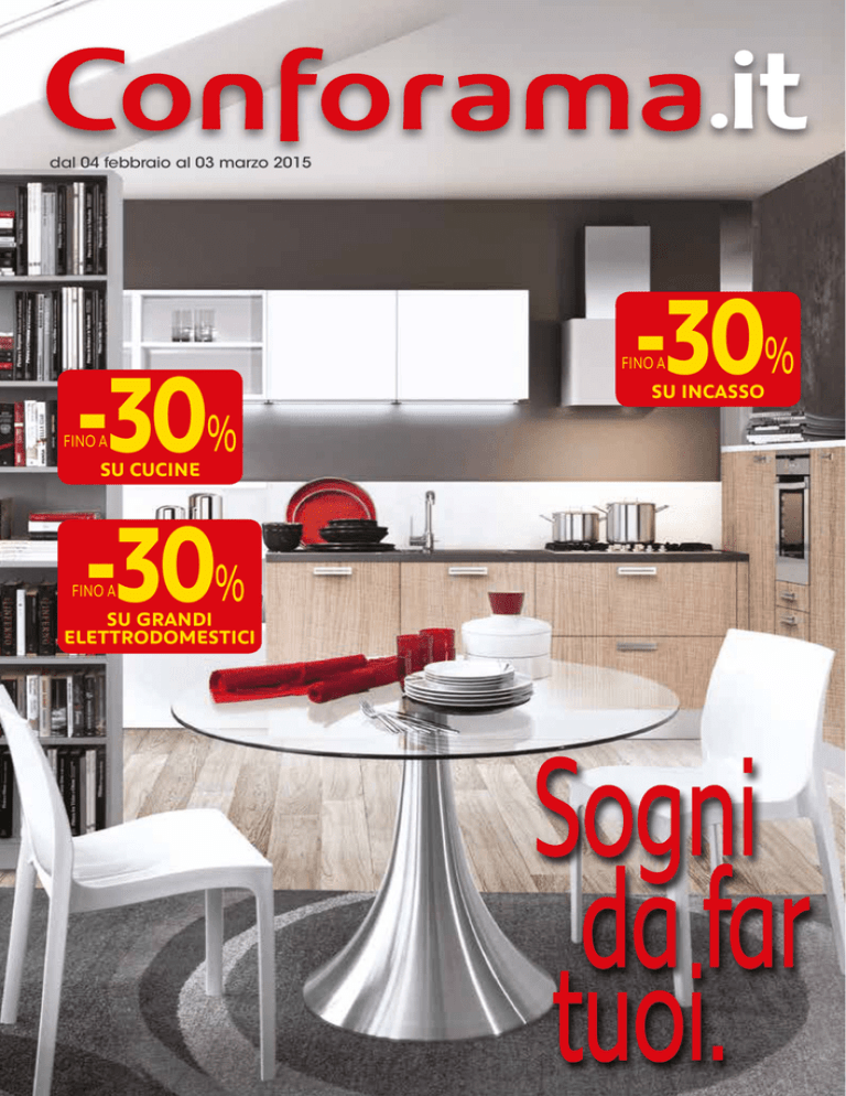 dal 04 febbraio al 03 marzo 2015 -30% -30% -30% FINO A SU INCASSO FINO A SU CUCINE FINO A SU GRANDI ELETTRODOMESTICI Sogni da far tuoi. Scelta illimitata in cucina. RICETTA COMPONIBILITÀ Anta dogata Ante cassetti e cestoni con chiusura assistita ammortizzata Ingredienti: • Strutture spessore 18 mm in pannello classe E1. • 243 colori di ante con spessore da 18 a 24 mm, lisce, dogate o curve, nelle varie finiture. • 159 tipi di maniglie. • 153 Piani di lavoro in diversi spessori da 2 a 6 cm con ampia scelta materiali e colori. Preparazione: • Con le misure del tuo ambiente possiamo progettare insieme e personalizzare la tua cucina. COLORI 10 Realizzazione: • Lineare, Lineare con Penisola, Lineare con Isola. • Angolare, Angolare con Penisola, Angolare con Isola. A LIA N O IT % 100 SU ORDINAZIONE Ante cassetti e cestoni con chiusura assistita ammortizzata Garanzia 5 anni sul mobile Anta a gola COLORI 19 A LIA N O IT % 100 SU ORDINAZIONE 1 VICTORIA Cucina componibile composizione base €1290 €1032 -20% Importo del credito €1032 24 RATE DA €43,00 TAN fisso 0% TAEG 0% importo totale dovuto dal consumatore €1032 1 CUCINA COMPONIBILE “VICTORIA” - ante, cassetti e cestoni con chiusura assistita ammortizzata - ampia componibilità con misure e varianti colore - garanzia 5 anni sul mobile - elettrodomestici, rubinetteria e accessori di allestimento esclusi - prezzo composizione base 255 cm cod. 867697 COS’È LA COMPOSIZIONE BASE? È una composizione di 255 cm lineari, uguale per tutte le cucine componibili del nostro assortimento. Funziona come unità di misura per determinare il prezzo e per poter confrontare i differenti modelli. Tutti i prezzi delle cucine componibili si riferiscono alla composizione base, escluso elettrodomestici, rubinetteria ed accessori di allestimento. 2 Fino a -30% 2 conforama.it LUCE Cucina componibile composizione base €1090 €763 -30% Importo del credito €763 24 RATE DA €31,79 TAN fisso 0% TAEG 0% importo totale dovuto dal consumatore €763 “COSTO ZERO TASSO ZERO TAEG 0,00% su tutte le cucine”* Ante cassetti e cestoni con chiusura assistita ammortizzata Garanzia 5 anni sul mobile Anta con maniglia COLORI 19 A LIA N O IT % 100 SU ORDINAZIONE 3 GRACE Cucina componibile composizione base €1190 €952 -20% Importo del credito €952 24 RATE DA €39,67 TAN fisso 0% TAEG 0% importo totale dovuto dal consumatore €952 2 CUCINA COMPONIBILE “LUCE” - ante, cassetti e cestoni con chiusura assistita ammortizzata - ampia componibilità con misure e varianti colore - elettrodomestici, rubinetteria e accessori di allestimento esclusi - prezzo composizione base 255 cm cod. 867700 3 CUCINA COMPONIBILE “GRACE” - ante, cassetti e cestoni con chiusura assistita ammortizzata - ampia componibilità con misure e varianti colore - garanzia 5 anni sul mobile - elettrodomestici, rubinetteria e accessori di allestimento esclusi - prezzo composizione base 255 cm cod. 867694 *vedi condizioni pag.36 3 Piano lavoro 6 cm cassetti e cestoni con chiusura ammortizzata OLORI 9C 1 SALLY Cucina componibile composizione base €699 A LIA N O IT 24 RATE DA €559 -20% % 100 SU ORDINAZIONE Piano lavoro 6 cm Cassetti e cestoni con chiusura ammortizzata Importo del credito €559 2 INDIA Cucina componibile composizione base €899 €719 -20% Importo del credito €719 €23,29 TAN fisso 0% TAEG 0% importo totale dovuto dal consumatore €559 Tutto quello che non vedi qui è su Conforama.it 24 RATE DA €29,96 TAN fisso 0% TAEG 0% importo totale dovuto dal consumatore €719 OLORI 7C A LIA N O IT % 100 SU ORDINAZIONE COLORI 39 Ante spessore 20 mm Ante, cassetti e cestoni con chiusura ammortizzata A LIA N O IT % 100 SU ORDINAZIONE 3 BELLE Cucina componibile composizione base €990 €693 -30% Importo del credito €693 24 RATE DA €28,87 TAN fisso 0% TAEG 0% importo totale dovuto dal consumatore €693 CUCINA COMPONIBILE “SALLY” - ampia componibilità con misure e varianti colore - elettrodomestici, rubinetteria ed accessori di allestimento esclusi - prezzo composizione base 255 cm cod. 867690 CUCINA COMPONIBILE “INDIA” - ampia componibilità con misure e varianti colore - elettrodomestici, rubinetteria e accessori di allestimento esclusi - prezzo composizione base 255 cm cod. 867692 3 CUCINA COMPONIBILE “BELLE” - ante, cassetti e cestoni con chiusura assistita ammortizzata - ampia componibilità con misure e varianti colore - elettrodomestici, rubinetteria ed accessori di allestimento esclusi - prezzo composizione base 255 cm cod. 3339 1 2 COS’È LA COMPOSIZIONE BASE? È una composizione di 255cm lineari, uguale per tutte le cucine componibili del nostro assortimento. Funziona come unità di misura per determinare il prezzo e per poter confrontare i differenti modelli. Tutti i prezzi delle cucine componibili si riferiscono alla composizione base, escluso elettrodomestici, rubinetteria ed accessori di allestimento. 4 COLORI 21 conforama.it A LIA N O IT % Ante cassetti e cestoni con chiusura assistita ammortizzata 100 SU ORDINAZIONE Elementi stondatii Luci led sottopensile 4 SOLE Cucina componibile composizione base €1090 €763 -30% Importo del credito €763 24 RATE DA €31,79 TAN fisso 0% TAEG 0% importo totale dovuto dal consumatore €763 COLORI 19 A LIA N O IT % 100 SU ORDINAZIONE Ante con maniglia a trafila Ante, cassetti e cestoni con chiusura assistita ammortizzata Garanzia 5 anni sul mobile 5 KATE Cucina componibile composizione base €1290 €1032 -20% Importo del credito €1032 24 RATE DA €43,00 TAN fisso 0% TAEG 0% importo totale dovuto dal consumatore €1032 4 CUCINA COMPONIBILE “SOLE” - ante, cassetti e cestoni con chiusura assistita ammortizzata - ampia componibilità con misure e varianti colore - elettrodomestici, rubinetteria ed accessori di allestimento esclusi - prezzo riferito alla composizione base 255 cm cod. 867699 5 CUCINA COMPONIBILE “KATE” - ante, cassetti e cestoni con chiusura assistita ammortizzata -