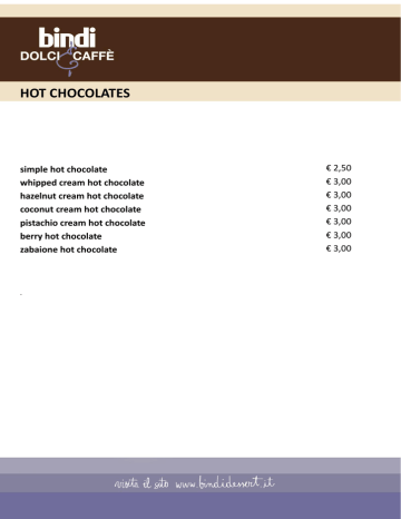 HOT CHOCOLATES simple hot chocolate whipped cream hot chocolate hazelnut cream hot chocolate coconut cream hot chocolate pistachio cream hot chocolate berry hot chocolate zabaione hot chocolate € 2,50 € 3,00 € 3,00 € 3,00 € 3,00 € 3,00 € 3,00 prodotto . prodotto prodotto