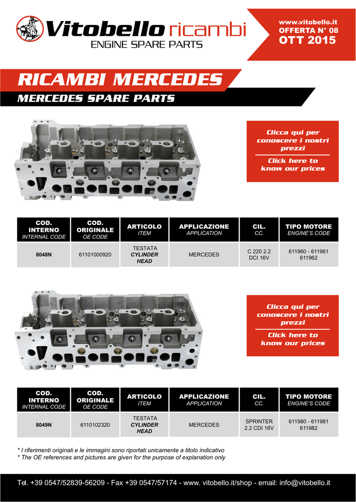 Vitobello ricambi www.vitobello.it OFFERTA N° 08 OTT 2015 ENGINE SPARE PARTS RICAMBI MERCEDES MERCEDES SPARE PARTS Clicca qui per conoscere i nostri prezzi Click here to know our prices COD. INTERNO COD. ORIGINALE ARTICOLO APPLICAZIONE CIL. TIPO MOTORE 8048N 61101000920 TESTATA CYLINDER HEAD MERCEDES C 220 2.2 DCI 16V 611960 - 611961 611962 INTERNAL CODE OE CODE ITEM APPLICATION CC. ENGINE’S CODE Clicca qui per conoscere i nostri prezzi Click here to know our prices COD. INTERNO COD. ORIGINALE ARTICOLO APPLICAZIONE CIL. TIPO MOTORE 8049N 6110102320 TESTATA CYLINDER HEAD MERCEDES SPRINTER 2.2 CDI 16V 611980 - 611981 611982 INTERNAL CODE OE CODE ITEM APPLICATION CC. ENGINE’S CODE * I riferimenti originali e le immagini sono riportati unicamente a titolo indicativo * The OE references and pictures are given for the purpose of explanation only Tel. +39 0547/52839-56209 - Fax +39 0547/57174 - www. vitobello.it/shop - email: [email protected] Vitobello ricambi www.vitobello.it OFFERTA N° 08 OTT 2015 ENGINE SPARE PARTS RICAMBI MERCEDES MERCEDES SPARE PARTS Clicca qui per conoscere i nostri prezzi Click here to know our prices COD. INTERNO COD. ORIGINALE ARTICOLO 8495N 6110105020 6460100620 6460101020 6460101420 TESTATA CYLINDER HEAD INTERNAL CODE OE CODE ITEM APPLICAZIONE CIL. TIPO MOTORE MERCEDES C220 - E220 SPRINTER VIANO 2.2 CDI 16V OM646 APPLICATION CC. ENGINE’S CODE NOV ITÁ NEW COD. INTERNO COD. ORIGINALE ARTICOLO 1099NO A6460310401 ALBERO MOTORE ORIGINALE GENUINE CRANKSHAFT MERCEDES SPRINTER 2.2 DCI 16V OM611 - OM646 1099N A6460310401 ALBERO MOTORE AFTERMARKET AFTERMARKET CRANKSHAFT MERCEDES SPRINTER 2.2 DCI 16V OM611 - OM646 INTERNAL CODE OE CODE ITEM APPLICAZIONE APPLICATION CIL. CC. TIPO MOTORE ENGINE’S CODE * I riferimenti originali e le immagini sono riportati unicamente a titolo indicativo * The OE references and pictures are given for the purpose of explanation only Tel. +39 0547/52839-56209 - Fax +39 0547/57174 - www. vitobello.it/shop - email: [email protected] Vitobello ricambi www.vitobello.it OFFERTA N° 08 OTT 2015 ENGINE SPARE PARTS RICAMBI MERCEDES MERCEDES SPARE PARTS Clicca qui per conoscere i nostri prezzi Click here to know our prices COD. INTERNO INTERNAL CODE 3088N COD. ORIGINALE ARTICOLO APPLICAZIONE CIL. TIPO MOTORE A6460300020 BIELLA CON PIEDE TRAPEZIOIDALE CONNECTING ROD TAPER TYPE MERCEDES SPRINTER 2.2 DCI 16V OM611 - OM646 OE CODE ITEM APPLICATION CC. ENGINE’S CODE Clicca qui per conoscere i nostri prezzi Click here to know our prices COD. INTERNO COD. ORIGINALE ARTICOLO APPLICAZIONE CIL. TIPO MOTORE 3089N A6110300420 BIELLA CONNECTING ROD MERCEDES C 220 2.2 DCI 16V OM611 INTERNAL CODE OE CODE ITEM APPLICATION CC. ENGINE’S CODE * I riferimenti originali e le immagini sono riportati unicamente a titolo indicativo * The OE references and pictures are given for the purpose of explanation only Tel. +39 0547/52839-56209 - Fax +39 0547/57174 - www. vitobello.it/shop - email: [email protected]