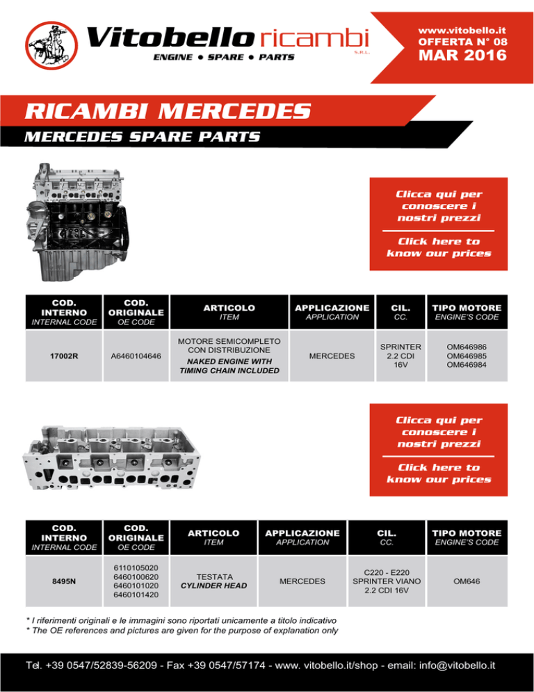 Vitobello ricambi ENGINE SPARE www.vitobello.it OFFERTA N° 08 MAR 2016 S. R. L. PARTS RICAMBI MERCEDES MERCEDES SPARE PARTS Clicca qui per conoscere i nostri prezzi Click here to know our prices COD. INTERNO INTERNAL CODE 17002R COD. ORIGINALE OE CODE A6460104646 ARTICOLO ITEM APPLICAZIONE CIL. TIPO MOTORE MERCEDES SPRINTER 2.2 CDI 16V OM646986 OM646985 OM646984 APPLICATION MOTORE SEMICOMPLETO CON DISTRIBUZIONE NAKED ENGINE WITH TIMING CHAIN INCLUDED CC. ENGINE’S CODE Clicca qui per conoscere i nostri prezzi Click here to know our prices COD. INTERNO COD. ORIGINALE ARTICOLO APPLICAZIONE CIL. TIPO MOTORE 8495N 6110105020 6460100620 6460101020 6460101420 TESTATA CYLINDER HEAD MERCEDES C220 - E220 SPRINTER VIANO 2.2 CDI 16V OM646 INTERNAL CODE OE CODE ITEM APPLICATION CC. ENGINE’S CODE * I riferimenti originali e le immagini sono riportati unicamente a titolo indicativo * The OE references and pictures are given for the purpose of explanation only Tel. +39 0547/52839-56209 - Fax +39 0547/57174 - www. vitobello.it/shop - email: [email protected] Vitobello ricambi ENGINE SPARE PARTS www.vitobello.it OFFERTA N° 08 MAR 2016 S. R. L. RICAMBI MERCEDES MERCEDES SPARE PARTS Clicca qui per conoscere i nostri prezzi Click here to know our prices RICAMBI ORIGINALI GENUINE PARTS COD. INTERNO COD. ORIGINALE ARTICOLO APPLICAZIONE CIL. TIPO MOTORE 1099NO A6460310401 ALBERO MOTORE CRANKSHAFT MERCEDES C220 - E220 SPRINTER VIANO 2.2 CDI 16V OM611 - OM646 INTERNAL CODE OE CODE ITEM APPLICATION CC. ENGINE’S CODE Clicca qui per conoscere i nostri prezzi Click here to know our prices COD. INTERNO COD. ORIGINALE ARTICOLO APPLICAZIONE CIL. TIPO MOTORE 3088N A6460300020 BIELLA CONNECTING ROD MERCEDES C220 - E220 SPRINTER VIANO 2.2 CDI 16V OM611 - OM646 INTERNAL CODE OE CODE ITEM APPLICATION CC. ENGINE’S CODE * I riferimenti originali e le immagini sono riportati unicamente a titolo indicativo * The OE references and pictures are given for the purpose of explanation only Tel. +39 0547/52839-56209 - Fax +39 0547/57174 - www. vitobello.it/shop - email: [email protected]