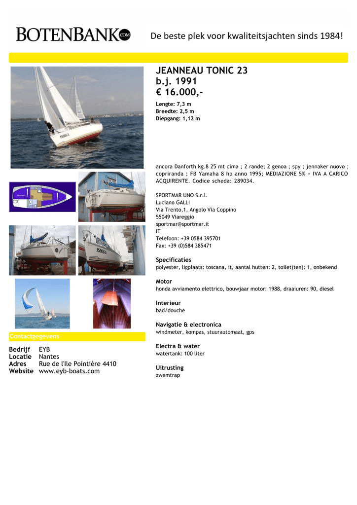 JEANNEAU TONIC 23 b.j. 1991 € 16.000,Lengte: 7,3 m Breedte: 2,5 m Diepgang: 1,12 m ancora Danforth kg.8 25 mt cima ; 2 rande; 2 genoa ; spy ; jennaker nuovo ; copriranda ; FB Yamaha 8 hp anno 1995; MEDIAZIONE 5% + IVA A CARICO ACQUIRENTE. Codice scheda: 289034. SPORTMAR UNO S.r.l. Luciano GALLI Via Trento,1, Angolo Via Coppino 55049 Viareggio [email protected] IT Telefoon: +39 0584 395701 Fax: +39 (0)584 385471 Specificaties polyester, ligplaats: toscana, it, aantal hutten: 2, toilet(ten): 1, onbekend Motor honda avviamento elettrico, bouwjaar motor: 1988, draaiuren: 90, diesel Interieur bad/douche Navigatie & electronica Contactgegevens Bedrijf Locatie Adres Website EYB Nantes Rue de l'Ile Pointière 4410 www.eyb-boats.com windmeter, kompas, stuurautomaat, gps Electra & water watertank: 100 liter Uitrusting zwemtrap