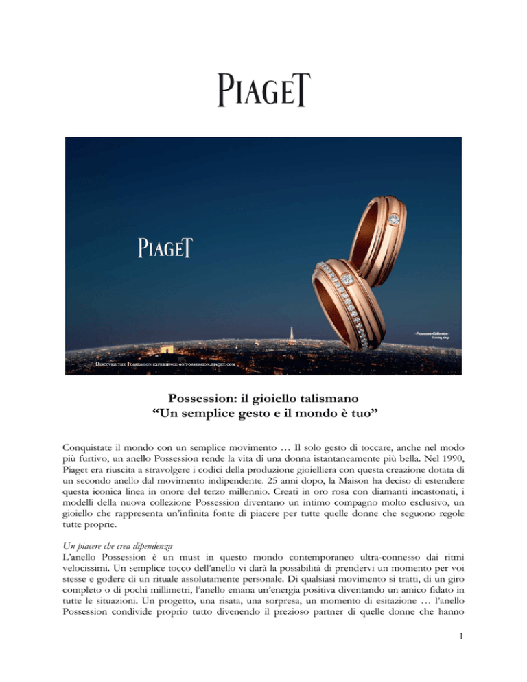 Possession: il gioiello talismano “Un semplice gesto e il mondo è tuo” Conquistate il mondo con un semplice movimento … Il solo gesto di toccare, anche nel modo più furtivo, un anello Possession rende la vita di una donna istantaneamente più bella. Nel 1990, Piaget era riuscita a stravolgere i codici della produzione gioielliera con questa creazione dotata di un secondo anello dal movimento indipendente. 25 anni dopo, la Maison ha deciso di estendere questa iconica linea in onore del terzo millennio. Creati in oro rosa con diamanti incastonati, i modelli della nuova collezione Possession diventano un intimo compagno molto esclusivo, un gioiello che rappresenta un’infinita fonte di piacere per tutte quelle donne che seguono regole tutte proprie. Un piacere che crea dipendenza L’anello Possession è un must in questo mondo contemporaneo ultra-connesso dai ritmi velocissimi. Un semplice tocco dell’anello vi darà la possibilità di prendervi un momento per voi stesse e godere di un rituale assolutamente personale. Di qualsiasi movimento si tratti, di un giro completo o di pochi millimetri, l’anello emana un’energia positiva diventando un amico fidato in tutte le situazioni. Un progetto, una risata, una sorpresa, un momento di esitazione … l’anello Possession condivide proprio tutto divenendo il prezioso partner di quelle donne che hanno 1 verso la vita un atteggiamento edonistico. Come racconta Chabi Nouri, Direttrice Jewellery Marketing Communications e Brand Equity di Piaget: "Possession offre l’opportunità di godersi un meritato momento per sé stesse a tutte le donne moderne i cui ritmi di vita sono sempre più veloci. Con il gesto di far ruotare gli anelli è possibile prendersi una pausa, un momento nel quale ritrovare quell’energia che permette al proprio spirito di lanciarsi verso nuove conquiste”. La scelta di un qualcosa di unico L’anello Possession conferma la propria unicità attraverso estetica e magia tattile riuscendo a soddisfare le aspettative delle donne moderne – donne metropolitane libere dalle regole, che passano in un attimo dal jeans all’abito da cocktail. Come Jessica Chastain, ambasciatrice internazionale della Maison Piaget che, catturata dal nuovo anello Possession, ha voluto indossarlo immediatamente: “Amo l’anello Possession. Sono sempre stata il tipo di ragazza a cui piace giocare con gli anelli facendoli ruotare sulle dita ed è veramente incredibile che questo modello sia stato disegnato per fare proprio questo! E’ un anello dall’anima giocosa e quando lo indosso sono in un costante stato meditativo - lo faccio ruotare continuamente, crea veramente dipendenza”. La caratteristica estetica Con il suo design all’avanguardia, l’anello Possession è la rappresentazione dell’audacia di Piaget. Le sue forme ridefinite ne aumentano l’impatto estetico grazie ad una sottile asimmetria che nasce dal gioco dei due anelli. Esperti nell’arte della scultura dell’oro, i maestri gioiellieri della Maison svizzera hanno deciso di creare l’anello Possession in un brillante oro rosa, in perfetta armonia con le tendenze attuali. Con la sua allure gioiosa cattura la luce e gli sguardi ammirati. Anche in questo caso, l’abilità degli artigiani gioca con la voluttuosità del gioiello e l’oro delicatamente lucido con il quale è stato creato diventa un nastro sensuale che non si può non toccare. Gli eroi di questa nuova collezione sono due anelli sviluppati per essere al passo con una realtà metropolitana fatta di donne che si spostano da una riunione del Consiglio di Amministrazione ad una cena di gala e da un angolo all’altro del pianeta. La purezza del primo modello è sottolineata dal sobrio accoppiamento tra l’oro rosa e i diamanti taglio brillante mentre la più esuberante seconda creazione è un dialogo tra un anello con una fascia di diamanti e un anello con diamante centrale. Il sempre più femminile anello Possession 3.0 regala alla donna che lo indossa l’idea di sapere veramente controllare la propria vita. Per maggiori informazioni, vi preghiamo di contattare Katia Spiller ([email protected]) Immagini in alta risoluzione disponibili all’indirizzo http://press.piaget.com ©Piaget 2015. Tutti i diritti riservati. piaget.com possession.piaget.com #piagetPossession#myturn facebook.com/piaget twitter.com/piaget instagram.com/piagetbrand pinterest.com/piagetbrand youtube.com/piaget weibo.com/piaget 2