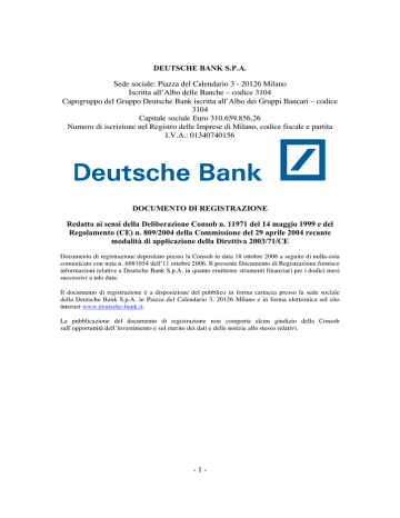 DEUTSCHE BANK S.P.A. Sede sociale: Piazza del Calendario 3 - 20126 Milano Iscritta all’Albo delle Banche – codice 3104 Capogruppo del Gruppo Deutsche Bank iscritta all’Albo dei Gruppi Bancari – codice 3104 Capitale sociale Euro 310.659.856,26 Numero di iscrizione nel Registro delle Imprese di Milano, codice fiscale e partita I.V.A.: 01340740156 DOCUMENTO DI REGISTRAZIONE Redatto ai sensi della Deliberazione Consob n. 11971 del 14 maggio 1999 e del Regolamento (CE) n. 809/2004 della Commissione del 29 aprile 2004 recante modalità di applicazione della Direttiva 2003/71/CE Documento di registrazione depositato presso la Consob in data 18 ottobre 2006 a seguito di nulla-osta comunicato con nota n. 6081054 dell’11 ottobre 2006. Il presente Documento di Registrazione fornisce informazioni relative a Deutsche Bank S.p.A. in quanto emittente strumenti finanziari per i dodici mesi successivi a tale data. Il documento di registrazione è a disposizione del pubblico in forma cartacea presso la sede sociale della Deutsche Bank S.p.A. in Piazza del Calendario 3, 20126 Milano e in forma elettronica sul sito internet www.deutsche-bank.it. La pubblicazione del documento di registrazione non comporta alcun giudizio della Consob sull’opportunità dell’investimento e sul merito dei dati e delle notizie allo stesso relativi. -1- Il presente documento di registrazione (“Documento di Registrazione”) è redatto in conformità all’articolo 14 del Regolamento 2004/809/CE. Il presente Documento di Registrazione contiene informazioni su Deutsche Bank S.p.A., in qualità di emittente di volta in volta di una o più serie di titoli di debito (“Obbligazioni”). In occasione dell’emissione di ciascuna serie di Obbligazioni, il presente Documento di Registrazione deve essere letto congiuntamente alla nota informativa (“Nota Informativa”) relativa a tale serie di Obbligazioni e alla nota di sintesi (“Nota di Sintesi”). La Nota Informativa sulle Obbligazioni conterrà le informazioni relative alle Obbligazioni e la Nota di Sintesi riassumerà le caratteristiche dell’Emittente e delle Obbligazioni e i rischi associati alle stesse. L'investimento nelle Obbligazioni comporta dei rischi. L'investitore è invitato a leggere la sezione “Fattori di Rischio”. -2- INDICE INDICE............................................................................................................................................................... 3 DEFINIZIONI ................................................................................................................................................... 5 GLOSSARIO ..................................................................................................................................................... 6 1. PERSONE RESPONSABILI .................................................................................................................. 8 1.1 INDICAZIONE DELLE PERSONE RESPONSABILI ...................................................................................... 8 1.2 DICHIARAZIONE DELLE PERSONE RESPONSABILI ................................................................................. 8 2. REVISORE LEGALE DEI CONTI ...................................................................................................... 9 2.1 REVISORI LEGALI DELL’EMITTENTE ..................................................................................................... 9 2.2 INFORMAZIONI SUI RAPPORTI CON LA SOCIETÀ DI REVISIONE ............................................................. 9 3. FATTORI DI RISCHIO ........................................................................................................................ 10 3.1 RISCHI RIFERIBILI ALL’EMITTENTE E AL G RUPPO D EUTSCHE BANK ................................................ 10 3.2 RISCHIO RELATIVO ALLA REDAZIONE DEL BILANCIO CONSOLIDATO DELL’EMITTENTE IN BASE AI PRINCIPI IAS/IFRS ........................................................................................................................................ 10 3.3 IL RISCHIO DI CREDITO ........................................................................................................................ 11 3.4 RISCHI DI LIQUIDITÀ ............................................................................................................................ 12 3.5 RISCHIO CORRELATO ALL’ASSENZA DI RATING .................................................................................. 12 3.6 RISCHI LEGATI AL MERCATO ............................................................................................................... 12 3.6.1 IL MERCATO ITALIANO ................................................................................................................. 12 4. INFORMAZIONI SULL’EMITTENTE............................................................................................. 14 4.1 STORIA ED EVOLUZIONE DELL’ EMITTENTE ........................................................................................ 14 4.1.1 Denominazione legale................................................................................................................. 14 4.1.2 Luogo di registrazione dell’emittente e suo numero di registrazione ...................................... 14 4.1.3 Data di costituzione e durata dell’Emittente.............................................................................. 14 4.1.4 Domicilio e forma giuridica dell’Emittente, legislazione in base alla quale opera, paese di costituzione, indirizzo e numero di telefono della sede sociale............................................................. 14 4.1.5 Fatti rilevanti nell’evoluzione dell’Emittente............................................................................ 14 4.1.6 Descrizione dei sistemi di gestione del rischio di credito......................................................... 15 4.1.7 Eventi rece