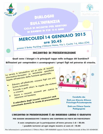 DIALOGHI IA Z N A F N I ’ L L U S I ER GENITOR P I R T N O C IN CICLO DI -6 ANNI 0 ’ A T E I D I DI BAMBIN 15 0 2 O I A N N E G 4 1 Ì D E L O C R ME 0.45 or e 2 arking L’O P y b a B il o ss pre Cocito 14, Alb L. ia V , o n a N o ttav a (CN) INCONTRO DI PRESENTAZIONE Quali sono i bisogni e le principali tappe nello sviluppo del bambino? Riflessioni per comprendere e accompagnare i propri figli nel percorso di crescita. incontri i d lo c i ad un c he specific he a v i t t u d tic ro a è int tivi su tema genitoriale: t a r e s a La ne ivo-form io della funzio t a m r o f z in ll’eserci con una a i l e t g i a f g e e l r : cresce à it v i t t e f ll’af iutano a ucare a stima e d E h c e ol uto : le reg i r a i b uo n a a h c i patt ccole e utrire la o n C r e p re nti a cresce acconti: mome co e r bambino o i G e co l i vi s a r à e s relazion s e c c u s n incontri di presentazio i l g e d rata dario Il calen durante la se cato c om uni Condotto da: Dott.ssa Alessia Allocco Psicologa-Psicoterapeuta Dott.ssa Chiara Camia Pedagogista L’INCONTRO DI PRESENTAZIONE È AD INGRESSO LIBERO E GRATUITO PER RAGIONI ORGANIZZATIVE É GRADITA UNA CONFERMA DA PARTE DEI PARTECIPANTI Il costo complessivo per la partecipazione all’intero percorso è di € 35,00. É possibile iscriversi ad ogni singolo incontro al costo di € 15,00 Per informazioni e prenotazioni: L’Ottavo Nano 389-4686860 oppure Centro Relazionando di Bra 331-8348438