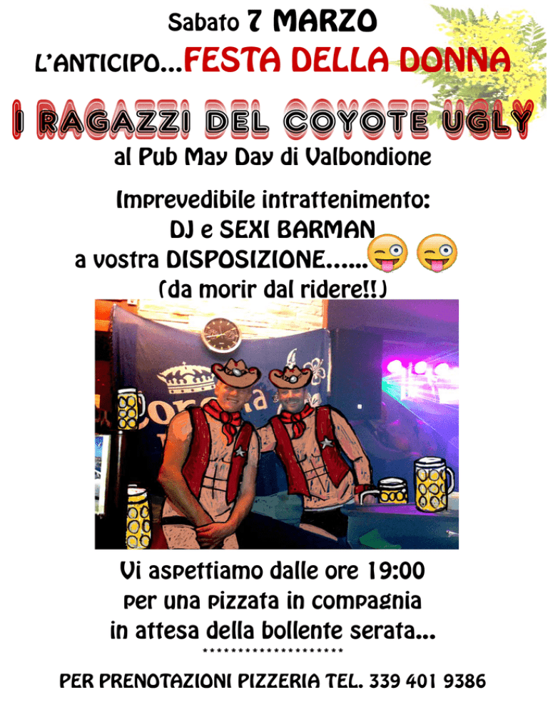 Sabato 7 MARZO L’ANTICIPO…FESTA DELLA DONNA I RAGAZZI DEL COYOTE UGLY al Pub May Day di Valbondione Imprevedibile intrattenimento: DJ e SEXI BARMAN a vostra DISPOSIZIONE…... (da morir dal ridere!!) J Vi aspettiamo dalle ore 19:00 per una pizzata in compagnia in attesa della bollente serata... ******************** PER PRENOTAZIONI PIZZERIA TEL. 339 401 9386