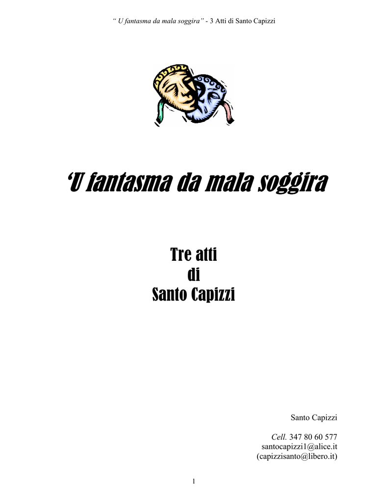 “ U fantasma da mala soggira” - 3 Atti di Santo Capizzi ‘U fantasma da mala soggira Tre atti di Santo Capizzi Santo Capizzi Cell. 347 80 60 577 [email protected] ([email protected]) 1 “ U fantasma da mala soggira” - 3 Atti di Santo Capizzi A te Cuore Mio, la tua allegria mi riempie la vita, il tuo amore ispira i miei passi. S.C. 2 “ U fantasma da mala soggira” - 3 Atti di Santo Capizzi Questa storia è semplicemente frutto della fantasia, pertanto ogni riferimento a persone, fatti e luoghi è del tutto casuale. S.C. Sinossi In un quartiere popolare un uomo si lascia vincere dal vizio del bere e del gioco delle carte, fino ad indebitarsi con un malvivente della zona. Contemporaneamente per un equivoco, gli viene data la notizia che la suocera e’ morta. La suocera stessa utilizza questo malinteso per tastare il polso del genero; alla fine si trovera’ pero’ costretta ad ingegnarsi per aiutare lui e la famiglia tutta a risolvere il serio problema rappresentato dal debito di gioco contratto. 3 “ U fantasma da mala soggira” - 3 Atti di Santo Capizzi “U fantasma da mala soggira” Personaggi Turiddru occhibelli: genero donna Cummari Pica Cummari Pica: suocera di Turiddru Annuzza: figlia donna Cummari Pica, moghie di Turiddru Lorenzino: figlio di Turiddru ed Annuzza Carmelo tri quattini: amico di Turiddru Jano fusiddru: creditore di Turiddru Pippo muccu: garzone del pescivendolo Cicciu manicula: datore di lavoro Nino gelsomino: fioraio Tano vara: becchino picciotti di Jano fusiddru Primo Picciotto Secondo Picciotto N.B: all’occorrenza il personaggio del fioraio può essere interpretato da una donna; Lorenzino può diventare un personaggio femminile. 4 “ U fantasma da mala soggira” - 3 Atti di Santo Capizzi ATTO PRIMO Scena I (Cummari Pica, Lorenzo, Annuza) Solotto di una casa povera. Donna anziana che rassetta. CUMMARI PICA - a su non ci fussi ju ‘nta sta casa, vulissi avviriri comu facissunu. LORENZINO - (entrando) ciau nonna, ci sta facennu? CUMMARI PICA - a chi staju facennu Lorenzinu ca no vidi? Staju arizzittannu tannichieddra, ca na sta casa fra tia, to soru je’ dru maccagnuni di to pattri c’e’ sempri n’manicomiu. LORENZINO - (ridendo) Tu pozzu rari n’baciuzzu? CUMMARI PICA - ca cetu ca mu po rari, veni ca. LORENZINO - Staju niscennu a chiu’ taddu (esce). CUMMARI PICA - ciau tisoru a Madonna ti vadda, e soprattuttu spiramu ca non ti fa addivintari comu a to pattri (pausa). E jà to pattri, dru maccagnuni. Ci l’hava dittu ju a me figlia: “non tu pighiari a chiddru ca je’ pani pessu, non havi testa pi maritarisi, je‘ nu sfaffalatu ca testa o jocu e nuddra vulunta’di travaghiari”. E svintuarata ju, i me paroli furunu prufizia. Auh ‘nda 25 anni ca u canusciu ha accucchiatu si e no du misi di travaghiu; n’coppu u principali je’ tintu, n‘coppu si senti mali, n‘coppu ratteddri di fari non ci ne , n’coppu a mala nova ca javi d’incoddru, fattu sta ca je’ sempri ‘ndi Don Cola a jucari e catti e a viviri vinu! Ammenu vincissi na biniritta vota e puttassi quacche soddu a casa, no mai! ANNUZZA - (entrando) ciao mamma. CUMMARI PICA - ciau Annuzza a mamma. ANNUZZA - ma chi sta facennu, t’aja dittu centu voti ca tu t’arripusari e na fari nenti, appoi quannu tonnu di travaghiari ci pensu ju. CUMMARI PICA - ma chi ci pensi tu a mammuzza, ca si tuttu u jonnu fora a travaghiari e a sira t’arricoghi stanca avvilita, cori miu. Su non t’ajutu ju cu t’ajutari! ANNUZZA - ma quali stanca avviluta mamma; tranquilla non ti preoccupari ca fozzi n’haju a sufficienza. 5 “ U fantasma da mala soggira” - 3 Atti di Santo Capizzi CUMMARI PICA - u sacciu ca fozzi paccom’ora n’hai, ma quantu po resistiri ancora cu sti ritmi; arizzetta a casa e di cussa a travaghiari, poi a menzujonnu tonni ppi priparari a mangiari, ti lavi i piatti e di novu di cussa a travaghiari, t’atticoghi a sira e ancora a arizzittari, a lavari i robbi, a pinsari a famighia; dicu ju quantu avissa campari d’accussi na cristiana? ANNUZZA - ca quantu avissa campari mamma, ca quantu voli u Signuruzzu! CUMMARI PICA - a mamma ma scusari su tu dicu, ma a mia mi fai pena. Pi puttari quacche soddu a casa pi manteniri a famighia, stai tuttu u santu jonnu fora e nonostanti chistu su non fussi pi dri du pirocchia da me pensioni sociali di vicchiania, a miseria ‘nda sti mura ca surunu umidita’, si tagliassi co cuteddru, anzi fossi mancu si putissi taghiari picchi cuteddri non vi ni putissuri pimmettiri. ANNUZZA - e chi haja fai mamma, no vidi ca Turiddru n’arrinesci a truvari n’travaghiu seriu e duraturu. CUMMARI PICA - non c’arrinesci o mancu u cecca? Mi pari a mia ca dru maccagnuni di to maritu u travaghiu u mmutta ca stanga pi non farisi pighiari. ANNUZZA - avaja mamma chi dici! CUMMARI PICA - chi dicu? Ca dicu a virita’ a mammuzza; sta tuttu u jonnu a ghiucari e catti e a viviri vinu ‘nda putia. Di ciccarisi n’travaghiu non ni voli sentiri, e poi quannu ci pensa e s’arricoghi a casa, arriva cu dra boria di chiuddru ca spatti pritinni (imita la voce do Turiddru) ” e chi e’ ancora non e prontu n’tavula… a cammisa janca ancora non e’ stirata… e‘ pussibbili ca ‘nda sta casa si mangia sempri a stissa cosa…” e a ringrazziari u Signuruzzu ca attrova a mangiari quannu s’arricoghi, picchi’ su fussi pi iddru, fungi mangiassunu o jonnu! ANNUZZA - fungi? Ca macari sti paroli arrivassunu o cielu! Comunque mamma non ci pinsari dai. A senti, oggi mi spicciu prima di travaghiari e peccio’ vulissi passari a piscaria,.ci vo veniri, accussi’ mi fai cumpagnia? CUMMARI PICA - ca va beni a mamma. ANNUZZA - allura talia chi facemu, ni viremu chiu’ taddu all’acqua o linzolu. Avanti mi ni staju jennu. CUMMARI PICA - va beni a chiu’ taddu. ANNUZZA - ciau (esce). CUMMARI PICA - (come riflettendo ad alta voce) non ci pinsari chiu’mamma, dici iddra; ma comu fazzu a non pinsarici. Mischina, mi fa na pena a figlia, chi mala sotti ca ci ni vinn