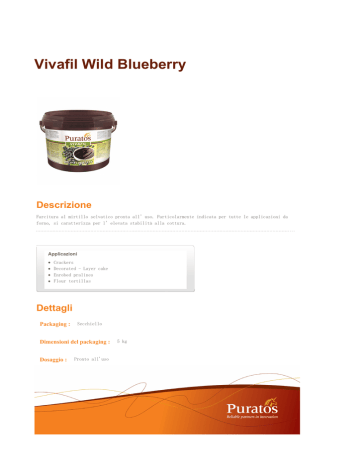 Vivafil Wild Blueberry Descrizione Farcitura al mirtillo selvatico pronta all’uso. Particolarmente indicata per tutte le applicazioni da forno, si caratterizza per l’elevata stabilità alla cottura. Applicazioni Crackers Decorated - Layer cake Enrobed pralines Flour tortillas Dettagli Packaging : Secchiello Dimensioni del packaging : Dosaggio : Pronto all'uso 5 kg