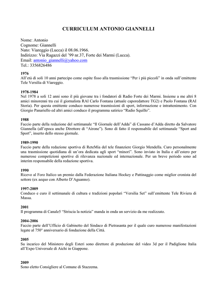 CURRICULUM ANTONIO GIANNELLI Nome: Antonio Cognome: Giannelli Nato: Viareggio (Lucca) il 08.06.1966. Indirizzo: Via Ragazzi del ’99 nr.37, Forte dei Marmi (Lucca). Email: [email protected] Tel.: 3356826486 1976 All’età di soli 10 anni partecipo come ospite fisso alla trasmissione “Per i più piccoli” in onda sull’emittente Tele Versilia di Viareggio. 1978-1984 Nel 1978 a soli 12 anni sono il più giovane tra i fondatori di Radio Forte dei Marmi. Insieme a me altri 8 amici minorenni tra cui il giornalista RAI Carlo Fontana (attuale caporedattore TG2) e Paolo Fontana (RAI Storia). Per questa emittente conduco numerose trasmissioni di sport, informazione e intrattenimento. Con Giorgio Panariello ed altri amici conduco il programma satirico “Radio Squillo”. 1988 Faccio parte della redazione del settimanale “Il Giornale dell’Adda” di Cassano d’Adda diretto da Salvatore Giannella (all’epoca anche Direttore di “Airone”). Sono di fatto il responsabile del settimanale “Sport and Sport”, inserto dello stesso giornale. 1989-1990 Faccio parte della redazione sportiva di ReteMia del tele finanziere Giorgio Mendella. Curo personalmente una trasmissione quotidiana di un’ora dedicata agli sport “minori”. Sono inviato in Italia e all’estero per numerose competizioni sportive di rilevanza nazionale ed internazionale. Per un breve periodo sono ad interim responsabile della redazione sportiva. 1990 Ricevo al Foro Italico un premio dalla Federazione Italiana Hockey e Pattinaggio come miglior cronista del settore (ex aequo con Alberto D’Aguanno). 1997-2009 Conduco e curo il settimanale di cultura e tradizioni popolari “Versilia Set” sull’emittente Tele Riviera di Massa. 2001 Il programma di Canale5 “Striscia la notizia” manda in onda un servizio da me realizzato. 2004-2006 Faccio parte dell’Ufficio di Gabinetto del Sindaco di Pietrasanta per il quale curo numerose manifestazioni legate al 750° anniversario di fondazione della Città. 2005 Su incarico del Ministero degli Esteri sono direttore di produzione del video 3d per il Padiglione Italia all’Expo Universale di Aichi in Giappone. 2009 Sono eletto Consigliere al Comune di Stazzema.