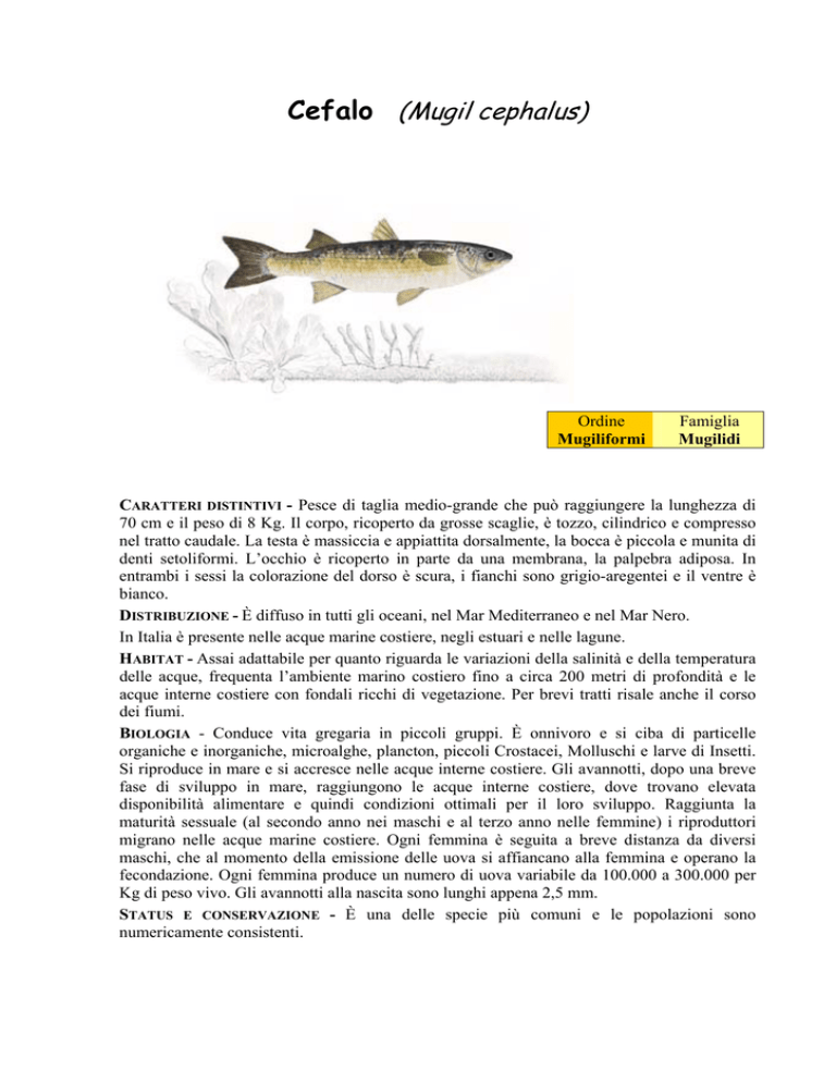 Cefalo (Mugil cephalus) Ordine Mugiliformi Famiglia Mugilidi CARATTERI DISTINTIVI - Pesce di taglia medio-grande che può raggiungere la lunghezza di 70 cm e il peso di 8 Kg. Il corpo, ricoperto da grosse scaglie, è tozzo, cilindrico e compresso nel tratto caudale. La testa è massiccia e appiattita dorsalmente, la bocca è piccola e munita di denti setoliformi. L’occhio è ricoperto in parte da una membrana, la palpebra adiposa. In entrambi i sessi la colorazione del dorso è scura, i fianchi sono grigio-aregentei e il ventre è bianco. DISTRIBUZIONE - È diffuso in tutti gli oceani, nel Mar Mediterraneo e nel Mar Nero. In Italia è presente nelle acque marine costiere, negli estuari e nelle lagune. HABITAT - Assai adattabile per quanto riguarda le variazioni della salinità e della temperatura delle acque, frequenta l’ambiente marino costiero fino a circa 200 metri di profondità e le acque interne costiere con fondali ricchi di vegetazione. Per brevi tratti risale anche il corso dei fiumi. BIOLOGIA - Conduce vita gregaria in piccoli gruppi. È onnivoro e si ciba di particelle organiche e inorganiche, microalghe, plancton, piccoli Crostacei, Molluschi e larve di Insetti. Si riproduce in mare e si accresce nelle acque interne costiere. Gli avannotti, dopo una breve fase di sviluppo in mare, raggiungono le acque interne costiere, dove trovano elevata disponibilità alimentare e quindi condizioni ottimali per il loro sviluppo. Raggiunta la maturità sessuale (al secondo anno nei maschi e al terzo anno nelle femmine) i riproduttori migrano nelle acque marine costiere. Ogni femmina è seguita a breve distanza da diversi maschi, che al momento della emissione delle uova si affiancano alla femmina e operano la fecondazione. Ogni femmina produce un numero di uova variabile da 100.000 a 300.000 per Kg di peso vivo. Gli avannotti alla nascita sono lunghi appena 2,5 mm. STATUS E CONSERVAZIONE - È una delle specie più comuni e le popolazioni sono numericamente consistenti.