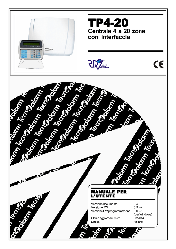 TP4-20 Centrale 4 a 20 zone con interfaccia MANU ALE PER MANUALE L'UTENTE Versione documento: 0.4 Versione FW 0.9 --> Versione SW programmazione: 3.0 --> (per Windows) Ultimo aggiornamento: 03/2014 Lingua: Italiano E' vietata la copia, la distribuzione e la pubblicazione del presente manuale o di parti dello stesso, su qualunque tipo di supporto e in qualunque forma, senza previa autorizzazione da parte della Tecnoalarm. ll contenuto del presente manuale può essere soggetto a modifiche in qualsiasi momento e senza preavviso. CONFORMITÀ Con la presente Tecnoalarm srl dichiara che il presente apparecchio è conforme ai requisiti essenziali ed alle altre disposizioni pertinenti stabilite dalla direttiva R&TTE 1999/05/EC. La dichiarazione di conformità è disponibile sul sito: www.tecnoalarm.com. MANUALE PER L'UTENTE - Indice NOTE IMPORTANTI NOTE PER L'UTENTE 1. CARATTERISTICHE GENERALI DELLA CENTRALE 1.1 1.2 1.3 1.3.1 1.3.2 1.4 1.4.1 1.5 1.6 LA CENTRALE TP4-20 I CODICI DISPONIBILI OPERAZIONI ESEGUIBILI DA CONSOLE Operazioni eseguibili da codice Utente Master Operazioni eseguibili con i codici utente ausiliari OPERAZIONI DA TELEFONO REMOTO Salto della segreteria telefonica FUNZIONAMENTO DELLA CENTRALE COMPOSIZIONE DELLA CENTRALE 2. INDICAZIONI DELLA CENTRALE 2.1 RICONOSCIMENTO ALLARMI E SEGNALAZIONI 2.1.1 Le console LCD020 2.1.1.1 Led di stato programmi 2.1.1.2 Led di allarme programmi 2.1.1.3 Led zona aperta 2.1.1.4 Led di allarme manomissione - Taglio cavi 2.1.1.5 Led di allarme batteria 2.1.1.6 Led di allarme rete 230V 2.1.1.7 Led anomalia generale 2.1.1.8 Led di controllo stato della console 2.1.1.9 Led di controllo connnessione console alla centrale 2.1.1.10 Allarme rapina 2.1.2 Le console LCD012 2.1.2.1 Led di stato programmi 2.1.2.2 Led di allarme zona 2.1.2.3 Led di allarme manomissione - Taglio cavi 2.1.2.4 Led di allarme batteria 2.1.2.5 Led anomalia generale 2.1.2.6 Led di allarme Codice/Chiave falso 2.1.2.7 Led di presenza rete 230V 2.1.3 Le console LED06 2.1.3.1 Led di stato programmi 2.1.3.2 Led di allarme zona 2.1.3.3 Led di allarme manomissione - Taglio cavi 2.1.3.4 Led di allarme batteria 2.1.3.5 Led di allarme Codice/Chiave falso 2.1.3.6 Led di presenza rete 230V 2.2 RICONOSCIMENTO ALLARMI - TASTIERA SERIALE TP SDN 2.2.1 Led di allarme generale/programmi - LED 7 2.2.2 Led di anomalia generale - LED 6 2.2.3 Led di controllo stato - LED 5 2.2.4 Led programmi di inserimento LED 1..4 2.3 RICONOSCIMENTO ALLARMI - ATTIVATORE 2.3.1 Led di allarme generale/anomalia generale 2.3.2 Led programmi di inserimento 2.5 CANCELLAZIONE DELLE SEGNALAZIONI DI ALLARME Centrale TP4-20 1-1 1-1 1-1 1-1 1-1 1-2 1-3 1-3 1-3 1-4 2-1 2-1 2-1 2-2 2-2 2-2 2-2 2-3 2-4 2-4 2-5 2-5 2-5 2-6 2-7 2-7 2-7 2-8 2-9 2-9 2-9 2-10 2-11 2-11 2-11 2-12 2-12 2-12 2-13 2-13 2-13 2-14 2-14 2-15 2-15 2-15 2-16 Indice 1 3. LA PROGRAMMAZIONE - SOLO PER UTEMTE MASTER 3.1 OPERAZIONI ESEGUIBILI DA CONSOLE - CODICE UTENTE MASTER 3.2 IL MENU' DI PROGRAMMAZIONE UTENTE MASTER 3.2.1 Attivazione/disattivazione dei telecomandi 3.2.2 Impostazione orologio 3.2.3 Attivazione chime - campanello 3.2.4 Creazione/modifica dei programmi di inserimento 3.2.5 Impostazione programmatori orari e fasce di accesso 3.2.5.1 Programmatori orari 3.2.5.1.1 Impostazione dell'azione 3.2.5.1.2 Impostazione attributi del periodo 3.2.5.1.3 Associazione programmatori orari-programmi 3.2.5.1.4 Impostazione dell'ora di partenza 3.2.5.1.5 Blocco temporaneo del programmatore orario 3.2.5.2 Fasce orarie di accesso 3.2.5.2.1 Impostazione attributi per inizio-fine della fascia oraria 3.2.5.2.2 Impostazione dell'ora di inizio e di fine della fascia oraria 3.2.6 IMPOSTAZIONE PARAMETRI TELEFONICI 3.2.6.1 Impostazione parametri telefonici 3.2.6.1.1 Abilitazione alla risposta 3.2.6.1.2 Numero di squilli alla risposta 3.2.6.2 Impostazione numero di uscita da centralino 3.2.6.3 Impostazione comunicatori telefonici (A..H) 3.2.6.3.1 Numeri telefonici 3.2.6.4 Chiamata di Call back diretta 3.2.6.5 Impostazioni modulo cellulare 3.2.6.5.1 Abilitazione alla risposta 3.2.6.5.2 Numero di emergenza 3.2.6.5.3 Abilitazione SMS di emergenza 3.2.6.5.4 Programmazione SMS di emergenza 3.2.7 PROGRAMMAZIONE DEI CODICI 3.2.7.1 Programmazione del codice utente Master 3.2.7.1.1 Programmazione del valore del codice utente Master 3.2.7.1.2 Associazione del codice utente master ai programmi 3.2.7.1.3 Programmazione attributi del codice utente Master 3.2.7.2 Programmazione dei codici utente ausiliari 3.2.7.2.1 Programmazione del valore del codice utente selezionato 3.2.7.2.2 Programmazione fasce orarie di abilitazione del codice 3.2.7.2.3 Associazione del codice ai programmi di inserimento 3.2.7.2.4 Programmazione attributi del codice utente 3.2.8 PROGRAMMAZIONE DELLE CHIAVI 3.2.8.1 Programmazione fasce orarie di abilitazione della chiave 3.2.8.2 Associazione della chiave ai programmi di inserimento 3.2.8.3 Programmazione attributi della chiave 3.2.8.4 Apprendimento delle chiavi 3.2.8.4.1 Procedura per l'apprendimento 3.2.9 PROGRAMMAZIONE DEI RADIOCOMANDI 3.2.9.1 Programmazione fasce orarie di abilitazione del radiocomando 3.2.9.2 Definizione della funzione dei tasti del radiocomando 3.2.9.2.1 Associazione del tasto del radiocomando ai programmi di inserimento 3.2.9.2.2 Associazione del tasto del radiocomando ai telecomandi della centrale 3.2.9.3 Programmazione attributi del radiocomando 3.2.9.4 Apprendimento del radiocomando 3.2.10 ESCLUSIONE MODULI 3.2.10.1 Esclusione di un dispositivo o di una zona Indice 2 Centrale TP4-20 3-1 3-1 3-2 3-3 3-3 3-3 3-4 3-4 3-4 3-5 3-5 3-5 3-5 3-6 3-6 3-6 3-6 3-7 3-7 3-7 3-7 3-8 3-8 3-8 3-9 3-9 3-9 3-9 3-9 3-10 3-11 3-11 3-11 3-11 3-11 3-12 3-13 3-13 3-13 3-13 3-15 3-15 3-15 3-16 3-16 3-16 3-17 3-17 3-17 3-18 3-18 3-18 3-19 3-20 3-20 3.2.11 TEST DI FUNZIONALITA' DELLA CENTRALE 3.2.11.1 Test zone 3.2.11.2 Test sirene interne 3.2.11.3 Test sirene esterne 3.2.11.4 Visualizzazione della versione firmware della centrale 3.2.11.5 Visualizzazione dello stato dei led