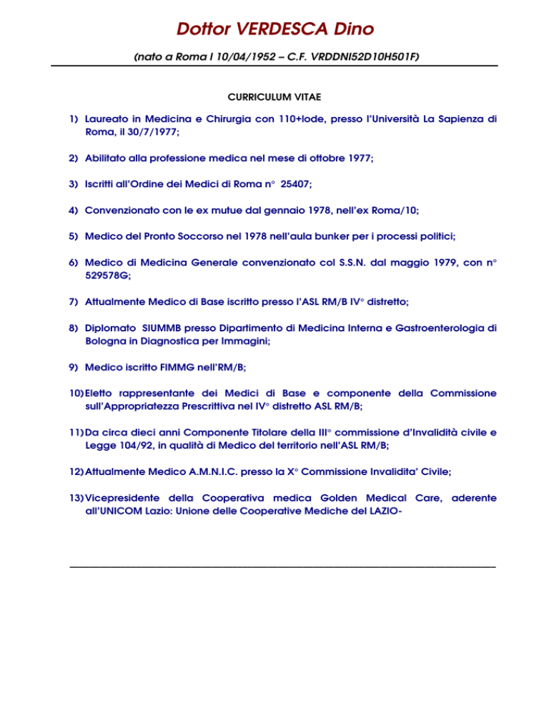 Dottor VERDESCA Dino (nato a Roma l 10/04/1952 – C.F. VRDDNI52D10H501F) CURRICULUM VITAE 1) Laureato in Medicina e Chirurgia con 110+lode, presso l’Università La Sapienza di Roma, il 30/7/1977; 2) Abilitato alla professione medica nel mese di ottobre 1977; 3) Iscritti all’Ordine dei Medici di Roma n° 25407; 4) Convenzionato con le ex mutue dal gennaio 1978, nell’ex Roma/10; 5) Medico del Pronto Soccorso nel 1978 nell’aula bunker per i processi politici; 6) Medico di Medicina Generale convenzionato col S.S.N. dal maggio 1979, con n° 529578G; 7) Attualmente Medico di Base iscritto presso l’ASL RM/B IV° distretto; 8) Diplomato SIUMMB presso Dipartimento di Medicina Interna e Gastroenterologia di Bologna in Diagnostica per Immagini; 9) Medico iscritto FIMMG nell’RM/B; 10) Eletto rappresentante dei Medici di Base e componente della Commissione sull’Appropriatezza Prescrittiva nel IV° distretto ASL RM/B; 11) Da circa dieci anni Componente Titolare della III° commissione d’Invalidità civile e Legge 104/92, in qualità di Medico del territorio nell’ASL RM/B; 12) Attualmente Medico A.M.N.I.C. presso la X° Commissione Invalidita’ Civile; 13) Vicepresidente della Cooperativa medica Golden Medical Care, aderente all’UNICOM Lazio: Unione delle Cooperative Mediche del LAZIO- ____________________________________________________________________________________