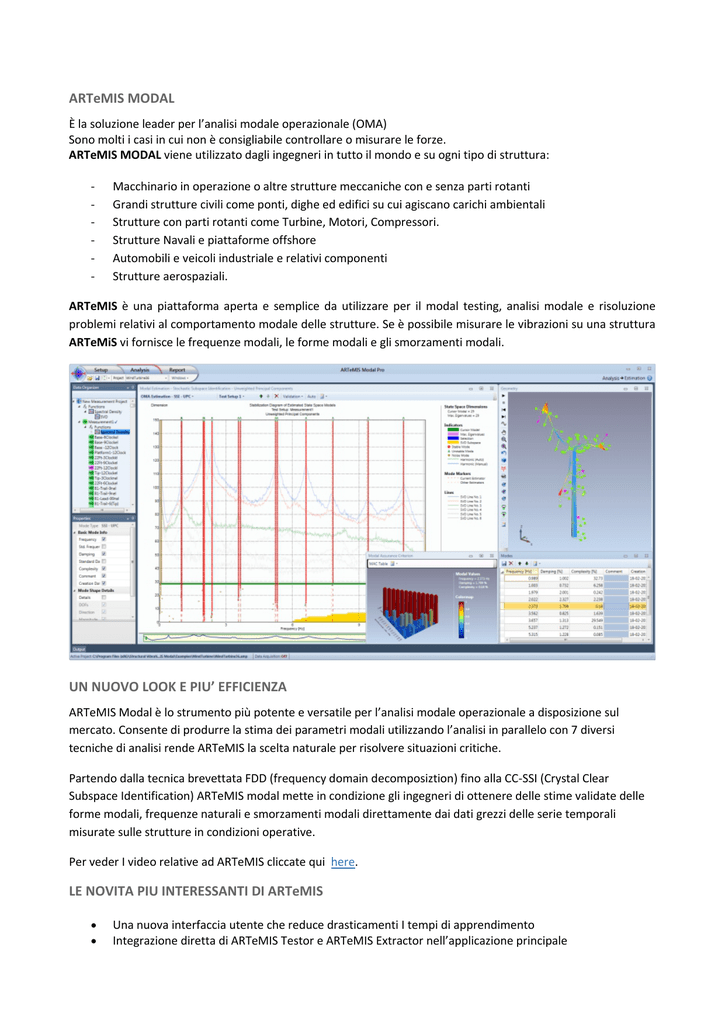 ARTeMIS MODAL È la soluzione leader per l’analisi modale operazionale (OMA) Sono molti i casi in cui non è consigliabile controllare o misurare le forze. ARTeMIS MODAL viene utilizzato dagli ingegneri in tutto il mondo e su ogni tipo di struttura: - Macchinario in operazione o altre strutture meccaniche con e senza parti rotanti Grandi strutture civili come ponti, dighe ed edifici su cui agiscano carichi ambientali Strutture con parti rotanti come Turbine, Motori, Compressori. Strutture Navali e piattaforme offshore Automobili e veicoli industriale e relativi componenti Strutture aerospaziali. ARTeMIS è una piattaforma aperta e semplice da utilizzare per il modal testing, analisi modale e risoluzione problemi relativi al comportamento modale delle strutture. Se è possibile misurare le vibrazioni su una struttura ARTeMiS vi fornisce le frequenze modali, le forme modali e gli smorzamenti modali. UN NUOVO LOOK E PIU’ EFFICIENZA ARTeMIS Modal è lo strumento più potente e versatile per l’analisi modale operazionale a disposizione sul mercato. Consente di produrre la stima dei parametri modali utilizzando l’analisi in parallelo con 7 diversi tecniche di analisi rende ARTeMIS la scelta naturale per risolvere situazioni critiche. Partendo dalla tecnica brevettata FDD (frequency domain decomposiztion) fino alla CC-SSI (Crystal Clear Subspace Identification) ARTeMIS modal mette in condizione gli ingegneri di ottenere delle stime validate delle forme modali, frequenze naturali e smorzamenti modali direttamente dai dati grezzi delle serie temporali misurate sulle strutture in condizioni operative. Per veder I video relative ad ARTeMIS cliccate qui here. LE NOVITA PIU INTERESSANTI DI ARTeMIS • • Una nuova interfaccia utente che reduce drasticamenti I tempi di apprendimento Integrazione diretta di ARTeMIS Testor e ARTeMIS Extractor nell’applicazione principale • • • • • Signal processing e analisi modale molto più semplice e veloce Nuove opzioni per per la stima dei parametric modali Generazione Report tramite intergrazione diretta con i prodotti Microsoft Office Word Additional plugin modules per acquisizione dati, Analisi Drift e Damage Detection. Al seguente link tutte le nuove caratteristiche complete list of new features. CARATTESTICHE PRINCIPALI • • • • • • • • • • • • • • Test In-Situ delle strutture con i vincoli reali Ambiente Naturale Con le forze di eccitazione reali anche in presenza di segnali deterministici (armoniche) Test nelle condizioni di esercizio – Nessuna necessità di fermo macchina- incremento della produttività Utilizzo delle forze operative non è necessario inserire forze di eccitazione nella struttura. I risultanti parametri modali descrivono lo stato reale di servizio della struttura Può essere utilizzato su strutture piccole o grandi senza limiti di dimensioni Software scalabile – Il numero di sensori e punti di misura è illimitato Si possono gestire setup multipli e punti di riferimento multipli per incrementare la stima delle forme modali Risultati veloci ed in automatico – grande risparmio di tempo. Interfaccia utente facile – nuovi utenti e vecchi leoni dell’analisi modale saranno stupiti dai tempi e modi di ottenimento dei risultati Versatile - Una volta misurata la vibrazione ARTeMIS vi da la risposta sul comportamento dinamico della struttura Aperto alle principali fonti di formati di file in circolazione Risultati eccellenti – Basati su più analisi parallele per garantire il massimo di accuratezza. I risultati possono essere utilizzati direttamente dai programmi di FE Updating