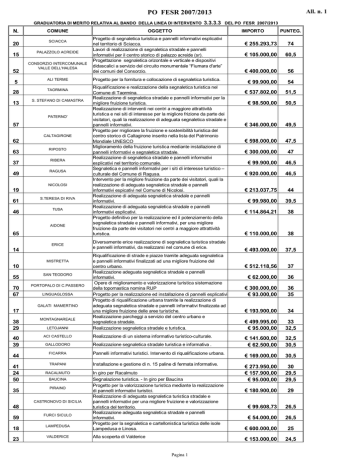 All. n. 1 PO FESR 2007/2013 GRADUATORIA DI MERITO RELATIVA AL BANDO DELLA LINEA DI INTERVENTO N. 20 15 52 5 28 13 COMUNE SCIACCA PALAZZOLO ACREIDE CONSORZIO INTERCOMUNALE VALLE DELL'HALESA ALI TERME TAORMINA S. STEFANO DI CAMASTRA PATERNO' 57 CALTAGIRONE 62 63 37 49 RIPOSTO RIBERA RAGUSA NICOLOSI 19 61 46 S.TERESA DI RIVA TUSA AIDONE 65 ERICE 14 MISTRETTA 10 55 70 67 SAN TEODORO PORTOPALO DI C.PASSERO LINGUAGLOSSA GALATI MAMERTINO 17 38 29 40 39 44 41 24 50 35 MONTAGNAREALE LETOJANNI 23 Progetto per la fornitura e collocazione di segnaletica turistica. Riqualificazione e realizzazione della segnaletica turistica nel Comune di Taormina. Realizzazione di segnaletica stradale e pannelli informativi per la migliore fruizione turistica. Realizzazione di interventi nei centri a maggiore attrattività turistica e nei siti di interesse per la migliore frizione da parte dei visitatori, quali la realizzazione di adeguata segnaletica stradale e pannelli informativi. Progetto per migliorare la fruizione e sostenibilità turistica del centro storico di Caltagirone inserito nella lista del Patrimonio Mondiale UNESCO Miglioramento della fruizione turistica mediante installazione di pannelli informativi e segnaletica stradale. Realizzazione di segnaletica stradale e pannelli informativi esplicativi nel territorio comunale. Segnaletica e pannelli informativi per i siti di interesse turistico – culturale del Comune di Ragusa. Intervento per la migliore fruizione da parte dei visitatori, quali la realizzazione di adeguata segnaletica stradale e pannelli informativi espicativi nel Comune di Nicolosi. Realizzazione di adeguata segnaletica stradale e pannelli informativi. Realizzazione di adeguata segnaletica stradale e pannelli informativi esplicativi. Progetto definitivo per la realizzazione ed il potenziamento della segnaletica stradale e pannelli informativi, per una migliore fruizione da parte dei visitatori nei centri a maggiore attrattività turistica. Diversamente erice realizzazione di segnaletica turistica stradale e pannelli informativi, da realizzarsi nel comune di erice. Riqualificazione di strade e piazze tramite adeguata segnaletica e pannelli informativi finalizzati ad una migliore fruizione del centro urbano. Realizzazione adeguata segnaletica stradale e pannelli informativi. Opere di miglioramento e valorizzazione turistica sistemazione della topomastica nomina RUP Progetto per la realizzazione ed installazione di pannelli esplicativi. Progetto di riqualificazione urbana tramite la realizzazione di adeguata segnaletica stradale e pannelli informativi finalizzata ad una migliore fruizione delle aree turistiche. Realizzazione parcheggi a servizio del centro urbano e segnaletica stradale. Realizzazione segnaletica stradale e turistica. Realizzazione di un sistema informativo turistico-culturale. GALLODORO Realizzazione segnaletica stradale turistica e informativa . IMPORTO PUNTEG. € 255.293,73 74 € 105.000,00 60,5 € 400.000,00 56 € 99.900,00 54 € 537.802,00 51,5 € 98.500,00 50,5 € 346.000,00 49,5 € 598.000,00 47,5 € 300.000,00 47 € 99.900,00 46,5 € 920.000,00 46,5 € 213.037,75 44 € 99.980,00 39,5 € 114.864,21 38 € 110.000,00 38 € 493.000,00 37,5 € 512.118,56 37 € 62.000,00 36 € 300.000,00 € 93.000,00 36 35 € 193.900,00 34 € 499.995,00 € 95.000,00 33 32,5 € 141.600,00 € 62.500,00 32,5 30,5 FICARRA Pannelli informativi turistici. Intervento di riqualificazione urbana. € 169.000,00 30,5 TRAPANI Installazione e gestione di n. 15 paline di fermata informative. € 273.950,00 € 157.900,00 € 95.000,00 30 29,5 29,5 € 180.900,00 29 € 99.608,73 26,5 € 54.000,00 26,5 € 600.000,00 25 € 153.000,00 24,5 RACALMUTO BAUCINA PIRAINO CASTRONOVO DI SICILIA 18 DEL PO FESR 2007/2013 Progetto di segnaletica turistica e pannelli informativi esplicativi nel territorio di Sciacca. Lavori di realizzazione di segnaletica stradale e pannelli informativi per il centro storico di palazzo acreide (sr). Progettazione segnaletica orizontale e verticale e dispositivi didascalici a servizio del circuito monumentale “Fiumara d'arte” dei comuni del Consorzio. ACI CASTELLO 48 59 3.3.3.3 OGGETTO FURCI SICULO LAMPEDUSA VALDERICE In giro per Racalmuto Segnalazione turistica. - In giro per Baucina Progetto per la valorizzazione turistica mediante la realizzazione di pannelli informativi turistici. Realizzazione di adeguata segnaletica turistica stradale e pannelli informativi per una migliore fruizione e valorizzazione turistica del territorio. Realizzazione adeguata segnaletica stradale e pannelli informativi. Progetto per la segnaletica e cartellonistica turistica delle isole Lampedusa e Linosa. Alla scoperta di Valderice Pagina 1 All. n. 1 PO FESR 2007/2013 47 6 BROLO CORLEONE CASALVECCHIO SICULO 9 25 32 CASTELLAMMARE DEL GOLFO SAN BIAGIO PLATANI SALAPARUTA 33 36 64 CALATAFIMI SEGESTA ADRANO PARTANNA 31 BALESTRATE 11 TORTORICI 69 3 43 GIARRE CASTELVETRANO CASTELMOLA 56 MANDANICI 54 58 MONGIUFFI MELIA SAVOCA 8 1 ALCARA LI FUSI 2 TRIPI SALEMI 4 7 16 21 22 ACI BONACCORSI PROV.REG,DI PALERMO NIZZA DI SICILIA ZAFFERANA ETNEA 27 SAN MARCO DA LUNZIO 30 TROINA LICATA 34 COMITINI 42 S. AGATA DI MILITELLO 45 51 53 60 66 CATANIA FRANCOFONTE LIPARI TORRENOVA Valorizzazione turistica mediante la realizzazione di pannelli informativi turistici. Progetto per la creazione di percorsi turistici e tematici e relativa segnaletica “ in giro per corleone”.” Progetto definitivo alla segnaletica direzionale ed informativa coordinata nel territorio del comune di casalvecchio siculo. Collocazione di adeguata segnaletica stradale e pannelli informativi.. In giro per San Biagio Platani Lavori di realizzazione di adeguata segnaletica stradale e pannelli informativi meglio denominata “progetto di segnaletica turistica2 2In Giro per Salaparuta”. Progetto di segnaletica turistica “In giro per Calatafimi Segesta. Approvazione progetto definitivo di segnaletica turistica (direzionale
