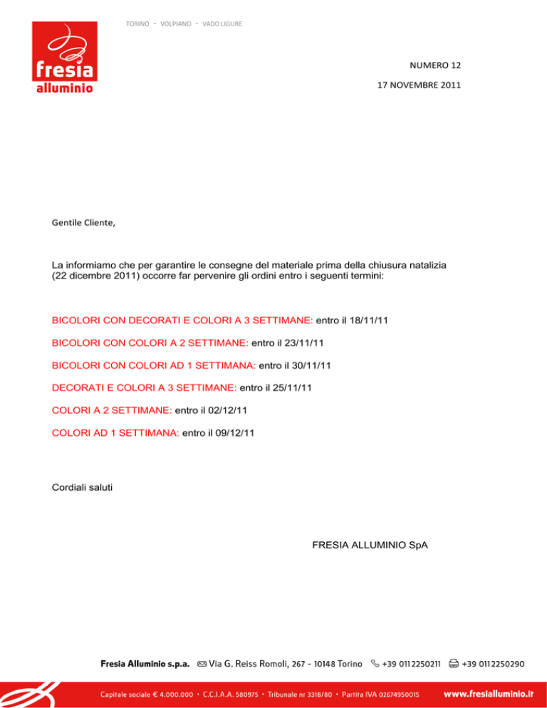 NUMERO 12 17 NOVEMBRE 2011 Gentile Cliente, La informiamo che per garantire le consegne del materiale prima della chiusura natalizia (22 dicembre 2011) occorre far pervenire gli ordini entro i seguenti termini: BICOLORI CON DECORATI E COLORI A 3 SETTIMANE: entro il 18/11/11 BICOLORI CON COLORI A 2 SETTIMANE: entro il 23/11/11 BICOLORI CON COLORI AD 1 SETTIMANA: entro il 30/11/11 DECORATI E COLORI A 3 SETTIMANE: entro il 25/11/11 COLORI A 2 SETTIMANE: entro il 02/12/11 COLORI AD 1 SETTIMANA: entro il 09/12/11 Cordiali saluti FRESIA ALLUMINIO SpA