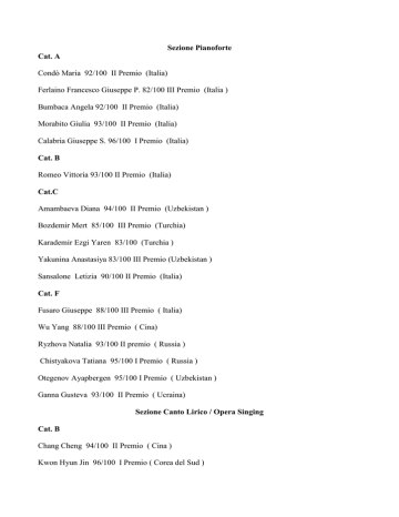 Sezione Pianoforte Cat. A Condò Maria 92/100 II Premio (Italia) Ferlaino Francesco Giuseppe P. 82/100 III Premio (Italia ) Bumbaca Angela 92/100 II Premio (Italia) Morabito Giulia 93/100 II Premio (Italia) Calabria Giuseppe S. 96/100 I Premio (Italia) Cat. B Romeo Vittoria 93/100 II Premio (Italia) Cat.C Amambaeva Diana 94/100 II Premio (Uzbekistan ) Bozdemir Mert 85/100 III Premio (Turchia) Karademir Ezgi Yaren 83/100 (Turchia ) Yakunina Anastasiya 83/100 III Premio (Uzbekistan ) Sansalone Letizia 90/100 II Premio (Italia) Cat. F Fusaro Giuseppe 88/100 III Premio ( Italia) Wu Yang 88/100 III Premio ( Cina) Ryzhova Natalia 93/100 II premio ( Russia ) Chistyakova Tatiana 95/100 I Premio ( Russia ) Otegenov Ayapbergen 95/100 I Premio ( Uzbekistan ) Ganna Gusteva 93/100 II Premio ( Ucraina) Sezione Canto Lirico / Opera Singing Cat. B Chang Cheng 94/100 II Premio ( Cina ) Kwon Hyun Jin 96/100 I Premio ( Corea del Sud ) Cat. C Ferraro Maria 82/100 III Premio ( Italia) Manulik Natalia 84/100 III Premio ( Russia ) Li Wai Yin 85/100 III Premio ( Giappone ) Lee Deok Ki 93/100 II Premio ( Corea del Sud ) Choi Sin Min 93/100 II premio ( Corea del Sud) Sezione Chitarra / Guitar Cat. A Varrese Francesco 88/100 III Premio ( Italia) Cat. B Grenci Anita 92/100 II Premio ( Italia ) Cat. C Barillaro Emanuele 90/100 II Premio ( Italia) Teti Stefano 80/100 III Premio ( Italia) Cat. D Failla Josef 82/100 III Premio ( Italia) Cat. E Pirronne Mattia 92/100 II Premio (Italia) Walidani Birul 80/100 III Premio ( Indonesia ) Sezione Fisarmonica/ Accordion Cat. B Servidio Claudia 96/100 I Premio ( italia ) Cat. D Palena Giancarlo 98/100 Primo Premio Assoluto ( Italia ) Cat. C Kayumova Aygerim 96/100 I Premio ( Uzbekistan ) Sezione Arpa / Harp Cat. C Vilimaite Liucile 98/100 Primo Premio Assoluto ( Lituania ) Cat. F Segeeva Nadezda 100/100 Premio Speciale Paolo Serrao ( Russia ) Sezione Archi / Strings Cat. A Gambardella Giada 88/100 III Premio cello ( Italia ) Cat. B Nurmatova Kamila 93/100 II Premio violino ( Uzbekistan ) Cat. C Sanguinetti Giulia 85/100 III Premio cello ( Italia ) Fanslau Adrianna 96/100 I Premio violino ( Polonia ) Cat. D Aliyev Rashid 88/100 III Premio violino ( Arzebaijan) Pawell Debski 97/100 I Premio violino ( Polonia ) Cat. E Nowak Michael 100/100 Premio Specile Paolo Serrao violino ( Polonia) Krupa Ewelina Oliwia 85/100 III premio violino ( Polonia ) Kwon Oh Hyun 99/100 I Premio Assoluto viola ( Corea del Sud ) Cat F Radomska Kornelia 85/100 III Premio violino ( Polonia ) Lee Minkyung 92/100 II premio violino ( Corea del Sud ) Sezione Fiati / Woodwind Cat. A Shuvalov Mikhail 96/100 I premio flauto ( Russia ) Cat. D Andrey Sannikov 98/100 I Premio Assoluto ( Russia ) Sawicki Mateusz 95/100 I Premio sax ( Polonia ) Cat. E Mandaliti Federica 90/100 II Premio flauto ( Italia ) Furciniti Domenico 90/100 II premio clarinetto ( italia ) Cat. F Bacher Veronica 80/100 III Premio clarinetto ( Polonia ) Przbylska Julita 97/100 I premio sax ( Polonia ) Sezione Musica da Camera /Chamber Music Cat. A Duo Quattromani Sulaeva/Shatrova 96/100 I Premio ( Russia ) Duo Quattro mani Epifanova E./ Epifanova M . 95/100 I Premio ( Russia ) Cat. B Trio Strings Poland 94/100 II Premio ( Polonia ) Cat. C Duo Koroteeva/Chestnova 88/100 III premio ( Russia ) Blueberry Trio 96/100 I Premio ( Polonia ) Cat. D Sforzando Guitar Quartet 80/100 III Premio ( Indonesia ) Duo Sannikov/Nadzda 90/100 II Premio ( Russia ) Sezione Brass band Cat. A Oberaagaguer Brass Band 90/100 I Premio Assoluto ( Svizzera ) Sezione Brass Wind Cat. B Associazione Bandistica F. Malfarà 96/100 I Premio ( Italia )