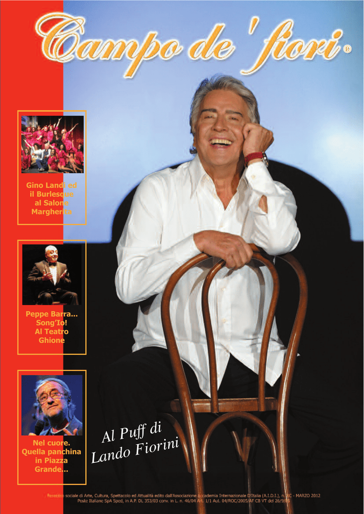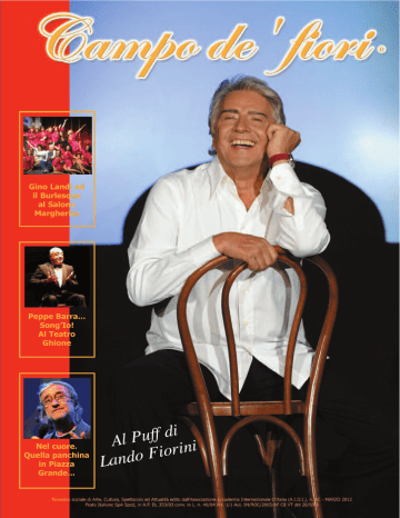 Gino Landi ed il Burlesque al Salone Margherita Peppe Barra... Song’Io! Al Teatro Ghione Nel cuore. Quella panchina in Piazza Grande... di f f u P l A ni i r o i F Lando Campo de’ fiori 2 SOMMARIO Editoriale: Pasqua, la coscienza e la speranza............3 L’intervista: Al Puff di Lando Fiorini, lo stivale è in mutande...............................................4-5 Gino Landi ed il Burlesque...................6 Curriculum vitae: Giulia Di Quilio.........................................8 Stefano Principalli: una vita in prima fila........................................................10 Roma che se n’è andata: Gregorio XVI, il Papa del Belli.............12-13 Suonare Suonare: Peppe Barra... “Song’Io”..........................14 Dentifricio, una panacea assai economica.................................................17 Ecologia e ambiente: Ritrovare un giusto equilibrio...................18 Il Fumetto: The breaker............................................21 Non c’è fede senza conoscenza; non c’è conoscenza senza fede.................22 Il mondo della comunicazione elevato alla potenza QR...................................23 Come eravamo: Lòpole, spargi, raponzoli e caccialepri....25 Agostino Paradisi................................26 Attenti al fisco: Ancora sui nuovi limiti all’utilizzo del contante: aspetti sanzionatori e casi di esclusione......................................................27 Ass. Artistica Iuna: Miglior Maestro dell’anno 2012 per Eraldo Bigarelli..................................................28 Civita Castellana ovvero Phalerium Argivum...............................................30 La rubrica dei cognomi.......................35 Per ricordare Silvia Quattrini Ferrelli.36 Angolo Bon Ton: Pasqua di speranza.................................37 News..........................................38-39-40 Una “Fabrica di ricordi”: Oh dolce primavera.................................41 Pronto per il Campionato Italiano Seat Ibiza Cup.............................................42 Cine Parade: In mio angolo di Paradiso........................43 Le storie di Max: Lucio Dalla.............................................44 In memoria del Prof. Luigi Paolelli....45 Raccolti per l’A.T.A.M.O. 1.145,40 , grazie al Calendario 2012...................46 SOSIA...................................................46 Agenda.................................................47 Nel cuore.........................................48-49 I nostri amici.......................................50 Messaggi..............................................51 Oroscopo .............................................52 Roma com’era.....................................53 Album dei ricordi.........54-55-56-57-58-59 Annunci gratuiti..............................60-61 Selezione offerte immobiliari .......62-63 Foto di Elisa Moretti SEGUITECI ANCHE SU FACEBOOK!!!!!! VI TERREMO AGGIORNATI SULLE NOVITA’ DELLA RIVISTA CHE AMATE DI PIU’!!! Anche tramite il nostro sito www.campodefiori.biz I NOSTRI RECAPITI UTILI SEDE OPERATIVA: PIAZZA DELLA LIBERAZIONE, 2 - CIVITA CASTELLANA (VT) TEL/FAX 0761.513117 - [email protected] SEDE RAPPRESENTATIVA : VIALE MAZZINI, 140 - ROMA Siate protagonisti della rivista che amate di più!!! Campo de’ fiori Pasqua, la coscienza e la speranza A di Sandro Anselmi ugurare la buona Pasqua a tutti è quanto di più spontaneo e vero possa scaturire dal mio cuore, ma avere coscienza del particolare momento e desiderare di rafforzare il mio augurio per potergli dare una maggiore valenza, è quanto mai vorrei mi fosse possibile. La speranza tenace ed eterna premierà certo la nostra incondizionata devozione alla vita, e gli obiettivi perché essa sia serena, prospera e felice, saranno raggiunti! Non è la mia una profezia che, nel tema sacrale della Pasqua, osi, ma una concreta volontà di arrivare all’ambito traguardo. La meta, a volte lontana in una società di sciocchi, inetti, di persone di malaffare, non è poi irraggiungibile! Occorrono equi e saggi, che sappiano costruire e non distruggere, e così, dopo la Passione verrà la Resurrezione! Auguri di una Santa Pasqua a tutti! 3 Campo de’ fiori 4 “Da questa crisi ne usciremo solo nel 2014 e con le ossa rotte... Lavoro più adesso che quando ero giovane, per i miei quaranta dipendenti!” Al Puff di Lando Fiorini, lo stivale è in mutande Quarantaquattro anni di grandi successi. “Il segreto è la sincerità verso il pubblico”. zione economica della nostra povera Italia. Ad accoglierci, oltre alla solita graditissima cortesia, il sorriso smagliante di Lando, sempre in gran forma, che ci conduce nel suo accogliente studio-camerino, con due immancabili rose fresche sulla scrivania, per la nostra intervista, che preferisco, però, chiamare “amichevole chiacchierata”, grazie alla cordialità di Lando. E ’ con immenso piacere che, anche quest’anno, torniamo nel cuore di Roma per incontrare uno dei più grandi amici della nostra rivista: Lando Fiorini. Proprio il suo rinomatissimo locale è diventato, ormai, uno dei maggiori punti di distribuzione di Campo de’ fiori, per tutti i suoi numerossissimi clienti e non solo. Quest’anno il palco del Puff offre ai suoi spettatori un altro esilarante spettacolo, dal titolo “Lo stivale in mutande”, che ironizza e sdrammatizza sulla pesante situa- Veniamo subito allo spettacolo di questa stagione teatrale del Puff. Cosa ci dice? Ma, credo che già il titolo dica tutto! Stiamo affrontando un momento critico, l’Italia è veramente in mutande e nello spettacolo ironizziamo, ad esempio, sul fatto che Belen a Sanremo se le sia tolte. Tra una battuta e l’altra prendiamo di mira un po’ tutti, al di là del colore politico. Benchè abbia le mie idee da libero cittadino, non ho mai voluto portarle sul palco. Certo, il cambio di governo, appena dopo l’inizio della nuova stagione teatrale, ci ha creato non pochi problemi! Abbiamo dovuto apportare qua