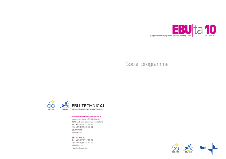 9-11 June 2010 Social programme European Broadcasting Union (EBU) L’Ancienne-Route 17A, PO Box 45 1218 Le Grand-Saconnex, Switzerland Tel: +41 (0)22 717 21 11 Fax:+41 (0)22 747 40 00 [email protected] www.ebu.ch EBU TECHNICAL Tel: +41 (0)22 717 27 05 Fax:+41 (0)22 747 47 05 [email protected] http://tech.ebu.ch Social programme for Delegates and Accompanying Persons Social Programme for Accompanying Persons Only Wednesday 9 June Thursday 10 June 19.45 Departure to Palazzo Madama from Hotels 20.00 EBU TECHNICAL Welcome Cocktail at the Palazzo Madama (Sala del Voltone) 21.30 Return to Hotels ä On foot (individually) ä On foot (individually) Thursday 10 June 18.15 Departure to Palazzo Cisterna from Hotels 18.30–19.30 Gala cocktail at the Palazzo Cisterna ä On foot (individually) 20.00 Theatre Carignano Gala Evening: Opera Manfred ä On foot (as a group) 22.00 Return to Hotels ä On foot (individually) Delegates (and accompanying persons who wish to see 3D World Cup Football Match): Departure from Majestic Hotel to Lingotto Pathé cinema 16.00–18.00 3D World Cup Football Match at Lingotto Pathé cinema ä By bus Departure from Lingotto Pathé cinema to Majestic Hotel Departure from Majestic Hotel to Venaria Reale ä By bus Or Option 2 18.00 18.30 Departure from Lingotto Pathé cinema to Venaria Reale Venaria Reale Exhibition 20.00 EBU Technical Assembly Gala Dinner at the Venaria Reale 23.00 Return to Majestic Hotel 09.10–13.00 Guided Visit to Palazzo Reale and Palazzo Madama 13.00–14.30 Free lunch break 14.30 Departure from Majestic Hotel 15.15–16.45 Guided Tour to Castello di Racconigi 17.00 Return to Majestic Hotel ä On foot (as a group) ä By bus ä By bus 09.30 Departure from Majestic Hotel 10.00–12.00 Guided Visit of “Terrazza and Museum” Martini&Rossi” at Pessione (near Turin) 12.00–12.30 Aperitif at Pessione 12.30–13.20 Return to Majestic Hotel ä By bus ä By bus Either Option 1: Turin tour & shopping Either Option 1 18.00 19.15 Departure from Majestic Hotel Friday 11 June Friday 11 June 15.30 08.40 ä By bus ä By bus Saturday 12 June ä On foot (as a group) 08.30 Departure from Majestic Hotel 09.00–13.00 Visit of the Egyptian Museum, Cinema Museum, Mole Antonelliana 13.00* * Return to Majestic for luggage pick-up and transfer from Turin to Sandro Pertini (Caselle) International Airport. On request at registration: transfer to Malpensa International Airport and Linate International Airport 13.00–14.30 Lunch at the restaurant Baratti&Milano 14.30 Departure to “Sacra di San Michele” from Piazza Castello (Baratti) 15.30–17.00 Guided tour of “Sacra di San Michele” 17.00 Return to Majestic Hotel ä By bus 18.30* * Transfer from Majestic Hotel, to Turin Sandro Pertini (Caselle) International Airport only ä By bus ä By bus * Delegates with a return transfer organized by RAI on Saturday should leave their luggage at the Majestic Hotel. ä On foot (as a group) 14.30 Departure from Majestic Hotel 14.30–16.30 Guided Tour to the main Turin Squares and free shopping time 16.30 Return to Hotels ä On foot (individually) 19.15 Departure from Majestic Hotel for evening programme (to Venaria Reale) ä By bus Or Option 2: 3D Football Match 15.30 Departure from Majestic Hotel to Lingotto Pathé cinema for 3D football match ä By bus 18.00 Departure from Lingotto Pathé cinema (either leaving directly to Venaria Reale for extended programme followed by dinner or return to Majestic Hotel before leaving for dinner at Venaria Reale) ä By bus