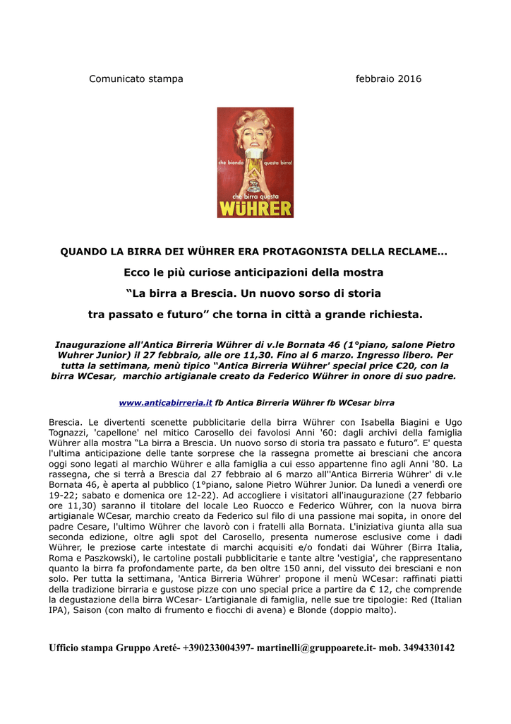 Comunicato stampa febbraio 2016 QUANDO LA BIRRA DEI WÜHRER ERA PROTAGONISTA DELLA RECLAME... Ecco le più curiose anticipazioni della mostra “La birra a Brescia. Un nuovo sorso di storia tra passato e futuro” che torna in città a grande richiesta. Inaugurazione all'Antica Birreria Wührer di v.le Bornata 46 (1°piano, salone Pietro Wuhrer Junior) il 27 febbraio, alle ore 11,30. Fino al 6 marzo. Ingresso libero. Per tutta la settimana, menù tipico “Antica Birreria Wührer' special price €20, con la birra WCesar, marchio artigianale creato da Federico Wührer in onore di suo padre. www.anticabirreria.it fb Antica Birreria Wührer fb WCesar birra Brescia. Le divertenti scenette pubblicitarie della birra Wührer con Isabella Biagini e Ugo Tognazzi, 'capellone' nel mitico Carosello dei favolosi Anni '60: dagli archivi della famiglia Wührer alla mostra “La birra a Brescia. Un nuovo sorso di storia tra passato e futuro”. E' questa l'ultima anticipazione delle tante sorprese che la rassegna promette ai bresciani che ancora oggi sono legati al marchio Wührer e alla famiglia a cui esso appartenne fino agli Anni '80. La rassegna, che si terrà a Brescia dal 27 febbraio al 6 marzo all''Antica Birreria Wührer' di v.le Bornata 46, è aperta al pubblico (1°piano, salone Pietro Wührer Junior. Da lunedì a venerdì ore 19-22; sabato e domenica ore 12-22). Ad accogliere i visitatori all'inaugurazione (27 febbario ore 11,30) saranno il titolare del locale Leo Ruocco e Federico Wührer, con la nuova birra artigianale WCesar, marchio creato da Federico sul filo di una passione mai sopita, in onore del padre Cesare, l'ultimo Wührer che lavorò con i fratelli alla Bornata. L'iniziativa giunta alla sua seconda edizione, oltre agli spot del Carosello, presenta numerose esclusive come i dadi Wührer, le preziose carte intestate di marchi acquisiti e/o fondati dai Wührer (Birra Italia, Roma e Paszkowski), le cartoline postali pubblicitarie e tante altre 'vestigia', che rappresentano quanto la birra fa profondamente parte, da ben oltre 150 anni, del vissuto dei bresciani e non solo. Per tutta la settimana, 'Antica Birreria Wührer' propone il menù WCesar: raffinati piatti della tradizione birraria e gustose pizze con uno special price a partire da € 12, che comprende la degustazione della birra WCesar- L’artigianale di famiglia, nelle sue tre tipologie: Red (Italian IPA), Saison (con malto di frumento e fiocchi di avena) e Blonde (doppio malto). Ufficio stampa Gruppo Areté- +390233004397- [email protected] mob. 3494330142