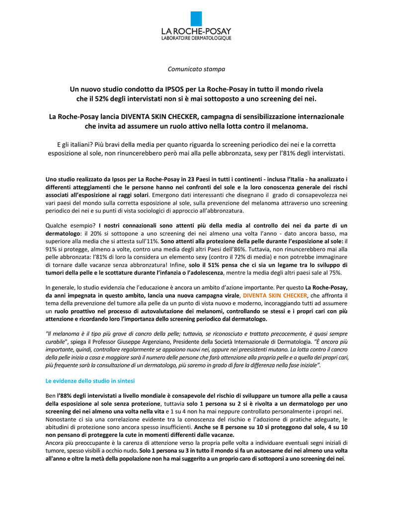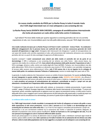 Comunicato stampa Un nuovo studio condotto da IPSOS per La Roche-Posay in tutto il mondo rivela che il 52% degli intervistati non si è mai sottoposto a uno screening dei nei. La Roche-Posay lancia DIVENTA SKIN CHECKER, campagna di sensibilizzazione internazionale che invita ad assumere un ruolo attivo nella lotta contro il melanoma. E gli italiani? Più bravi della media per quanto riguarda lo screening periodico dei nei e la corretta esposizione al sole, non rinuncerebbero però mai alla pelle abbronzata, sexy per l’81% degli intervistati. Uno studio realizzato da Ipsos per La Roche-Posay in 23 Paesi in tutti i continenti - inclusa l’Italia - ha analizzato i differenti atteggiamenti che le persone hanno nei confronti del sole e la loro conoscenza generale dei rischi associati all’esposizione ai raggi solari. Emergono dati interessanti che disegnano il grado di consapevolezza nei vari paesi del mondo sulla corretta esposizione al sole, sulla prevenzione del melanoma attraverso uno screening periodico dei nei e su punti di vista sociologici di approccio all’abbronzatura. Qualche esempio? I nostri connazionali sono attenti più della media al controllo dei nei da parte di un dermatologo: il 20% si sottopone a uno screening dei nei almeno una volta l’anno - dato ancora basso, ma superiore alla media che si attesta sull’11%. Sono attenti alla protezione della pelle durante l’esposizione al sole: il 91% si protegge, almeno a volte, contro una media degli altri Paesi dell’86%. Tuttavia, non rinuncerebbero mai alla pelle abbronzata: l’81% di loro la considera un elemento sexy (contro il 72% di media) e non potrebbe immaginare di tornare dalle vacanze senza abbronzatura! Infine, solo il 51% pensa che ci sia un legame tra lo sviluppo di tumori della pelle e le scottature durante l’infanzia o l’adolescenza, mentre la media degli altri paesi sale al 75%. In generale, lo studio evidenzia che l’educazione è ancora un ambito d’azione importante. Per questo La Roche-Posay, da anni impegnata in questo ambito, lancia una nuova campagna virale, DIVENTA SKIN CHECKER, che affronta il tema della prevenzione del tumore alla pelle da un punto di vista nuovo e moderno, incoraggiando tutti ad assumere un ruolo proattivo nel processo di autovalutazione dei melanomi, controllando se stessi e i propri cari con più attenzione e ricordando loro l’importanza dello screening periodico dal dermatologo. "Il melanoma è il tipo più grave di cancro della pelle; tuttavia, se riconosciuto e trattato precocemente, è quasi sempre curabile", spiega il Professor Giuseppe Argenziano, Presidente della Società Internazionale di Dermatologia. "È ancora più importante, quindi, controllare regolarmente se appaiono nuovi nei, oppure nei preesistenti mutano. La lotta contro il cancro della pelle inizia a casa e maggiore sarà il numero delle persone che farà attenzione alla propria pelle e a quella dei propri cari, più frequente sarà la consultazione di un dermatologo, più saremo in grado di fare la differenza nella fase iniziale”. Le evidenze dello studio in sintesi Ben l’88% degli intervistati a livello mondiale è consapevole del rischio di sviluppare un tumore alla pelle a causa della esposizione al sole senza protezione, tuttavia solo 1 persona su 2 si è rivolta a un dermatologo per uno screening dei nei almeno una volta nella vita e 1 su 4 non ha mai neppure controllato personalmente i propri nei. Nonostante ci sia una correlazione evidente tra la conoscenza del rischio e l’adozione di pratiche adeguate, le abitudini di protezione sono ancora spesso insufficienti. Anche se 8 persone su 10 si proteggono dal sole, 4 su 10 non pensano di proteggere la cute in momenti differenti dalle vacanze. Ancora più preoccupante è la carenza di attenzione verso la propria pelle volta a individuare eventuali segni iniziali di tumore, spesso visibili a occhio nudo. Solo 1 persona su 3 in tutto il mondo si fa un autoesame dei nei almeno una volta all'anno e oltre la metà della popolazione non ha mai suggerito a un proprio caro di sottoporsi a uno screening dei nei. Secondo Laïla Idtaleb, Director of Health Department di IPSOS, “questo studio ha evidenziato alcuni conflitti interni che riguardano gli intervistati: tra la consapevolezza dei rischi di un’esposizione non corretta e il desiderio di prendere il sole, ma anche tra la conoscenza dei segni di un potenziale tumore alla pelle e la reticenza nel sottoporsi sistematicamente e regolarmente a un controllo dei nei, sia in termini di autoesame che presso un dermatologo. L’indagine ha anche dimostrato che il risultato di queste contrapposizioni varia in base ai Paesi, al genere, al gruppo d'età e al livello di istruzione”. E gli Italiani? Siamo attenti più della media al controllo dei nei da parte di un dermatologo: il 20% si sottopone a uno screening dei nei almeno una volta l’anno - dato ancora basso, ma superiore alla media che è dell’11%. Inoltre il 43% controlla con un auto-esame i propri nei almeno una volta l’anno (vs 33%). Gli Italiani si sono dimostrati attenti alla protezione della propria pelle durante l’esposizione al sole, dal momento che il 91% si protegge, almeno a volte, contro un dato medio degli altri paesi dell’86%. La crema solare è lo strumento più utilizzato: la applica regolarmente sul corpo il 75% dei soggetti (contro una media del 59%) e sul volto il 69% (vs. 57%). Utilizzano invece con poca frequenza gli accessori (occhiali da sole, cappello, ecc.), importanti per proteggere pelle e occhi. Gli Italiani non rinuncerebbero mai alla pelle abbronzata: l’81% la considera un elemento sexy (contro il 72% di media) e non potrebbero mai immaginare di tornare dalle vacanze senza abbronzatura! Rispetto agli altri Paesi, gli Italiani hanno un livello minore di conoscenza dei potenziali rischi legati ad una scorretta esposizione al sole: l’82% degli intervistati pensa che la possibilità di sviluppare un melano